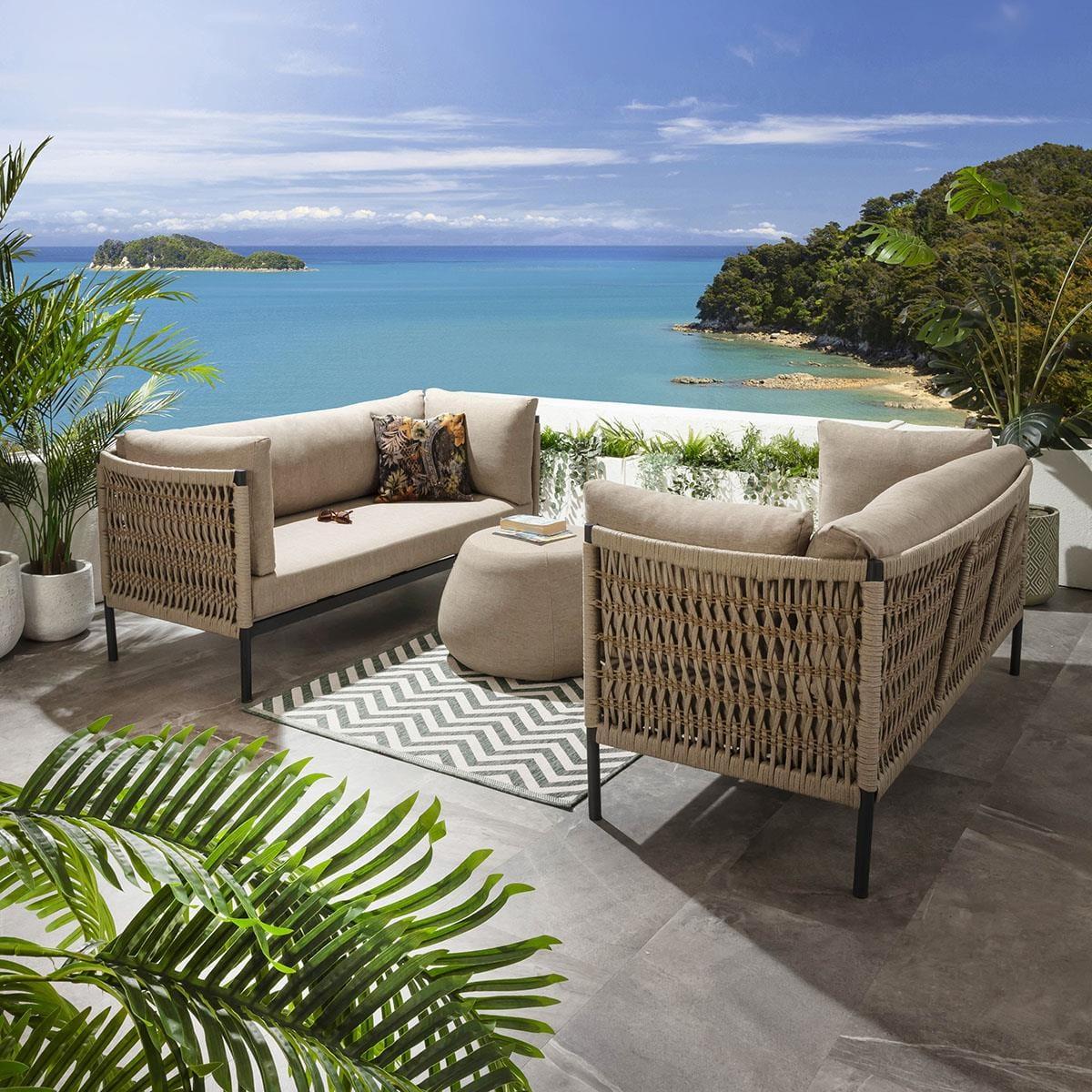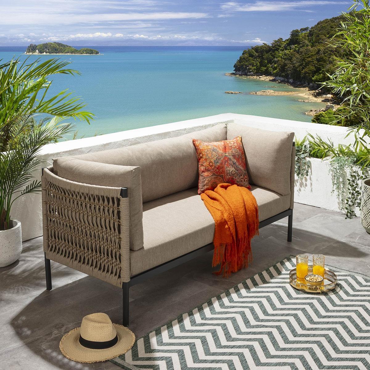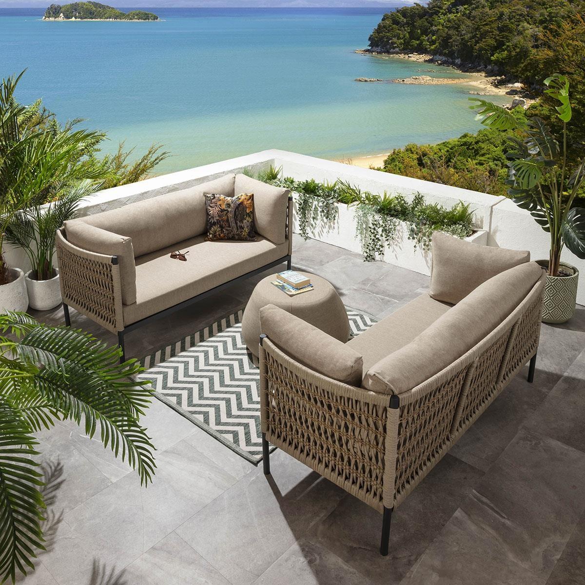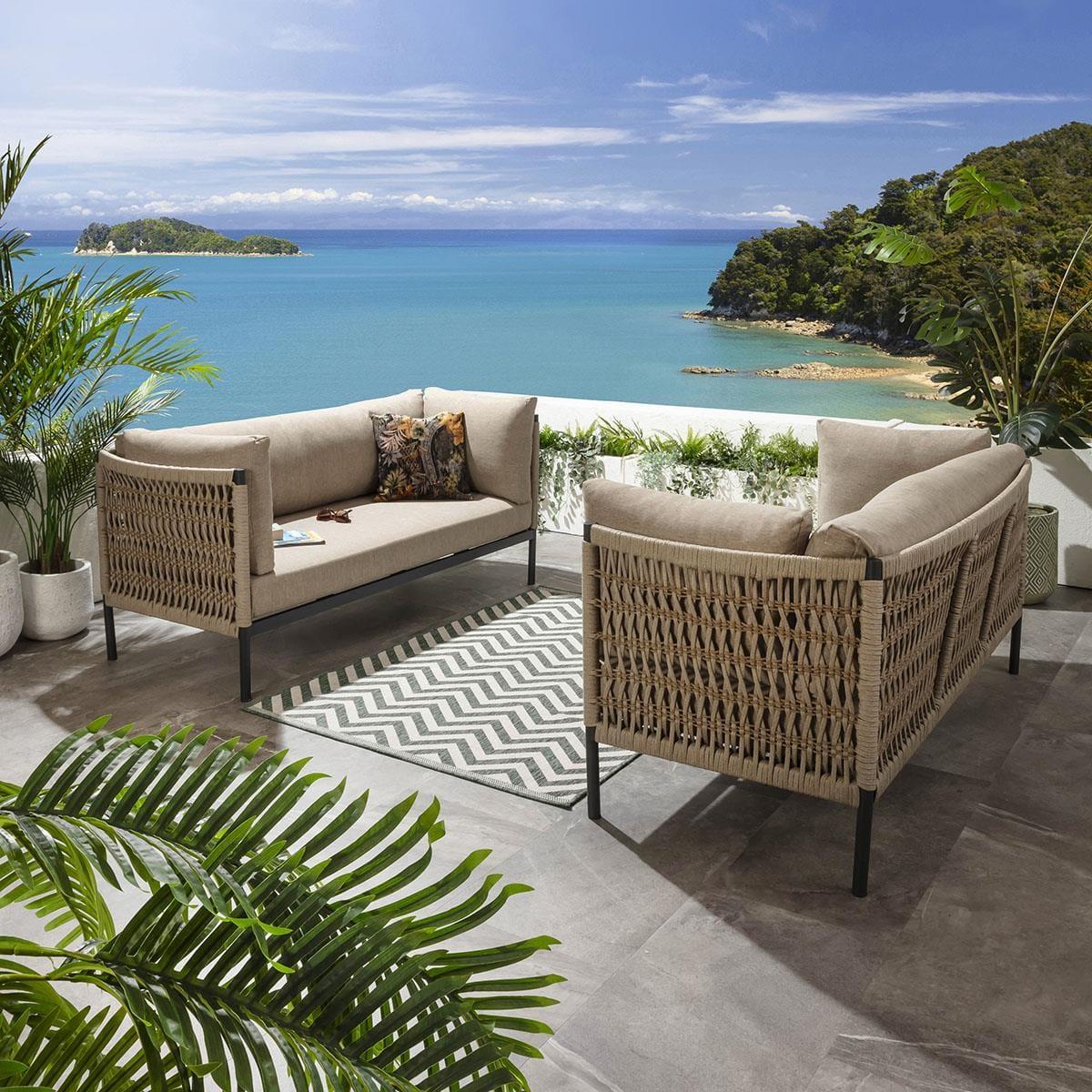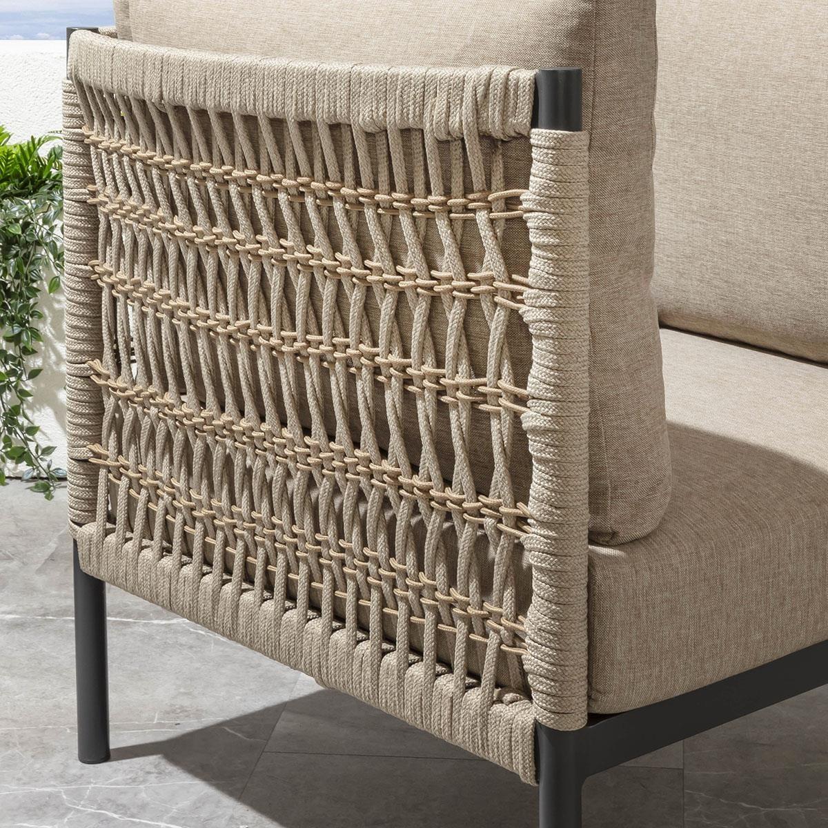 Elevate your outdoor patio with the Bailey 6 seater aluminium garden sofa set. This modern garden sofa set includes two sleek sofas upholstered in beige outdoor fabric with intricate rope weave, offering durability and artisanal charm. Weather covers are included for protection. The Bailey sofa set features a contemporary design with square, cubey shapes, high backs, and sides for a sleek aesthetic. Crafted with full aluminium frames in premium grey paint, adorned with intricate beige rope weave, it offers durability and artisanal charm. The outdoor cushions are crafted with the utmost attention to comfort and durability. Made with luxury foam, they provide plush support for hours of relaxation. Upholstered in a sleek beige outdoor fabric, the cushions seamlessly complement the modern design of the sofa set. Conveniently store your sofa set with the included weather covers for protection against the elements. Sofa Size W180cm D80cm H80cm Seat Height 39cm Set includes 2 sofas Weather covers included