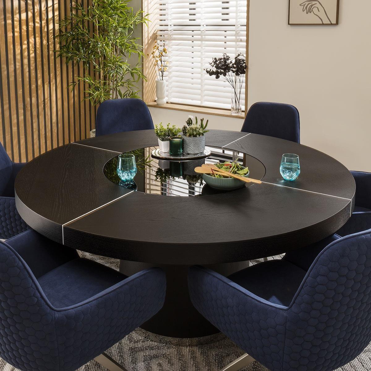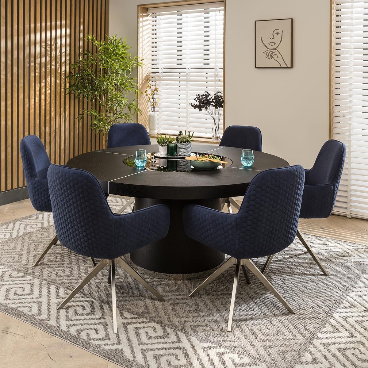 Discover modern dining with this 6 seat dining set, blending the social allure of a round table with the opulence of luxury dining chairs. Captivate your guests with vibrant contrast of the sleek black oak round dining table with a rotating lazy susan, against the 6 dining chairs, upholstered in rich navy blue velvet. This stunning round dining table will effortlessly seat 6 guests. For added convenience, the rotating lazy susan with LED lighting makes for a fun dining experience. Sleek in design, the black oak veneer dining table has a round 160cm top supported by a surdy pedestal base that adds stability for years of enjoyment. Crafted with a simple yet thoughtful outline, the Emma carver dining chairs with arms are designed for comfortable dining. Upholstered in navy velvet that adds a touch of opulence to any setting. The dining room chair features a swivel base with a brushed metal finish for a blend of modern aesthetics and plush comfort. This 6 seater dining set combines modern Emma chairs with the stunning 850. T table. Whether you love the Emma chairs and would like to purchase them individually, or you think the 850. T table would complete your interior scheme better with another chair, you can easily mix and match our modern dining tables and chairs to curate something truly unique. Table Size W160cm D160cm H73cm Chair Size W62cm D62cm H87cm Dining Table And Chair Set For 6