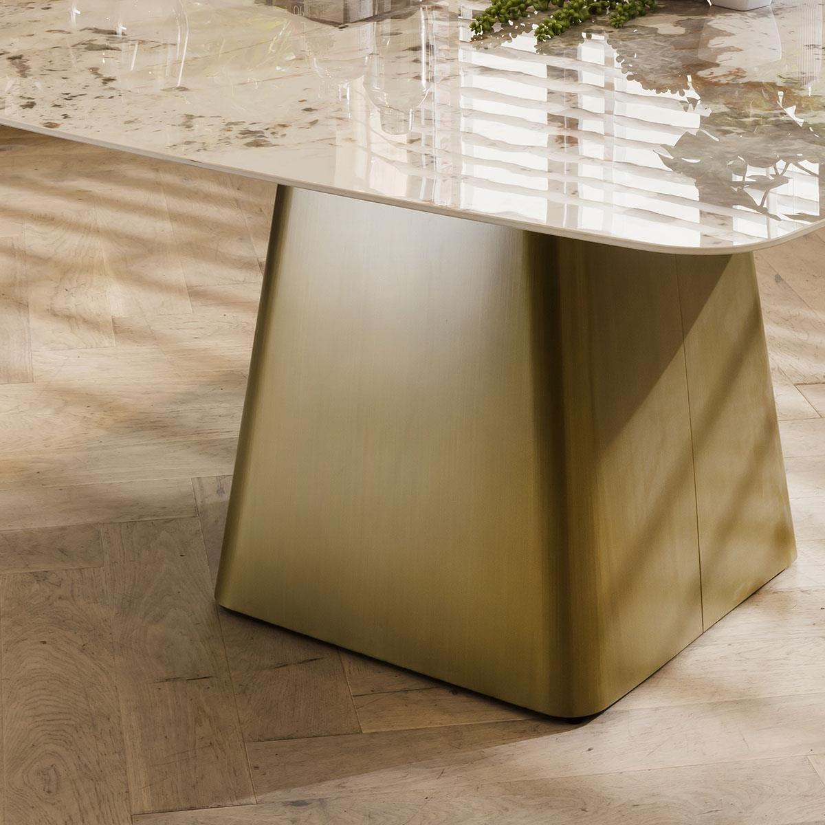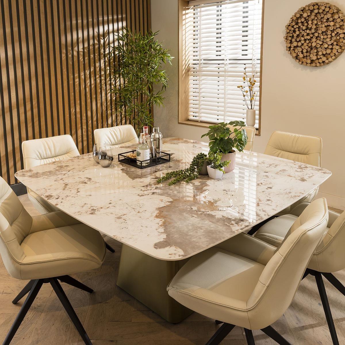 The Olympia 150cm square dining table is crafted with a ceramic table top, the dining table boasts remarkable scratch, stain, and heat resistance, ensuring enduring beauty for years to come. The 8 seater dining table features an elegant cream marble effect finish and pedestal metal base exude sophistication and luxury. Seating up to 8 people comfortably, this square dining table is designed to foster memorable gatherings and intimate family meals. The table's pedestal base features a sturdy metal construction with a brushed bronze finish, adding a touch of opulence and stability. The combination of ceramic and metal not only enhances the table's longevity but also imparts a modern, upscale appeal to your dining area. Whether it's casual brunches or formal dinners, this dining table offers a versatile canvas for your culinary adventures. The 150cm square surface provides ample space for dining essentials, making it an ideal choice for those who appreciate both style and substance. Elevate your dining experience with this ceramic-topped masterpiece and create lasting memories around a table that's as beautiful as it is durable. Incorporate the Olympia 150cm square dining table into your home, and relish in the fusion of sophistication and practicality. With its scratch, stain, and heat-resistant ceramic top, square design, and brushed bronze metal base, this table is a testament to timeless charm and modern durability. W150cm D150cm H75cm Ceramic is scratch, stain and heat resistant 8 Seater Square Dining Table