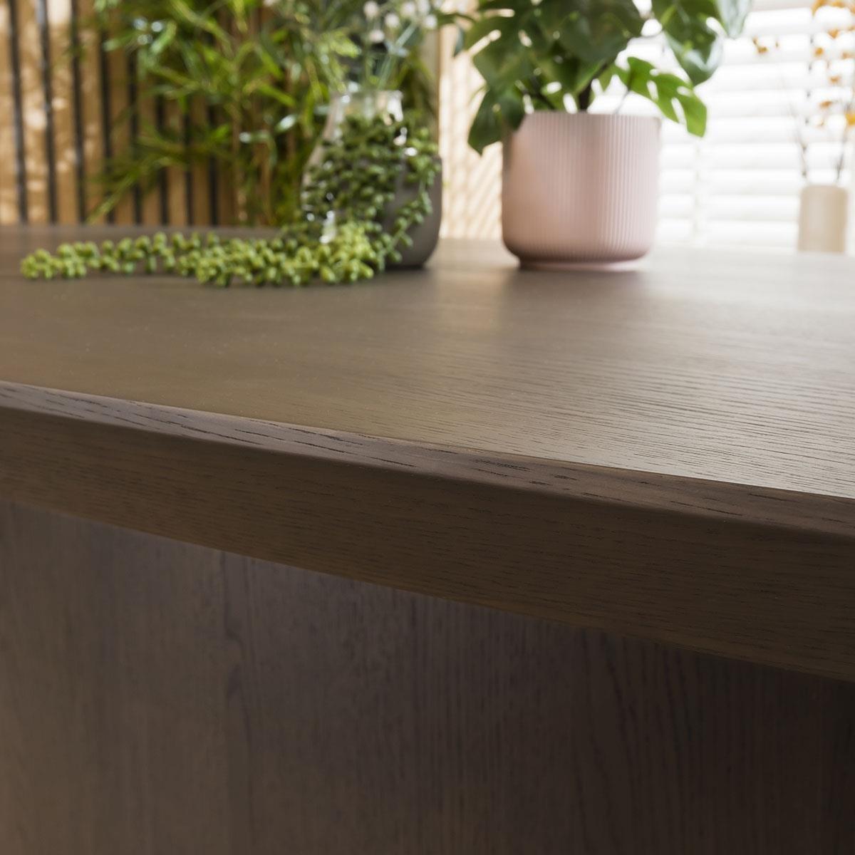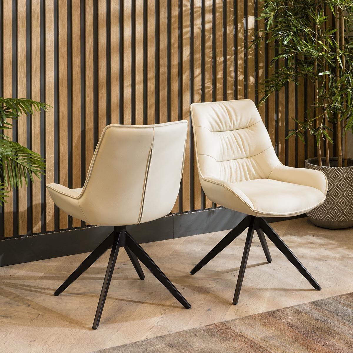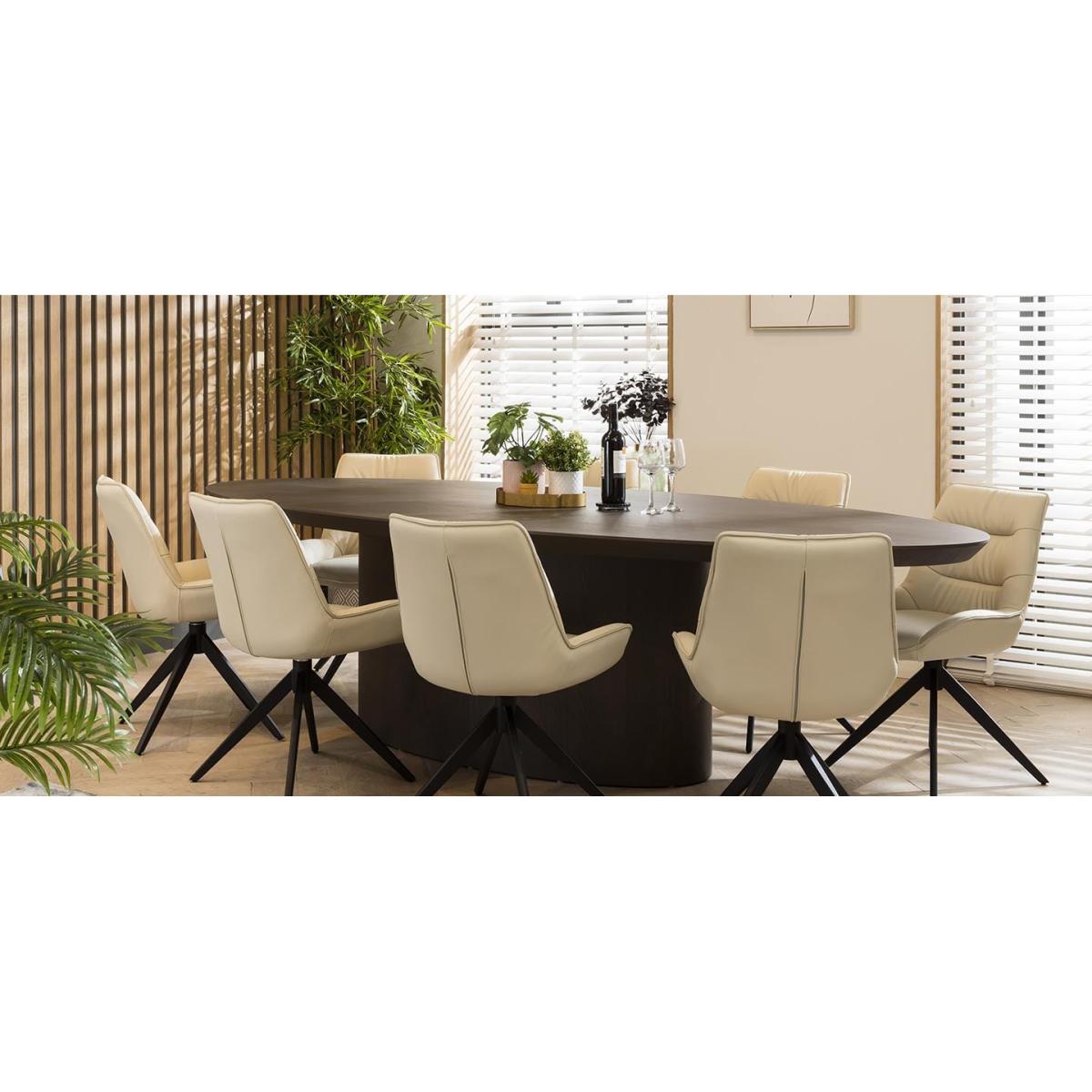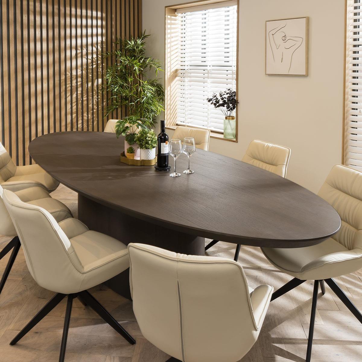 The Nora contemporary 8 seater oval dining set combines modern aesthetics with premium functionality. Crafted with meticulous attention to detail, this 8 person set features a grey oak veneer oval dining table and elegant cream leather dining room chairs, it's a perfect addition to any modern kitchen or dining room. Elevate your dining experience with the Madison modern grey oval dining table. Designed with a 280x120cm tabletop, the oval kitchen dining set comfortably accommodates 8 people, making it ideal for gatherings or family meals. The contemporary design of this wooden dining table for 8 adds a touch of modern style to any dining space. Elegance with comfort is effortlessly blended with the Nora leather dining chairs in this set, crafted with genuine cream leather. These cushioned dining room chairs feature a sleek 4-point swivel base that ensures stability and ease of movement, making the chairs a perfect addition to any contemporary kitchen or dining space. This 8 seater dining set is the perfect blend of modern design, premium materials, and spacious seating, making it an excellent choice for those who appreciate both style and comfort. Transform your dining room into an elegant haven where you can create cherished memories with your loved ones, all centered around this exquisite dining set. Table Size W280cm D120cm H79cm Chair Size W58cm D64cm H85cm 8 Seater Oval Dining Set
