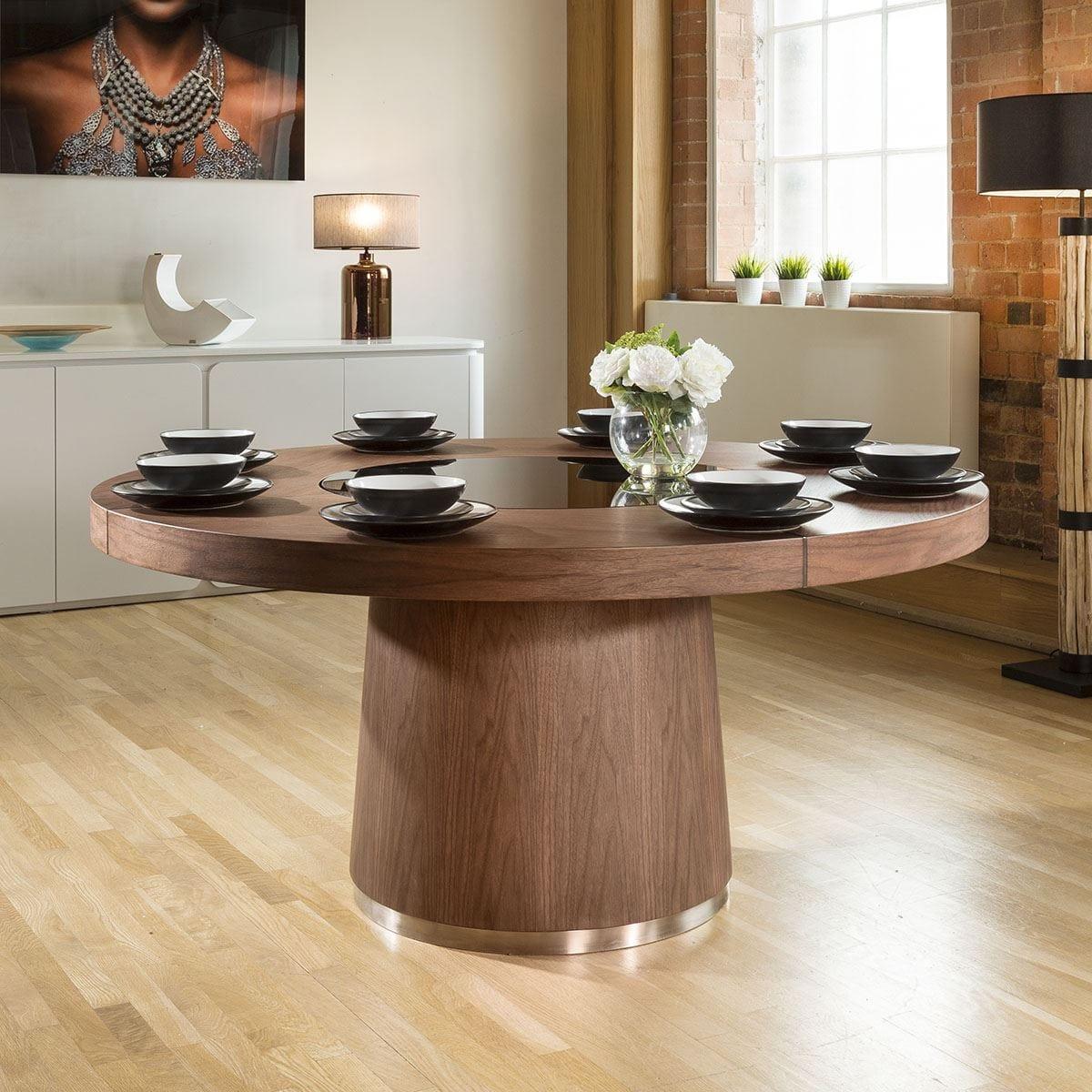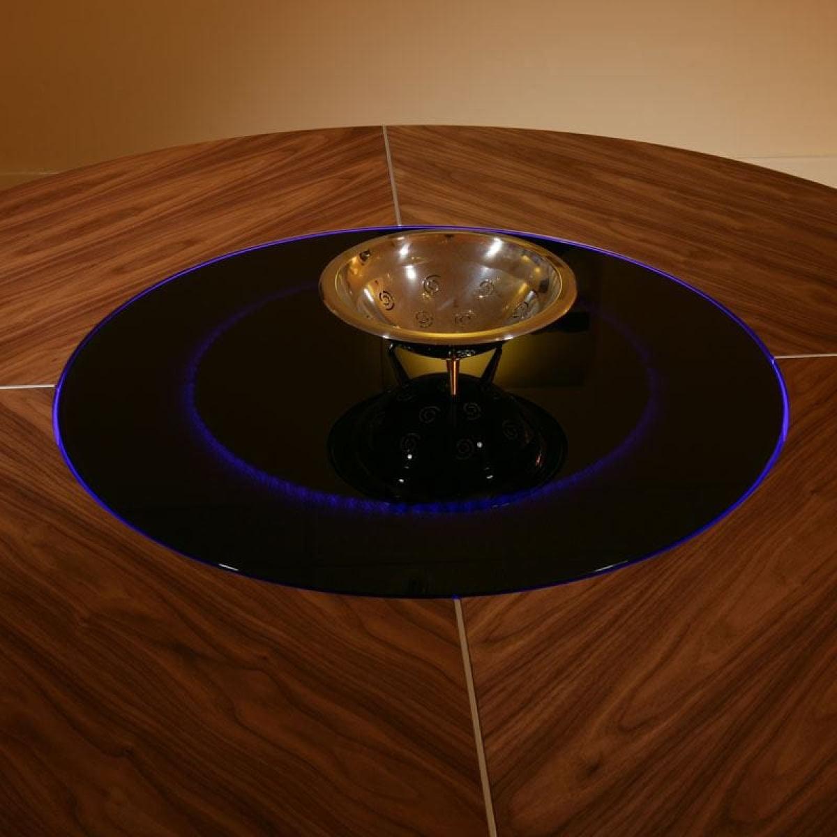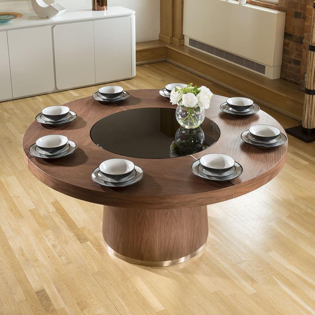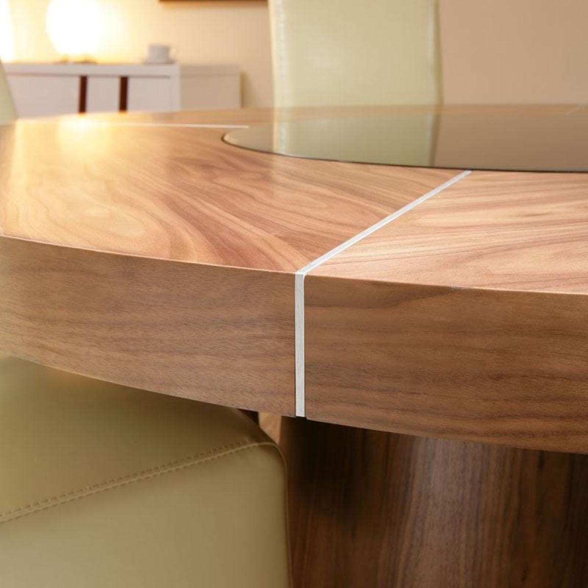 This stunning round dining table will effortlessly seat 8 guests. For added convenience, the rotating lazy susan with LED lighting makes for a fun dining experience. Sleek in design, the rich walnut veneer dining table has a round 160cm top supported by a surdy pedestal base that adds stability for years of enjoyment. Designed to captivate, this round dining table boasts a luxurious rich walnut veneer finish that exudes sophistication. The brushed metal accent trim adorning the base and tabletop adds a touch of contemporary flair, creating a harmonious balance between classic and modern aesthetics. Enhancing both style and convenience, the table features an 80cm glass lazy susan at its heart, facilitating easy sharing of dishes among diners. Elevating the experience further, an integrated LED light strip beneath the rotating lazy susan illuminates the table's center, casting a warm and inviting glow. Control the ambiance effortlessly with the included remote, allowing you to tailor the mood to your preference. Transform your dining area into a realm of modern luxury with our round dining table. Its ultra-modern design, coupled with thoughtful features like the glass lazy susan and LED lighting, promises to elevate your dining experience to new heights. Crafted with meticulous attention to detail and a keen eye for aesthetics, this dining table is not just furniture – it's a statement piece that brings people together in style. W160cm D160cm H73cm 8 Seater Designer Round Dining Table Rotating Lazy Susan with Remote Control LED Lighting