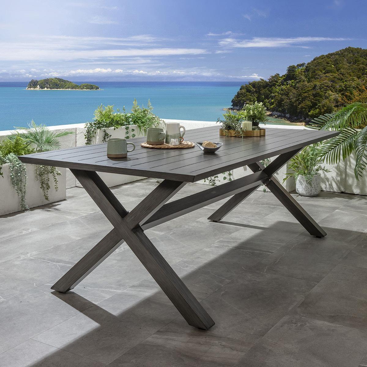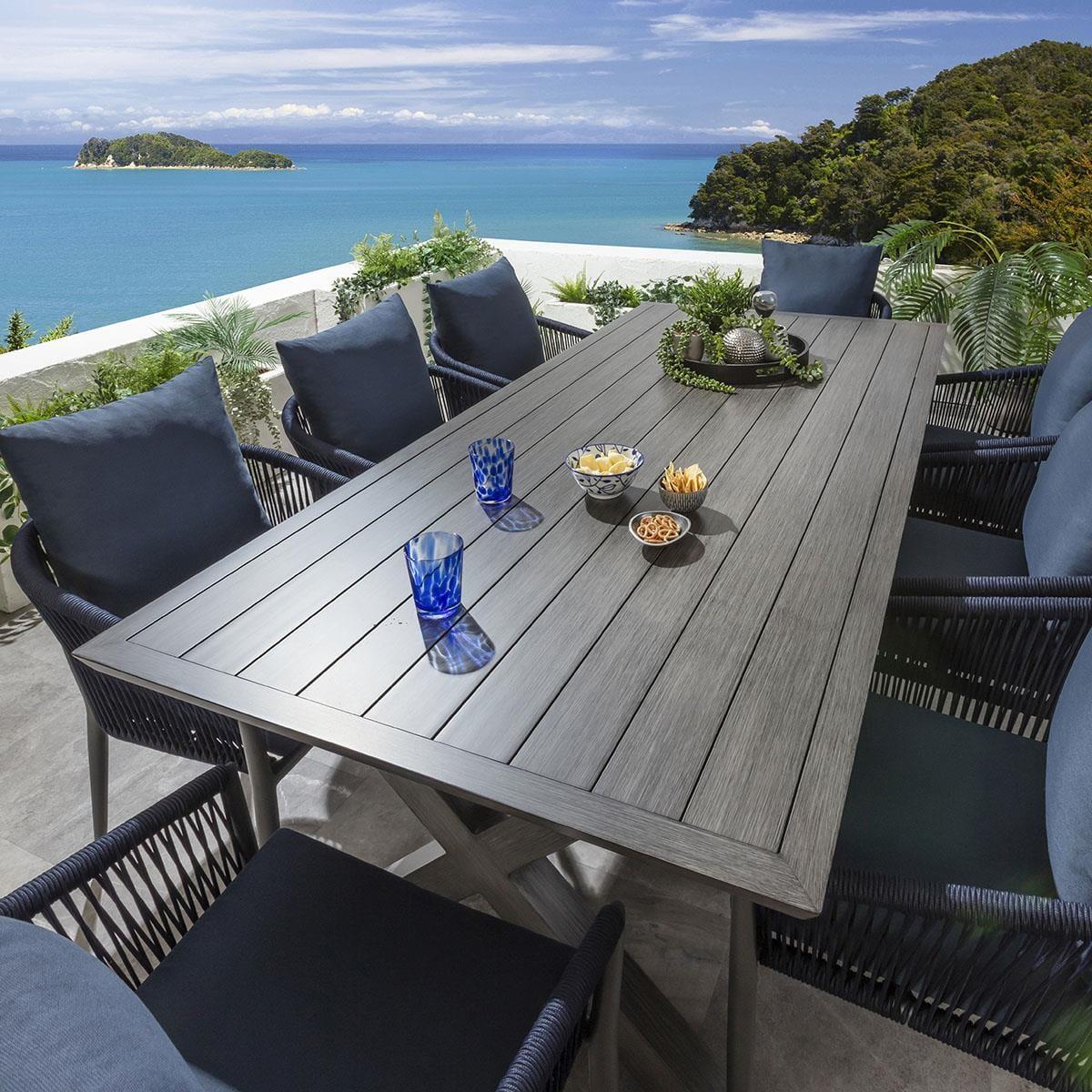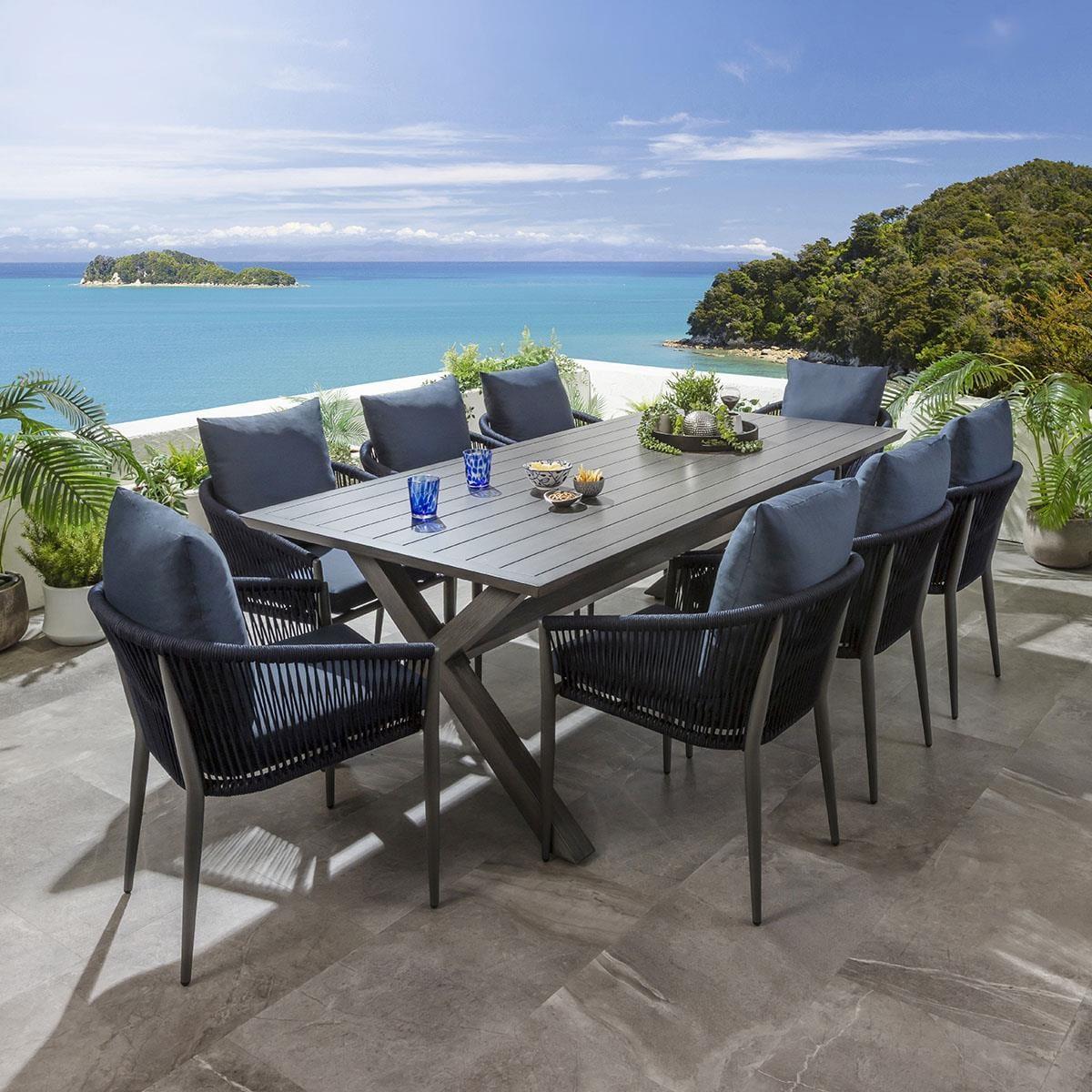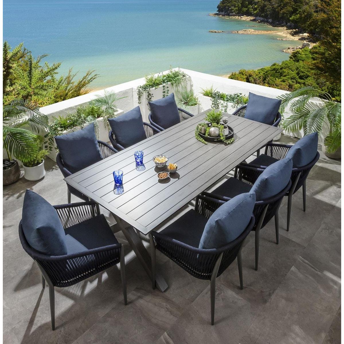 This 8 seater garden dining table and chairs set includes a farmhouse-inspired dining table, featuring a smoke finish and X-legs, crafted from full aluminium, with blue rope garden dining chairs made from aluminium, making them weather-resistant for outdoor use. This outdoor dining set is crafted for durability and comfort. The Star 220cm modern garden dining table boasts a farmhouse-inspired design, featuring a grey smoked wood effect finish, and distinctive Cross X-leg design. Crafted from full aluminium, this weatherproof 8-seater outdoor table is designed to withstand the elements, allowing you to leave it uncovered year-round. Reinvent your outdoor dining space with 8 Cole all-weather blue rope-back garden dining chairs. The generously padded outdoor chairs are enhanced by a supportive back cushion for an extra layer of luxurious comfort. The Cole garden chair frames are crafted from aluminium, making them highly durable and weather-resistant for outdoor use. This 8 seater dining set combines modern Cole chairs with the stunning Star table. Whether you love the Cole chairs and would like to purchase them individually, or you think the Star table would complete your outdoor dining space better with another chair, you can easily mix and match our garden tables and chairs to curate something truly unique. Table Size W220cm D93cm H76cm Chair Size W61cm D65cm H75cm Modern Garden Dining Set for 8