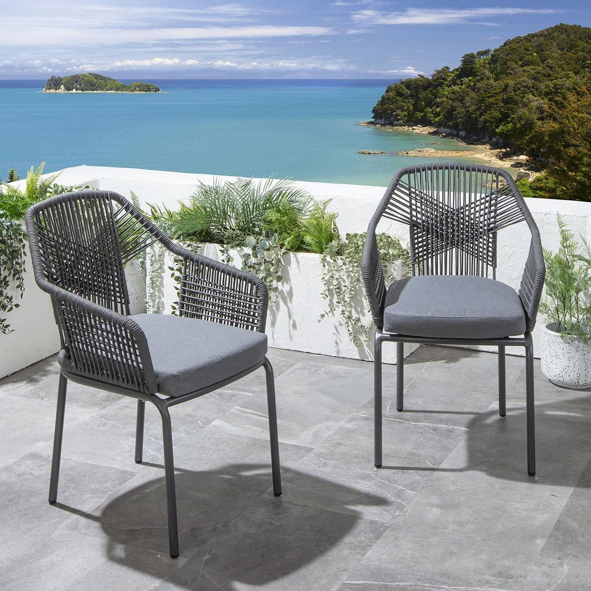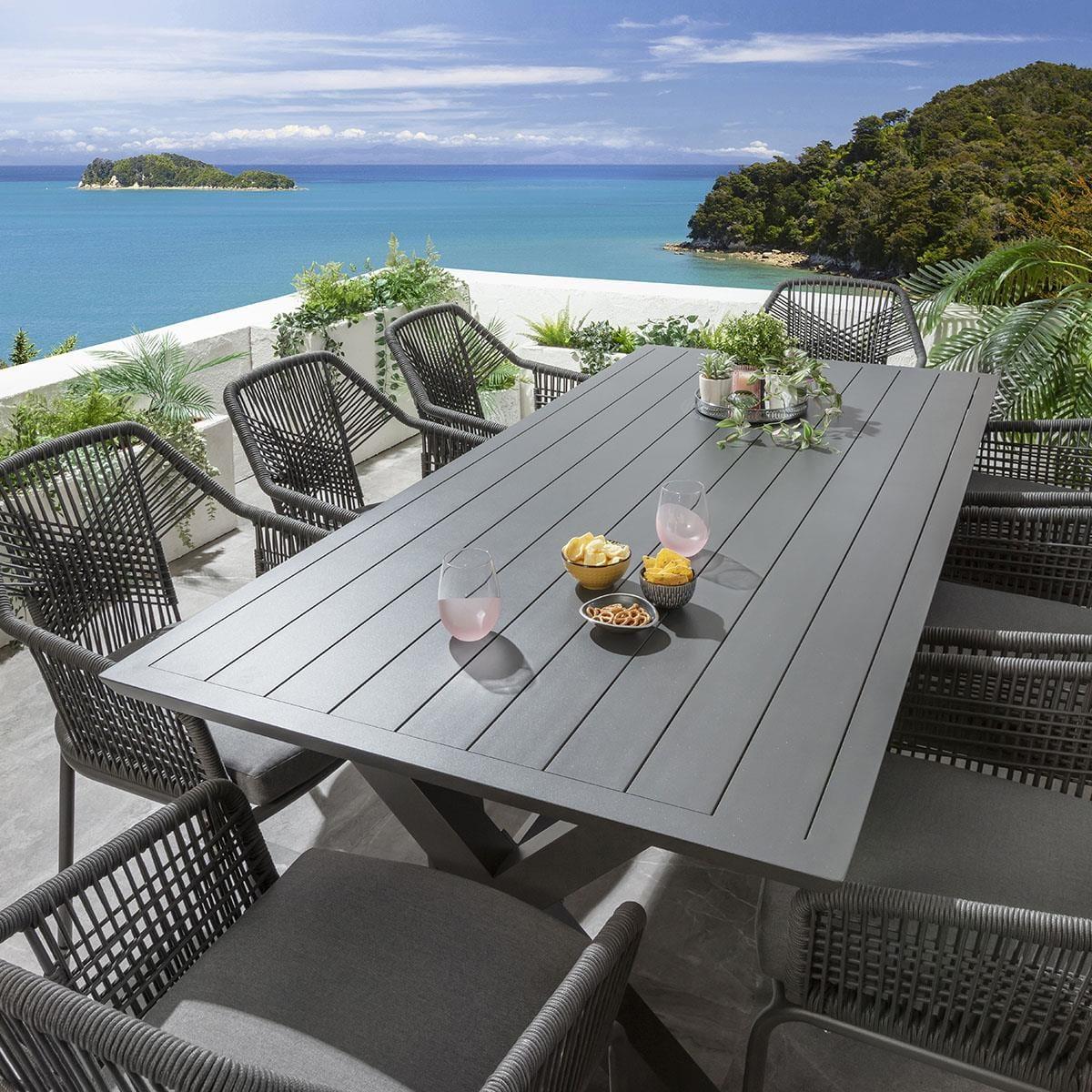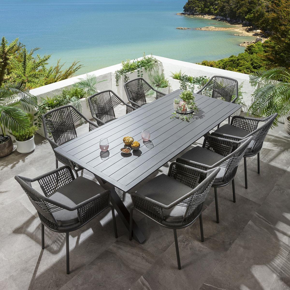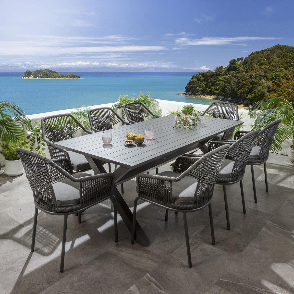 This 8 seater garden dining table and chairs set includes a farmhouse-inspired dining table, featuring a grey finish and X-legs, crafted from full aluminium, with aluminium garden dining chairs with an intricate rope weave and a seat cushion in a grey fabric. This outdoor dining set is crafted for durability and comfort. The Star 220cm modern garden dining table boasts a farmhouse-inspired design, featuring a sleek modern grey finish and distinctive Cross X-leg design. Crafted from full aluminium, this weatherproof 8-seater outdoor table is designed to withstand the elements, allowing you to leave it uncovered year-round. Crafted with an aluminium frame in a chic grey finish, the 8 garden dining chairs in this set boast an intricate rope weave adorning the back and arms. The outdoor patio chairs have a carver style design, complete with arms, providing both comfort and style, enhanced by the premium foam seat pad cushion in a durable grey fabric. This 8 seater dining set combines modern Cia chairs with the stunning Star table. Whether you love the Cia chairs and would like to purchase them individually, or you think the Star table would complete your outdoor dining space better with another chair, you can easily mix and match our garden tables and chairs to curate something truly unique. Table Size W220cm D93cm H76cm Chair Size W64cm D69cm H86cm Modern Garden Dining Set for 8