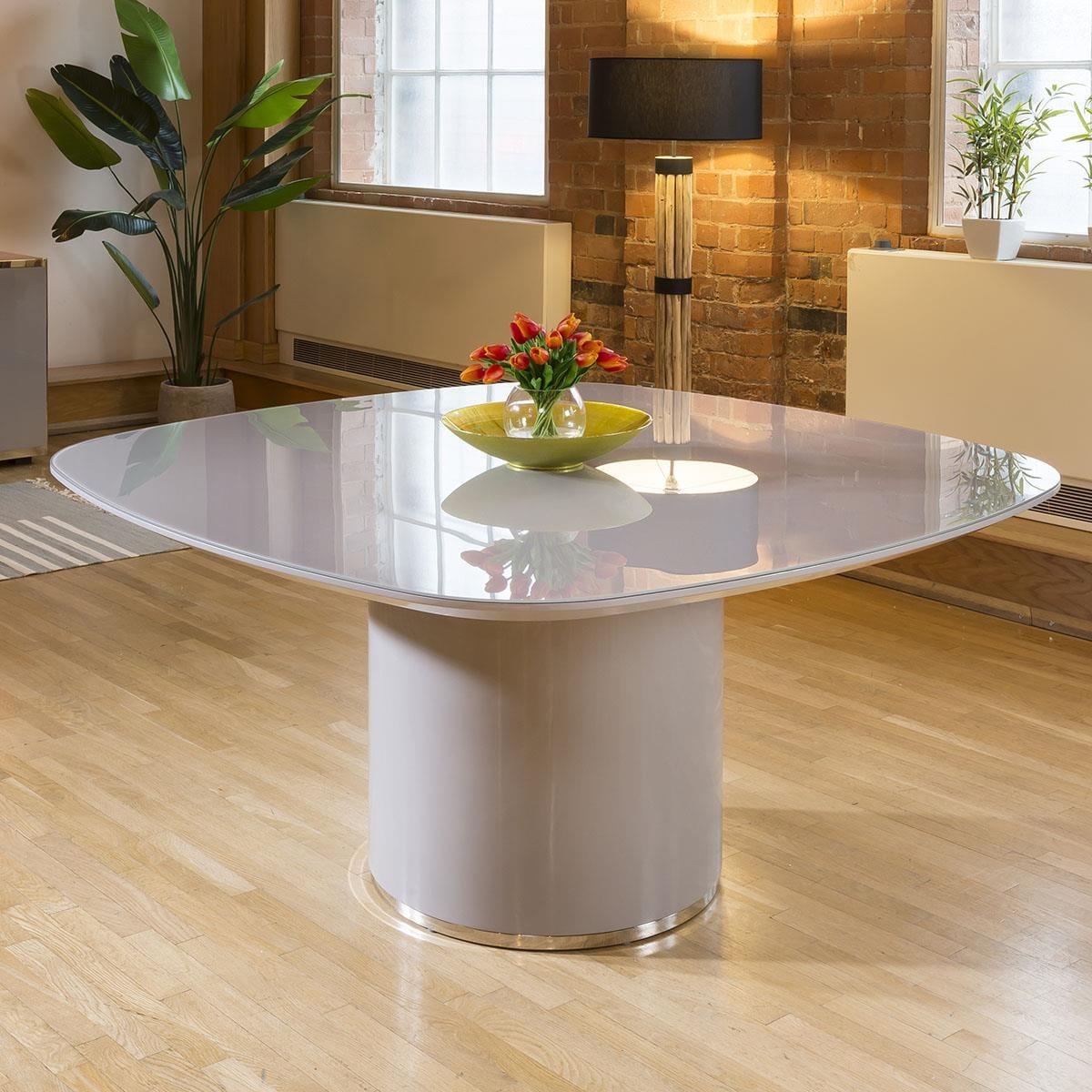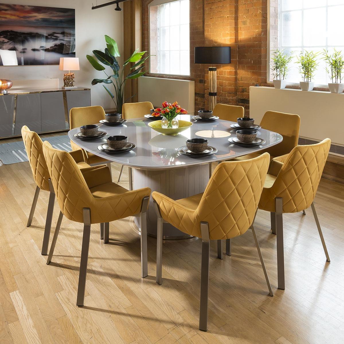 The Truly Stunning 240T. 2 Square Grey Dining Table. This huge premium dining table measuring 160 cm for the larger dining room, kitchen or living area. This dining set includes 8 carver dining chairs with mustard quilted fabric and brushed stainless steel legs, adding that perfect splash of colour. Quatropi Luxury Dining Sets have been designed to stand out in the most contemporary dining rooms and kitchens in the UK. The dining table sets have been put together by our expert designers to provide a large combination of choice from farmhouse style to prestige, including small or large dining table sets, long narrow tables, round breakfast tables, farmhouse solid oak sets, extendable dining sets, corner sofa bench sets - only to mention a few! Our range of dining chairs that we match to the dining tables provides you with a large choice of sets - these are available in many colours and made in many styles, such as carver, faux leather, suede, velvet and many more. Quatropi Luxury Dining Sets have been designed to stand out in the most contemporary dining rooms and kitchens in the UK. The dining table sets have been put together by our expert designers to provide a large combination of choice from farmhouse style to prestige, including small or large dining table sets, long narrow tables, round breakfast tables, farmhouse solid oak sets, extendable dining sets, corner sofa bench sets - only to mention a few! Our range of dining chairs that we match to the dining tables provides you with a large choice of sets - these are available in many colours and made in many styles, such as carver, faux leather, suede, velvet and many more. The dining table sets have been put together by our expert designers to provide a large combination of choice from farmhouse style to prestige, including small or large dining table sets, long narrow tables, round breakfast tables, farmhouse solid oak sets, extendable dining sets, corner sofa bench sets - only to mention a few! Our range of dining chairs that we match to the dining tables provides you with a large choice of sets - these are available in many colours and made in many styles, such as carver, faux leather, suede, velvet and many more. W160cm D160cm H76cm Tempered glass top Set includes dining table and 8 dining chairs