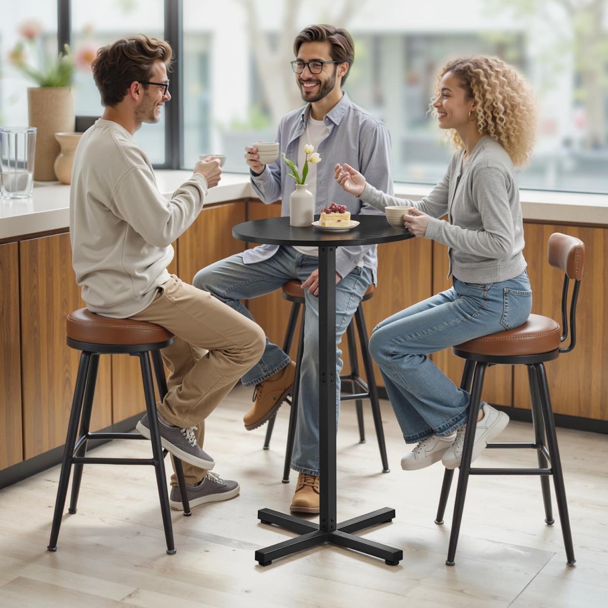 Elevate your space with this modern bar table in ebony black, featuring sleek lines and a distinctive cross base for added style. The sturdy metal frame and adjustable feet ensure stability on any surface, while the cross base maximizes floor space, letting you tuck stools neatly underneath. Measuring 60 x 60 x 104.5 cm, it comfortably seats 2or3 people ideal for cozy breakfasts, casual drinks, or as a compact workspace. Easy to assemble, this versatile high table blends seamlessly into kitchens, dining areas, or home bars, offering both contemporary flair and practical functionality. Elevate your space with this modern bar table in ebony black, featuring sleek lines and a distinctive cross base for added style. The sturdy metal frame and adjustable feet ensure stability on any surface, while the cross base maximizes floor space, letting you tuck stools neatly underneath. Measuring 60 x 60 x 104.5 cm, it comfortably seats 2-3 peopleideal for cozy breakfasts, casual drinks, or as a compact workspace. Easy to assemble, this versatile high table blends seamlessly into kitchens, dining areas, or home bars, offering both contemporary flair and practical functionality.