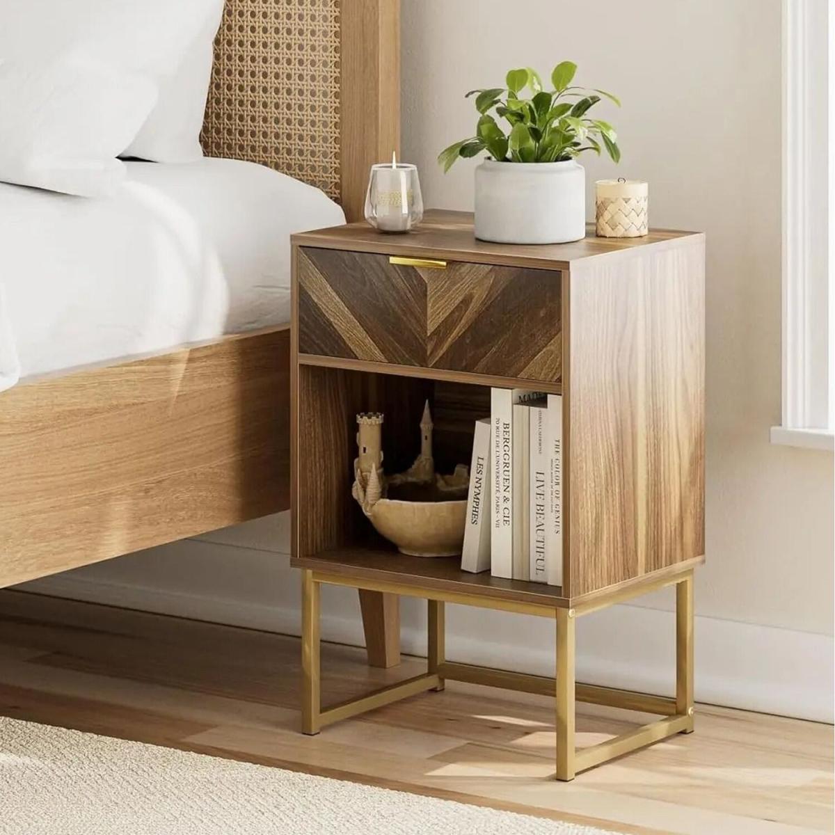 I’m particularly fond of this modern bedside table for its neat combination of warm oak tones and slim, gold-finish legs - it brings a touch of mid-century flair without feeling heavy. The single drawer with chevron-style grain keeps nightly clutter out of sight, while the open cubby below is ideal for stashing a few favourite reads or a small storage basket. This piece works really well in Scandi-inspired or contemporary bedrooms, especially against pale walls and natural-fibre rugs. To style it, keep the top simple ­- a low-profile lamp, a small plant and perhaps a ceramic dish for jewellery. In the open shelf, stack two or three books horizontally and top them with a sculptural object or scented candle to balance form and function.