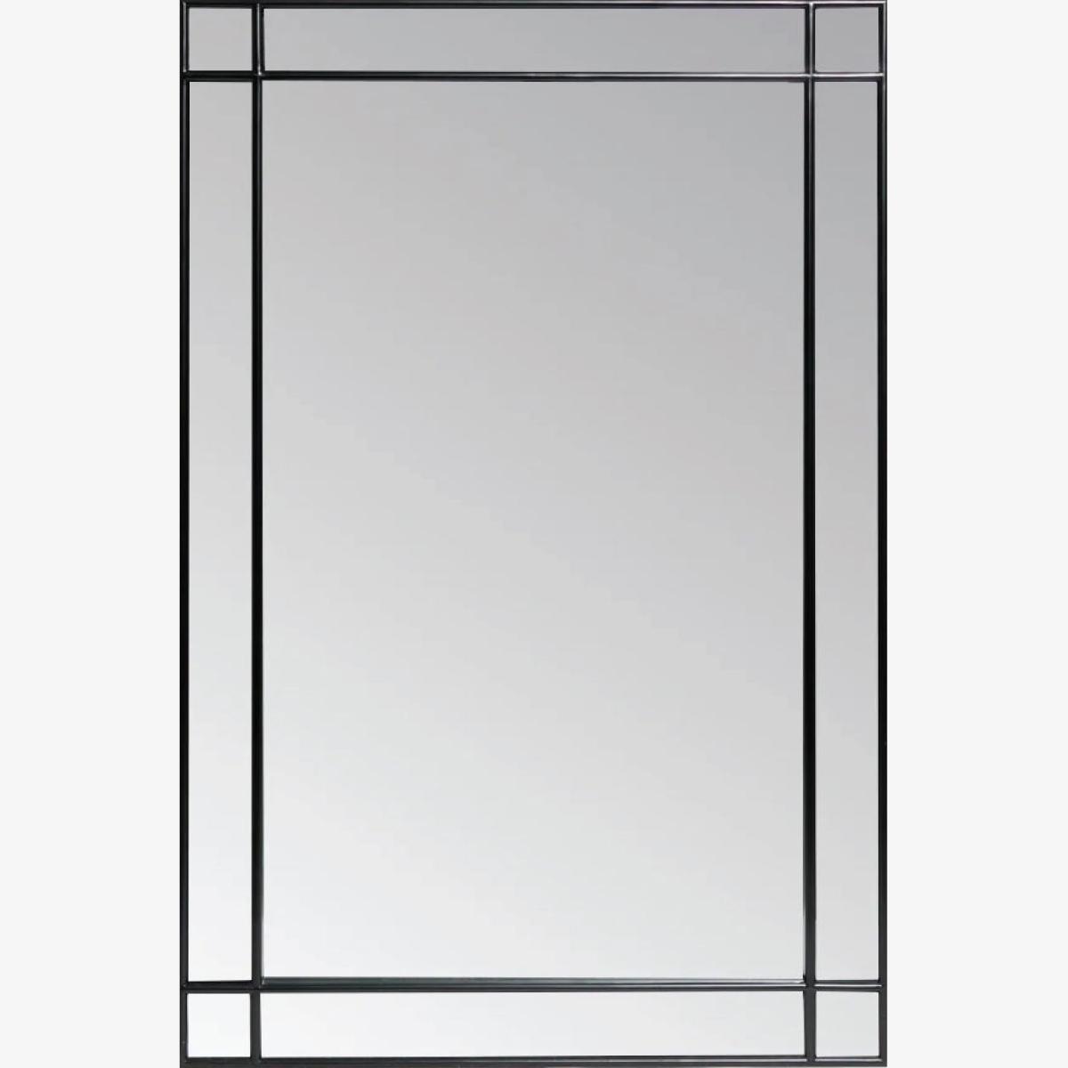 This is a rectangular wall mirror featuring a sleek, modern design with a black metal frame. The frame is divided into geometric sections, adding a subtle decorative element to the overall minimalist style. The mirror includes small mirrored panels along the edges, separated by the black lines, creating a grid-like pattern that enhances its contemporary aesthetic. This mirror would be a stylish addition to a living room, hallway, or bedroom, offering both functionality and a touch of elegance.