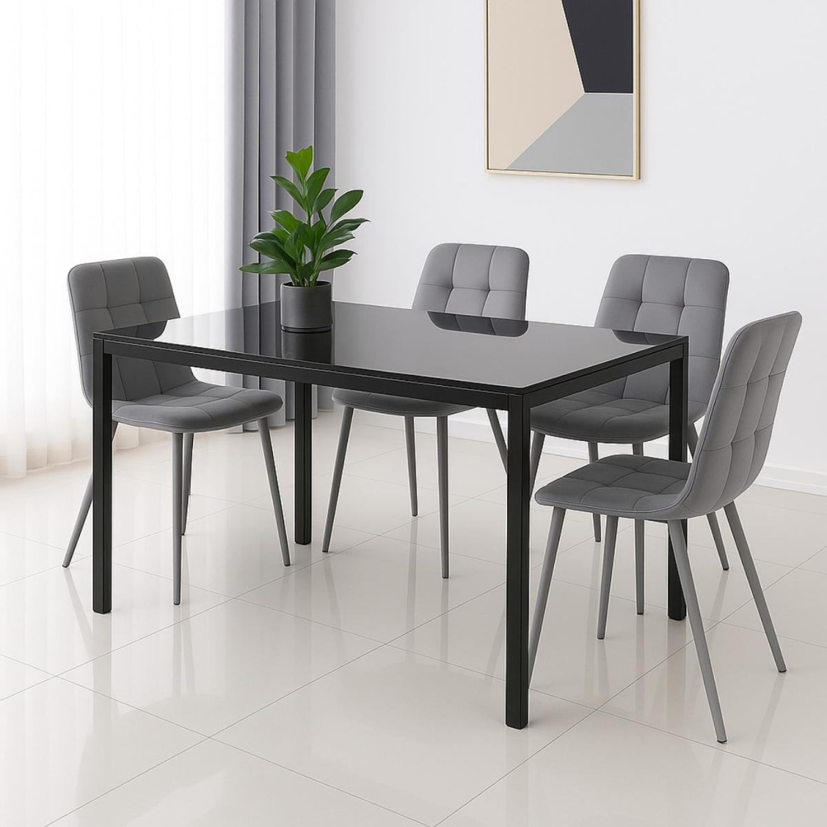 Elevate your dining space with the elegant Kosy Koala Dining Set, combining modern design with luxurious comfort. This set includes a sleek black tempered glass dining table with strong metal legs and four soft grey tufted velvet chairs. Each chair providing both support and timeless style. The 8mm black tempered glass tabletop offers a refined, contemporary look while ensuring lasting durability. Sturdy metal legs provide stability and include rubber feet for floor protection. Perfect for kitchens, dining rooms, cafes, or restaurants, this set brings sophistication and comfort to any setting. Features Set includes 1 black glass dining table and 4 grey tufted velvet chairs Table 8mm high quality black tempered glass with sturdy metal legs and rubber feet Chairs Soft grey velvet with padded seats and backs, featuring a slightly curved design for comfort Protective leg caps prevent floor scratches and improve stability Easy to assemble with clear step by step instructions Dimensions Table H75 , L120 ,W70 cm Chair H87 , L59 , W44 cm Seat height 45 cm