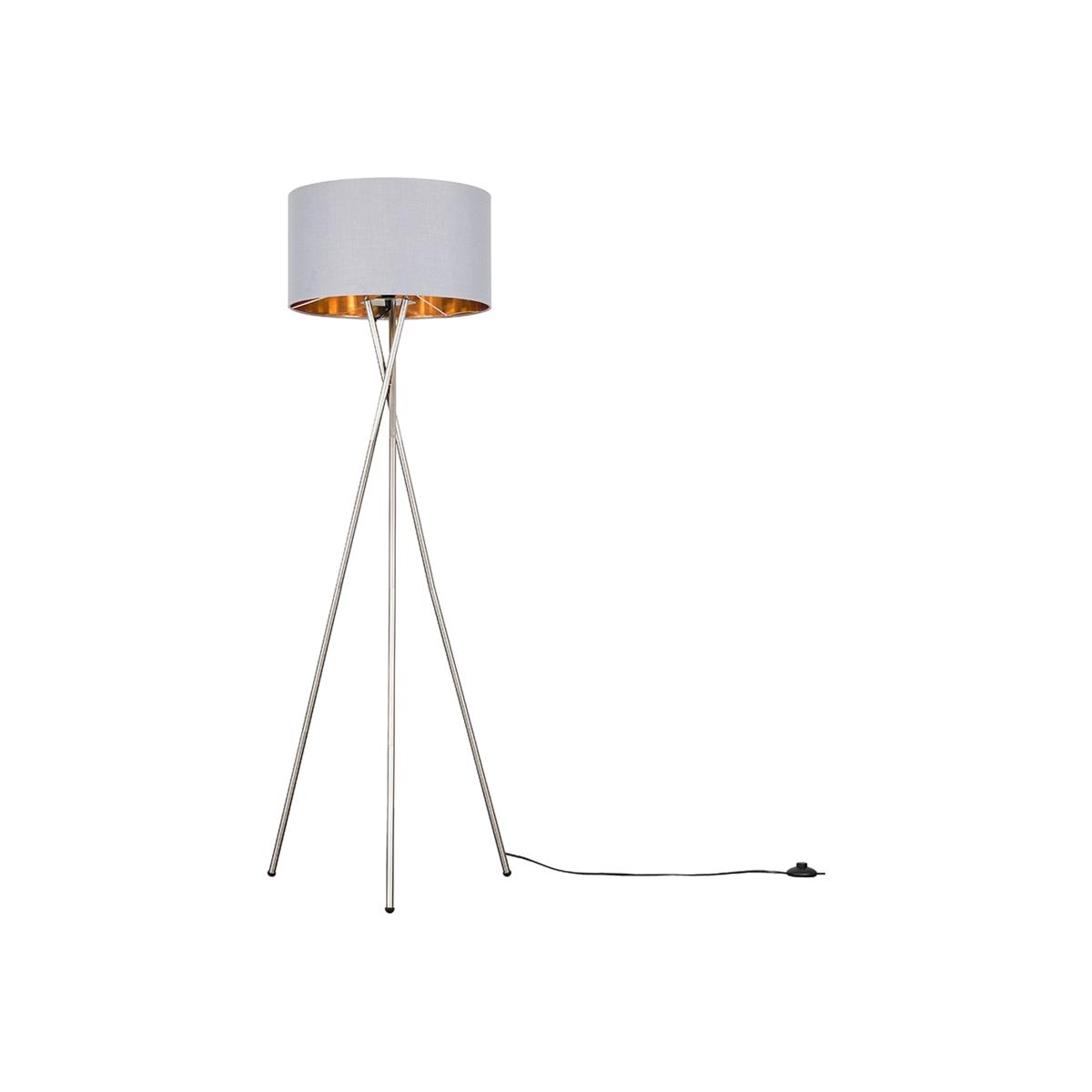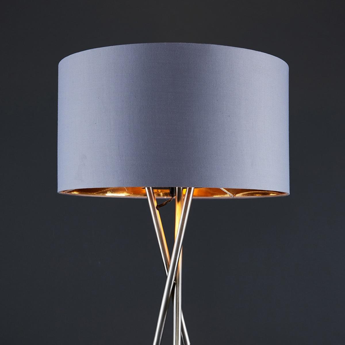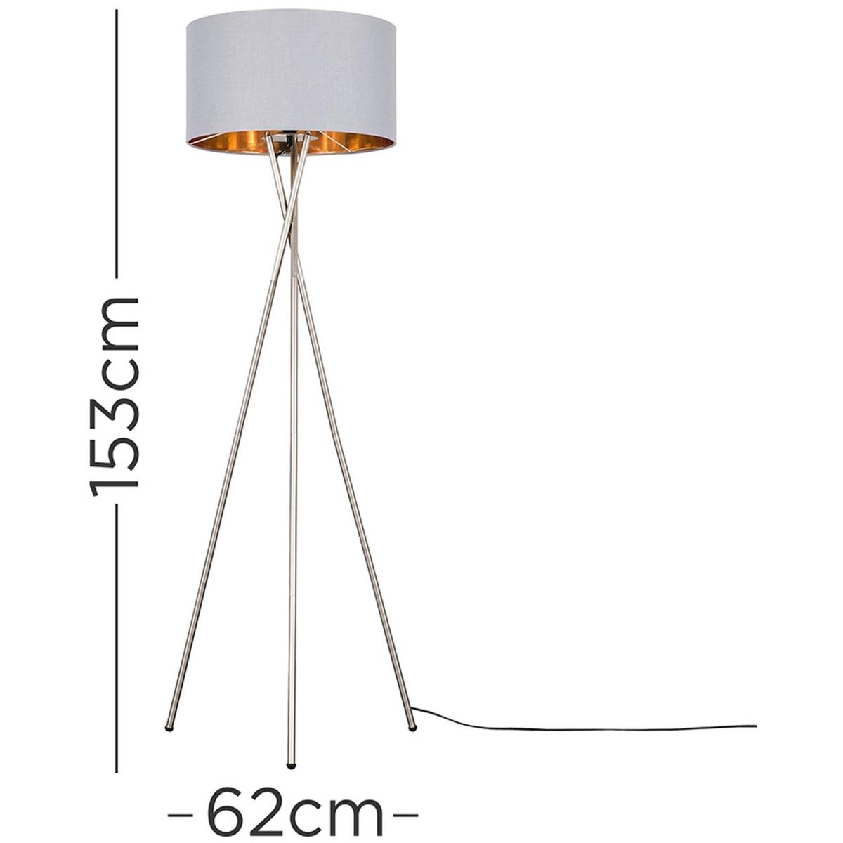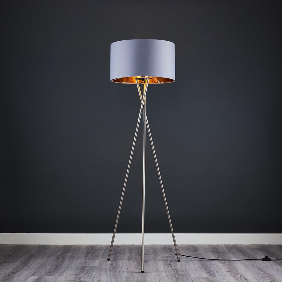 Tripod floor lamp in a brushed chrome metal finish. Comes complete with an extra large grey fabric cylinder lamp shade with a gold coloured interior, and features an in-line onoff foot switch for easy use. Floor lamps are a great way to bring additional lighting to a room. Ideal for lounges, hallways, bedrooms and other areas around the home.