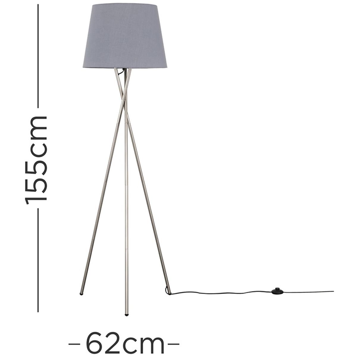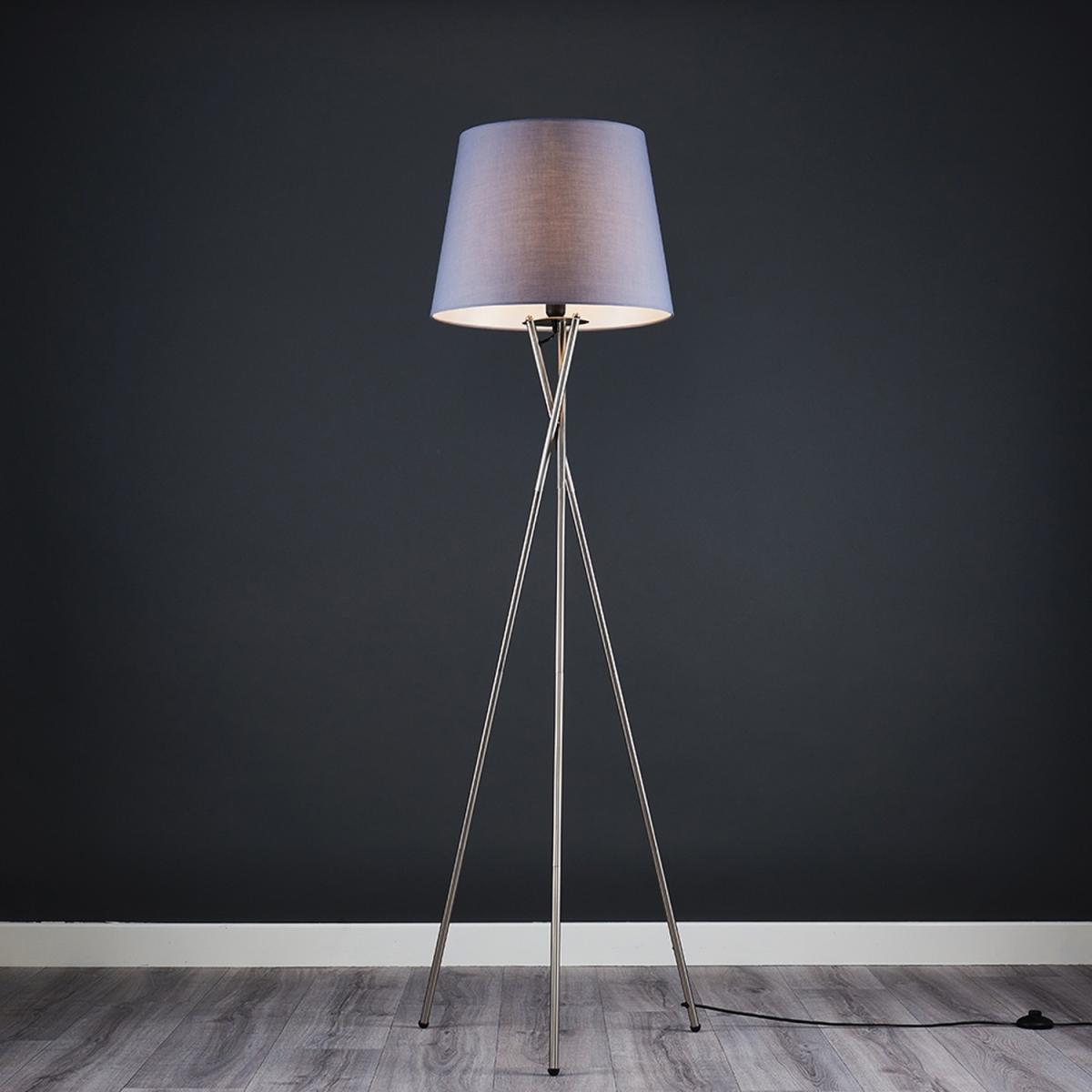 Tripod floor lamp in a brushed chrome metal finish. Comes complete with an extra large grey fabric tapered lamp shade, and features an in-line onoff foot switch for easy use. Floor lamps are a great way to bring additional lighting to a room. Ideal for lounges, hallways, bedrooms and other areas around the home.