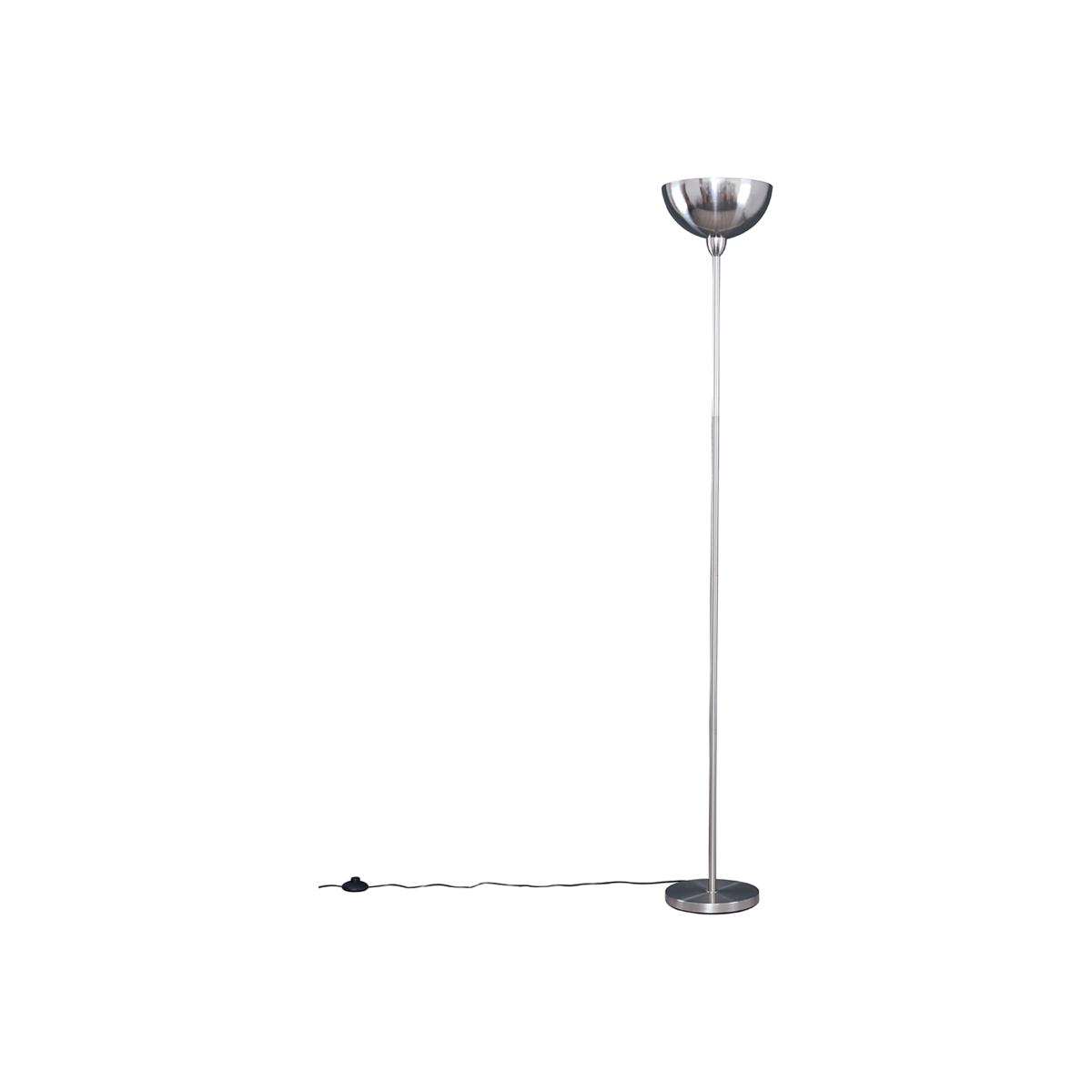 Modern up-lighter floor lamp in a brushed chrome metal finish, featuring a bowl shaped shade and an in-line onoff foot switch for easy use. This contemporary floor lamp is a great way to brighten up any room in your home. Its simply yet stylish design will add a minimalist touch to your living space. Ideal for use in lounges, hallways, bedrooms, office's and more!