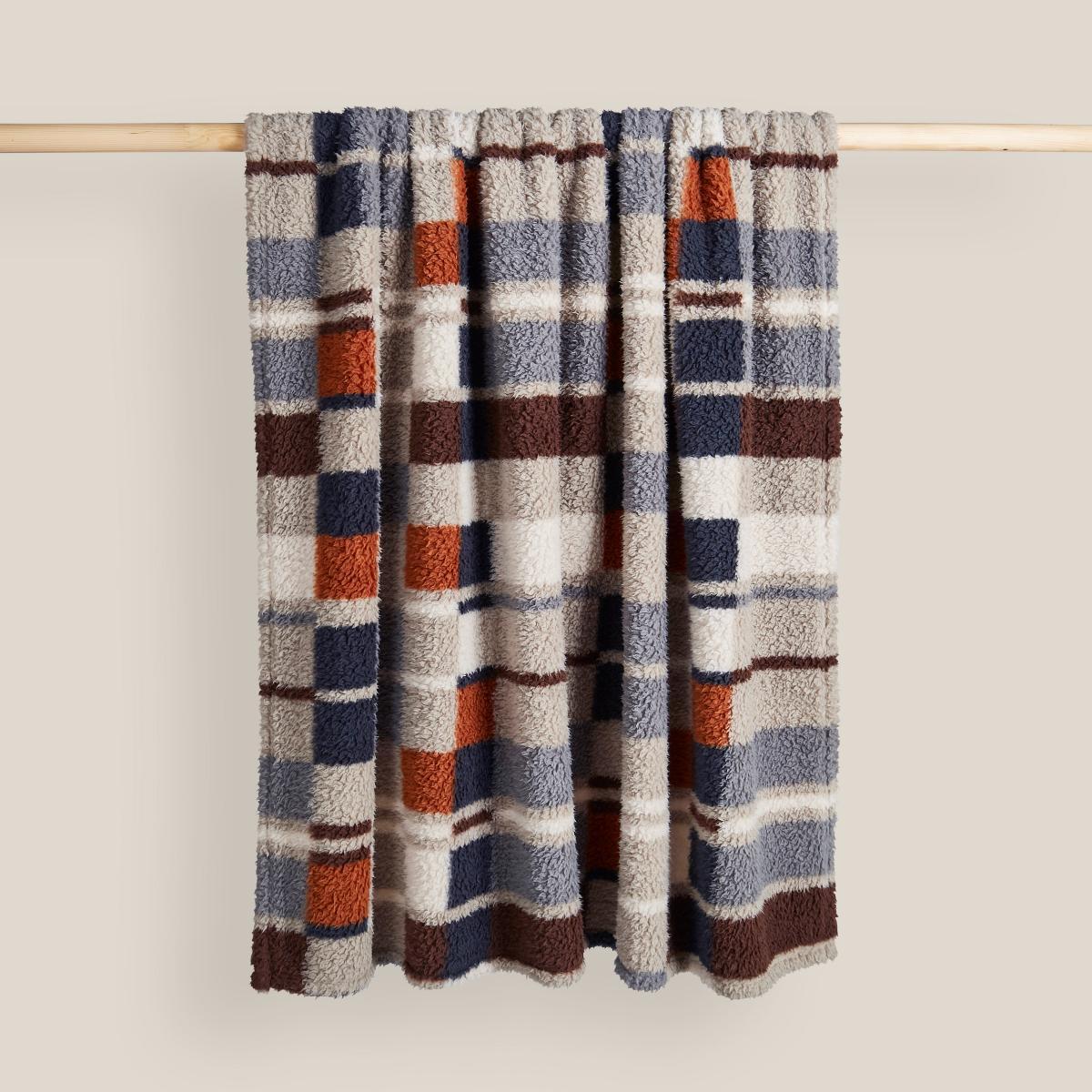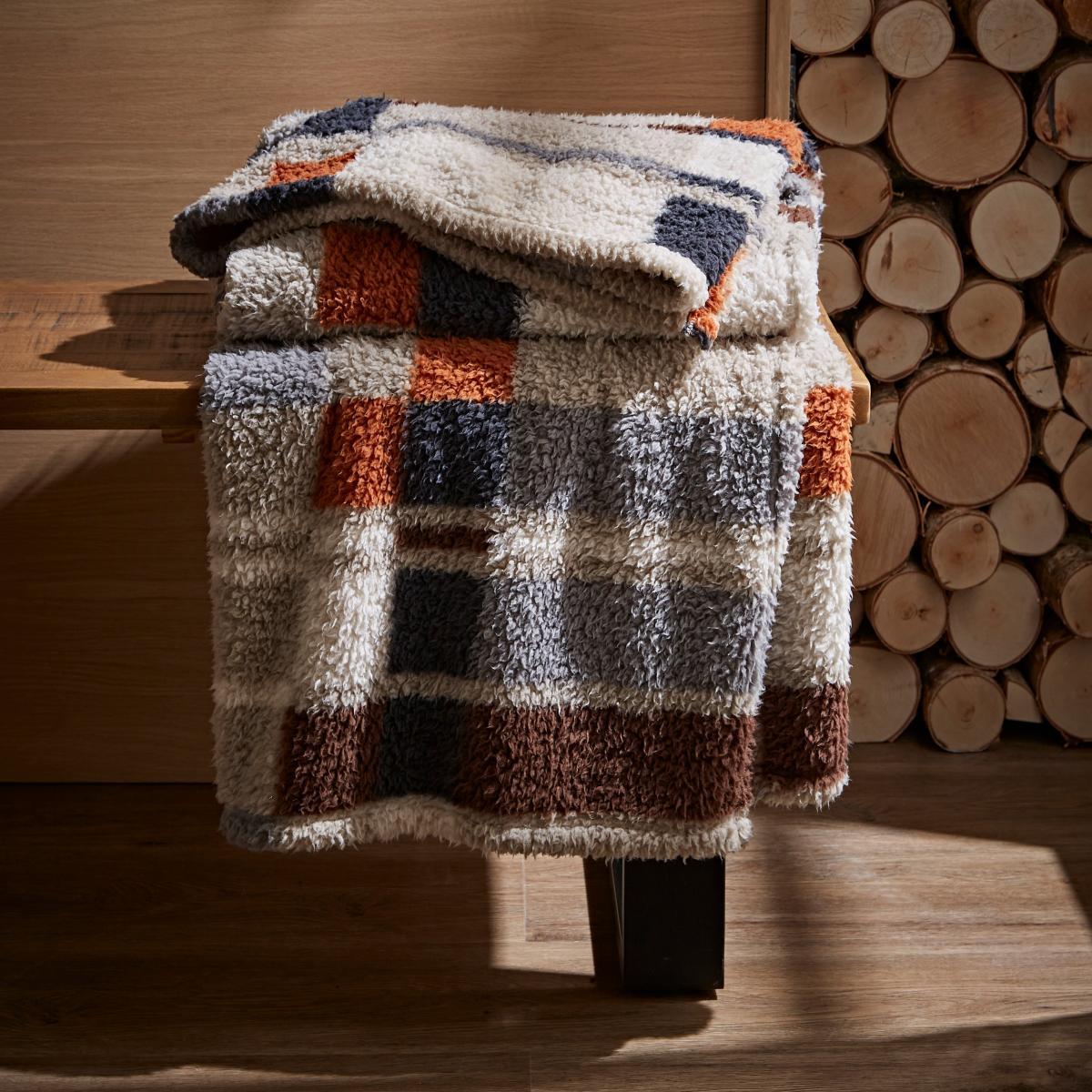 Modern Check Navy Sherpa Throw Navy Blue/Orange/white