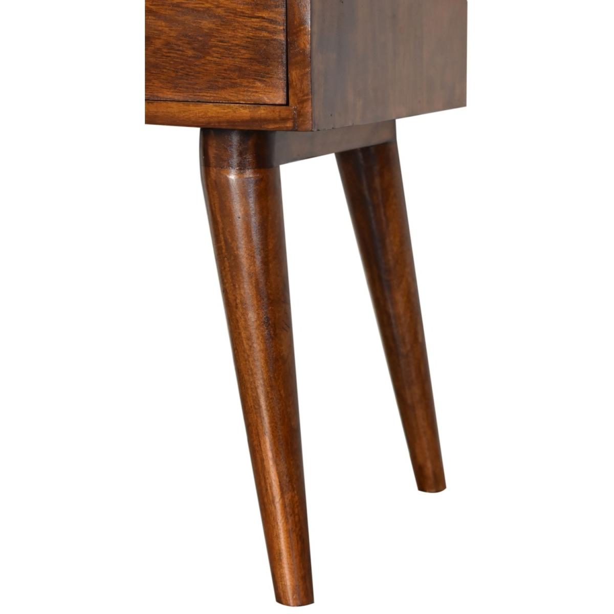 Endlessly versatile, this bedside table makes a perfect stand for nibbles, drinks, or a lamp and will prove handy all over your home. It is made from 100% solid mango wood in a chestnut finish and features 2 drawers. Other features include shiny brass knobs on the drawers and 4 Scandinavian-style legs.
