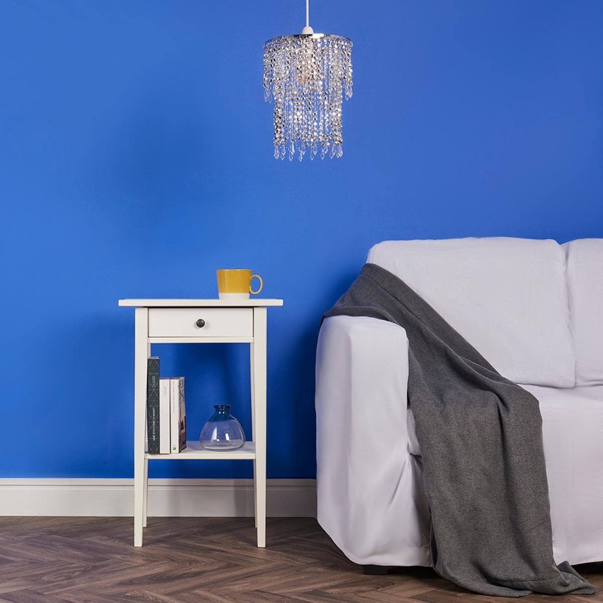 A stunning fountain effect ceiling pendant shade with suspended sparkling silver chrome acrylic jewel droplets dangling from a silver metal frame. These beautiful diamond style chrome beads shimmer and reflect the light to cast beautiful patterns throughout the room. Perfect chandelier type ceiling lampshade for children and adult bedrooms, lounges, living rooms, hallways and landings. This product requires a 60w BC B22 GLS bulb or an energy saving equivalent. Easily fits to your standard ceiling light socket - no wiring required.