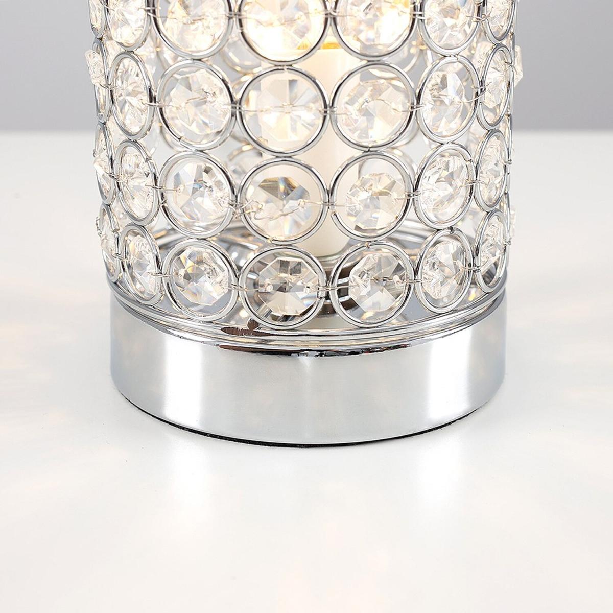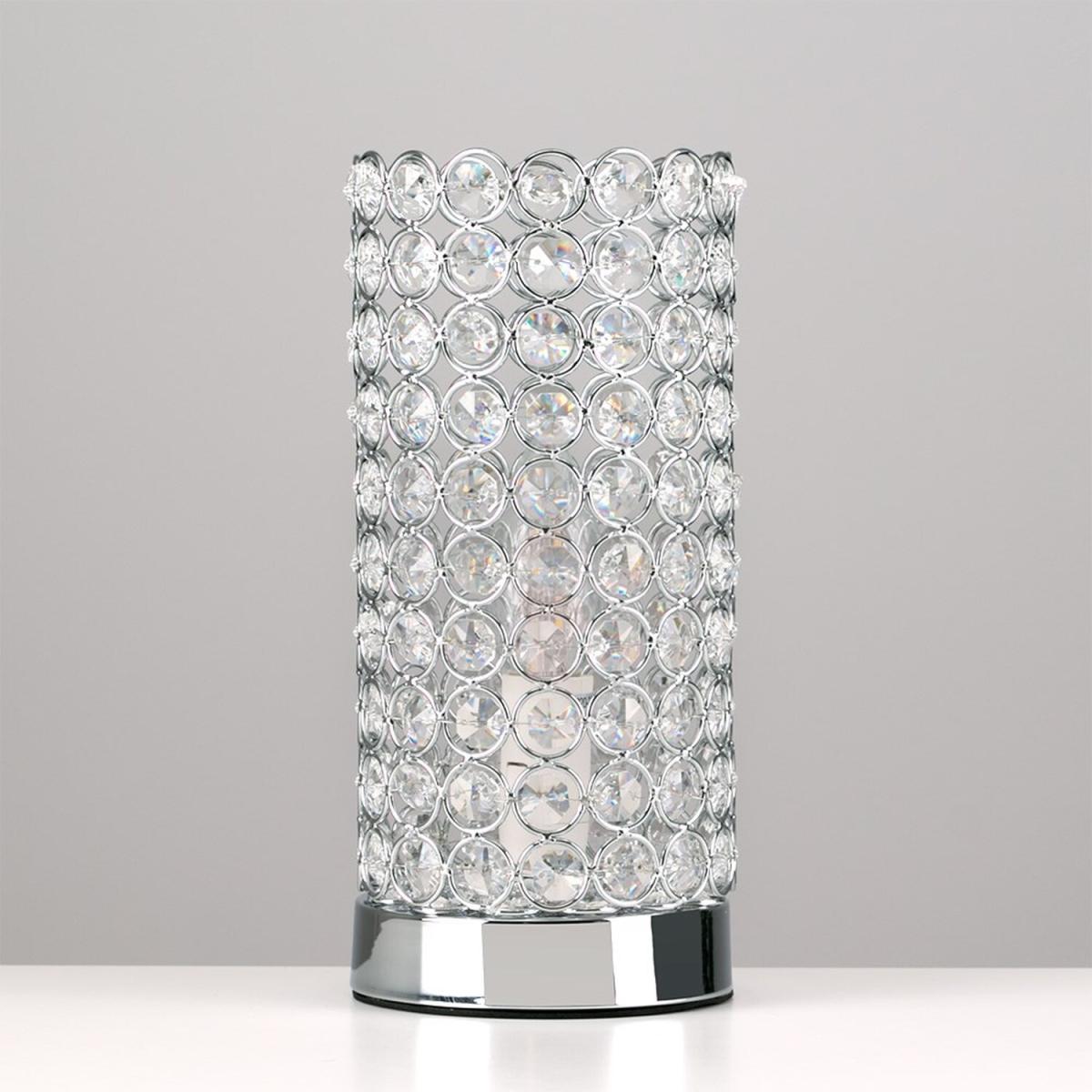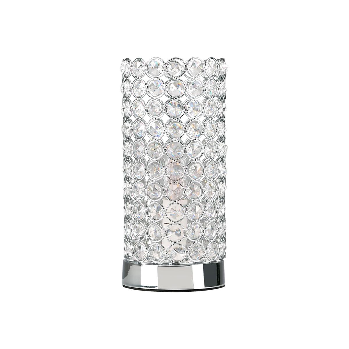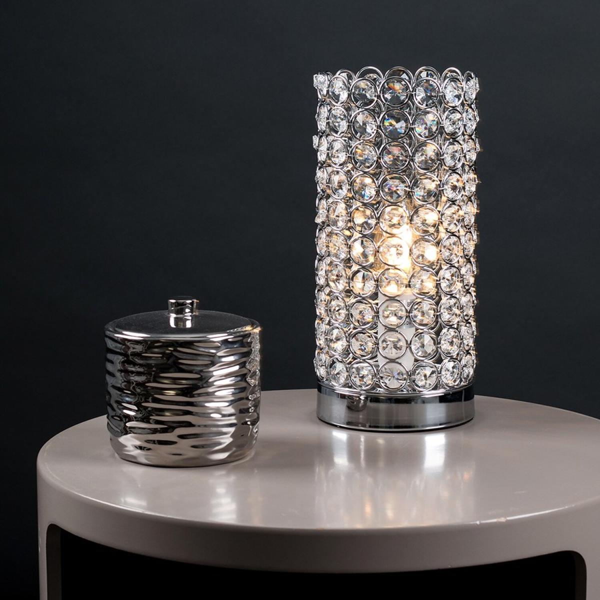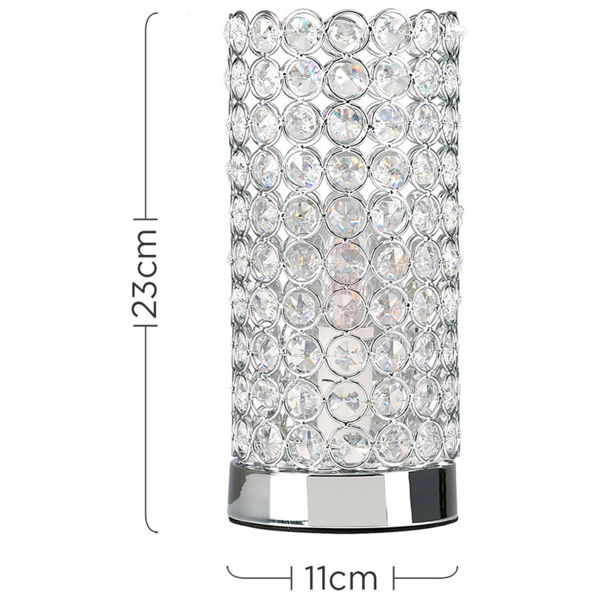 Modern touch table lamp in a polished chrome finish, with a clear K9 genuine crystal jewel detailed cylinder shade. Simply touch the metal base to turn it on. The light can be set to 4 stages, off, a low level light for mood lighting, a medium level light for general lighting and a high level light which is the brightest setting to create an intense pool of light. Table lamps are brilliant as complementary lighting and are perfect to light up dull corners. Ideal for lounges and hallways or as a bedside table lamp. Please Note This lamp requires dimmable bulbs. Not suitable for standard LED or energy saving bulbs.