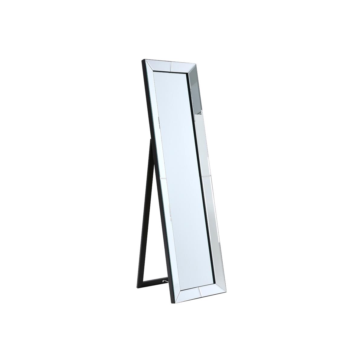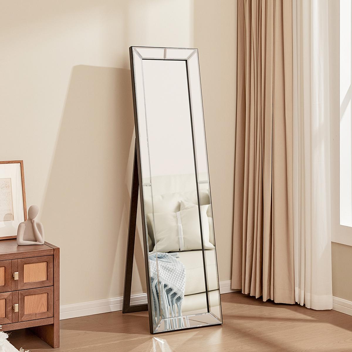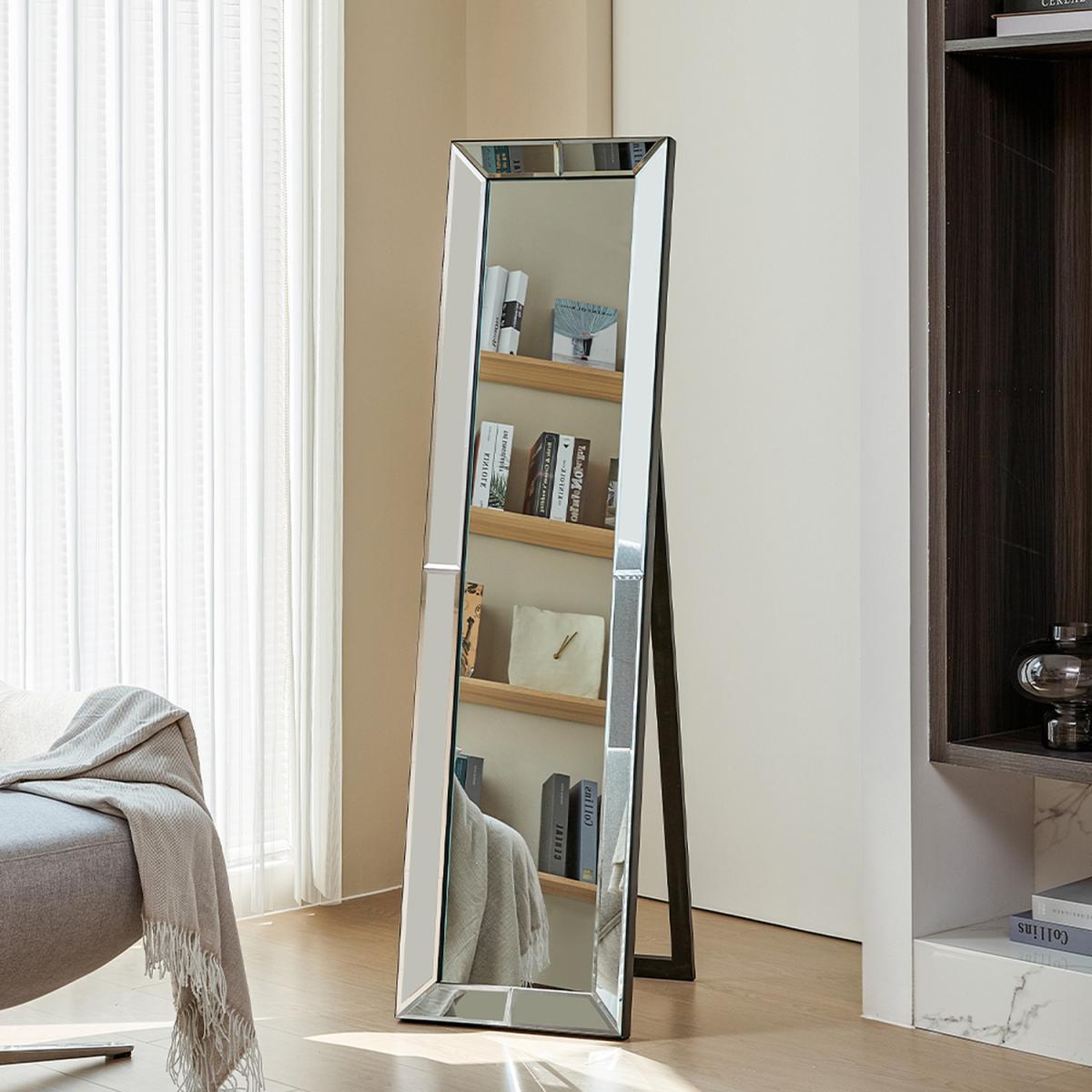 I love this chrome-beveled floor mirror for its sleek, contemporary look that can instantly update any room. It works particularly well in modern and minimalist interiors, adding a reflective surface that enhances natural light and creates a sense of space. For styling tips, try positioning it in a neutral-toned bedroom or hallway to serve as a statement piece without overpowering the decor. Its full-length feature makes it practical for dressings and outfit checks, while its slim profile ensures it doesn’t dominate the space. To keep it looking sharp, pair it with metallic accents or glass accessories to create a cohesive, polished look in your interiors.