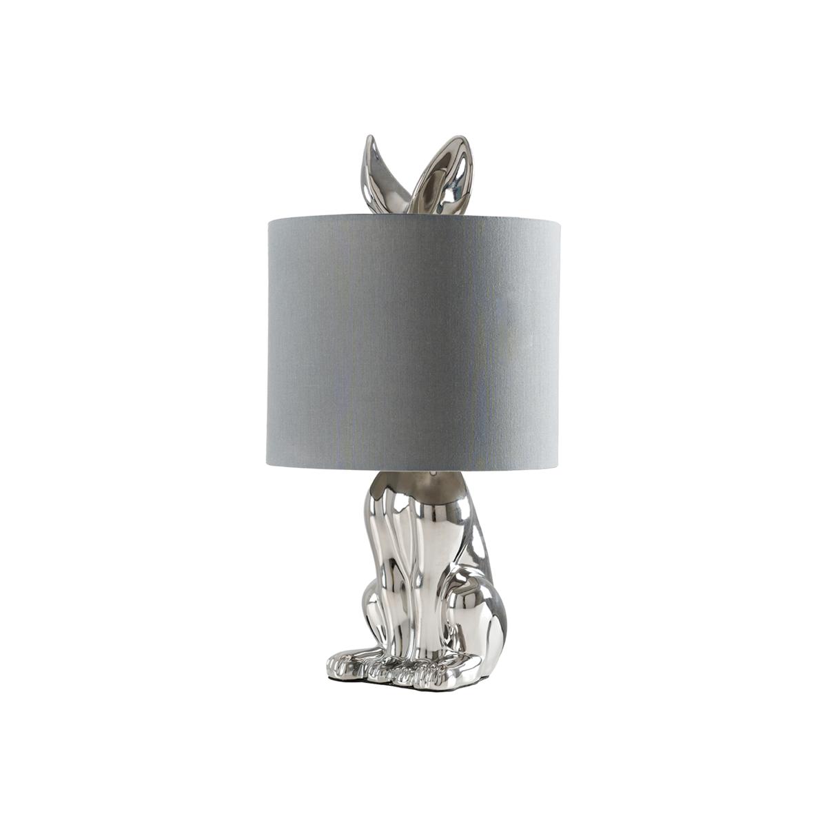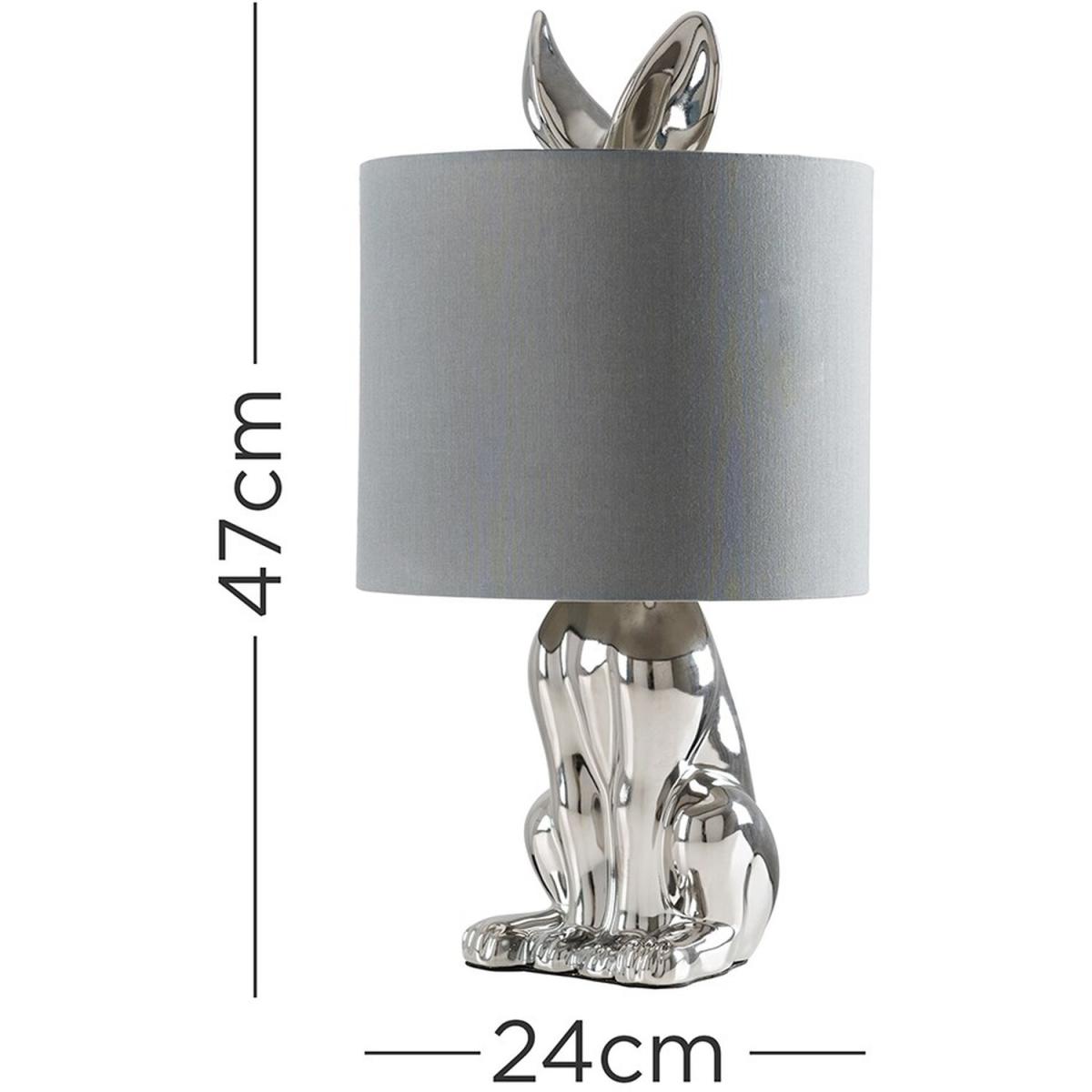 Modern Rabbit Hare design table lamp in a silver polished chrome effect ceramic finish, complete with a grey fabric cylinder light shade. Features an in-line switch for easy use. This lamp is a great way to add style and some extra light to a room. Ideal for lounges, bedrooms and other living areas.