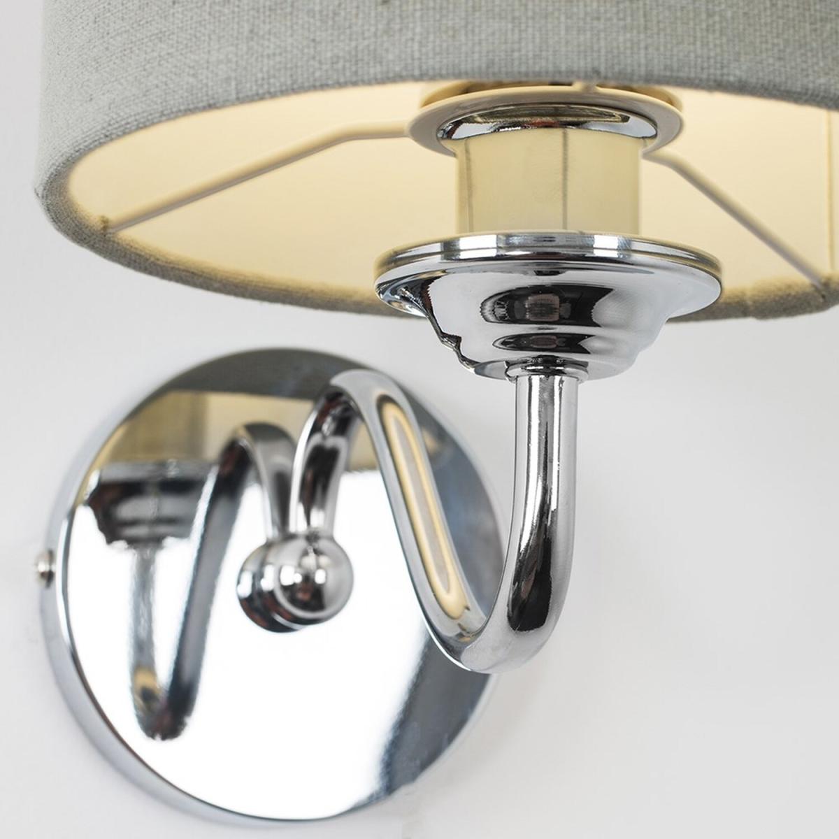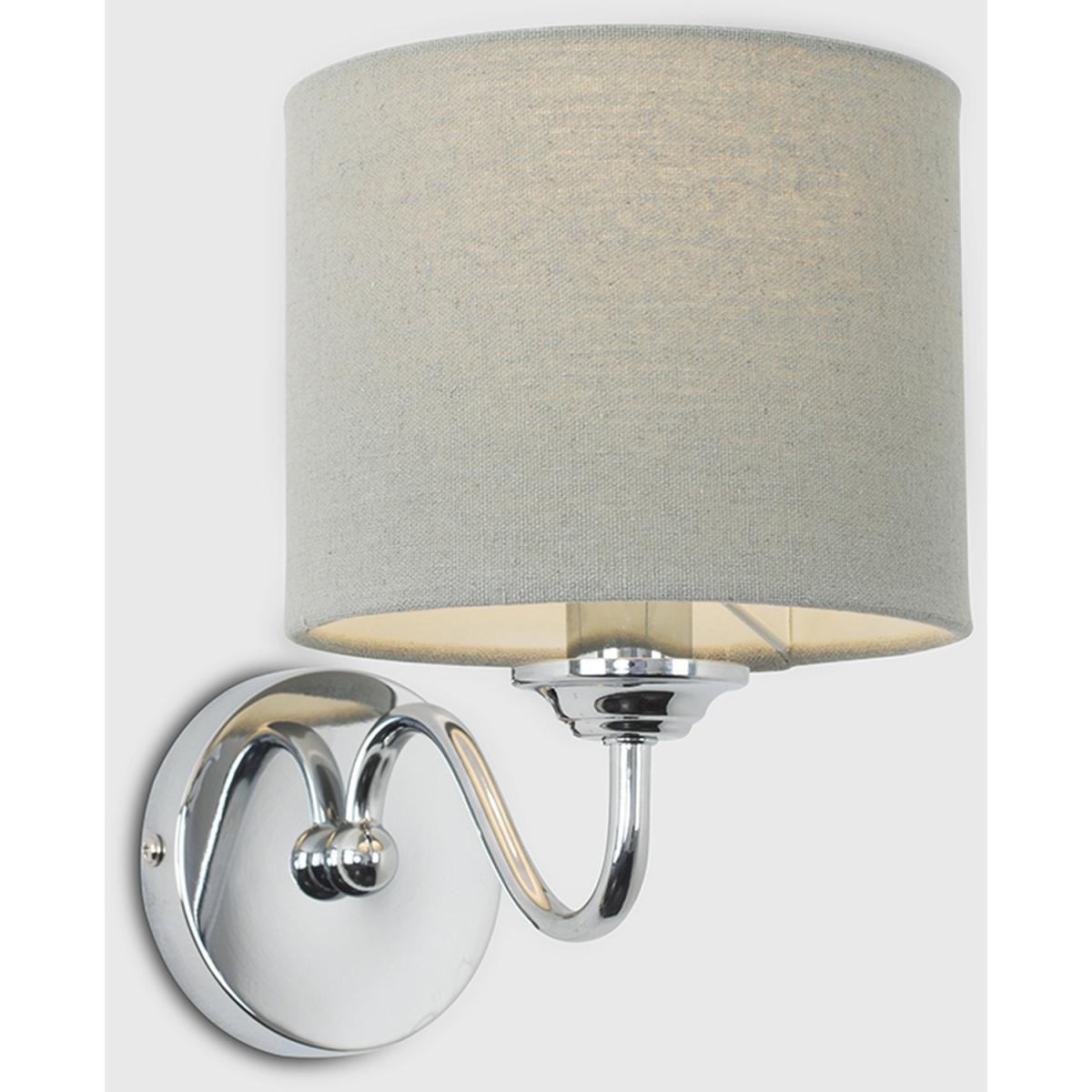 PModern curved arm wall light fitting in a brushed chrome metal finish, complete with a grey linen drum shade. This contemporary wall light is a great way to add extra light to lounges, dining rooms, hallways and bedrooms. Wall lights are a great way to bring additional lighting to a room and are particularly useful to illuminate a dull alcove. Ideal to have on either side of the bed to give yourself a classic hotel feel!p