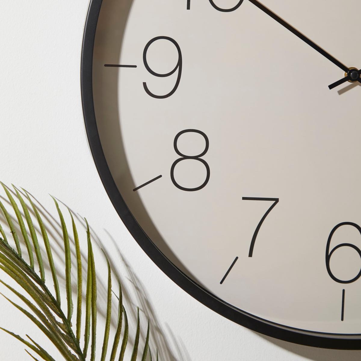 Minimalistic in design, this black framed wall clock is crafted in a classic design and features large easy to read numbers. 1 x AA battery required.