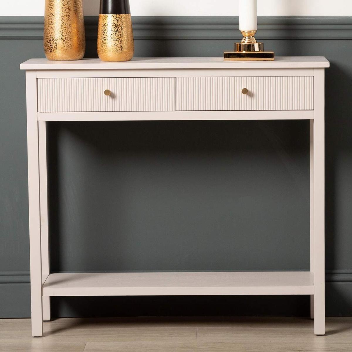 Introduce functionality and style to your living room with our console table, a versatile piece of furniture. This table features 2 drawers, providing convenient storage for keys, mail, or other essentials in your hallway. Crafted with sturdy materials, it ensures durability and longevity. Elevate your living room decor with this practical and elegant addition, perfect for creating a welcoming ambiance. Enhance your living space with this elegant console table, crafted to perfection for both style and functionality. Its sleek design and compact size make it ideal for any hallway or living room setting. Featuring two convenient drawers, this table offers ample storage space to keep your essentials organized and easily accessible. Whether used for displaying decor or as a practical surface for keys and mail, this console table effortlessly combines form and function to elevate your home decor. Welcome guests with sophistication and charm with this versatile addition to your furniture collection.