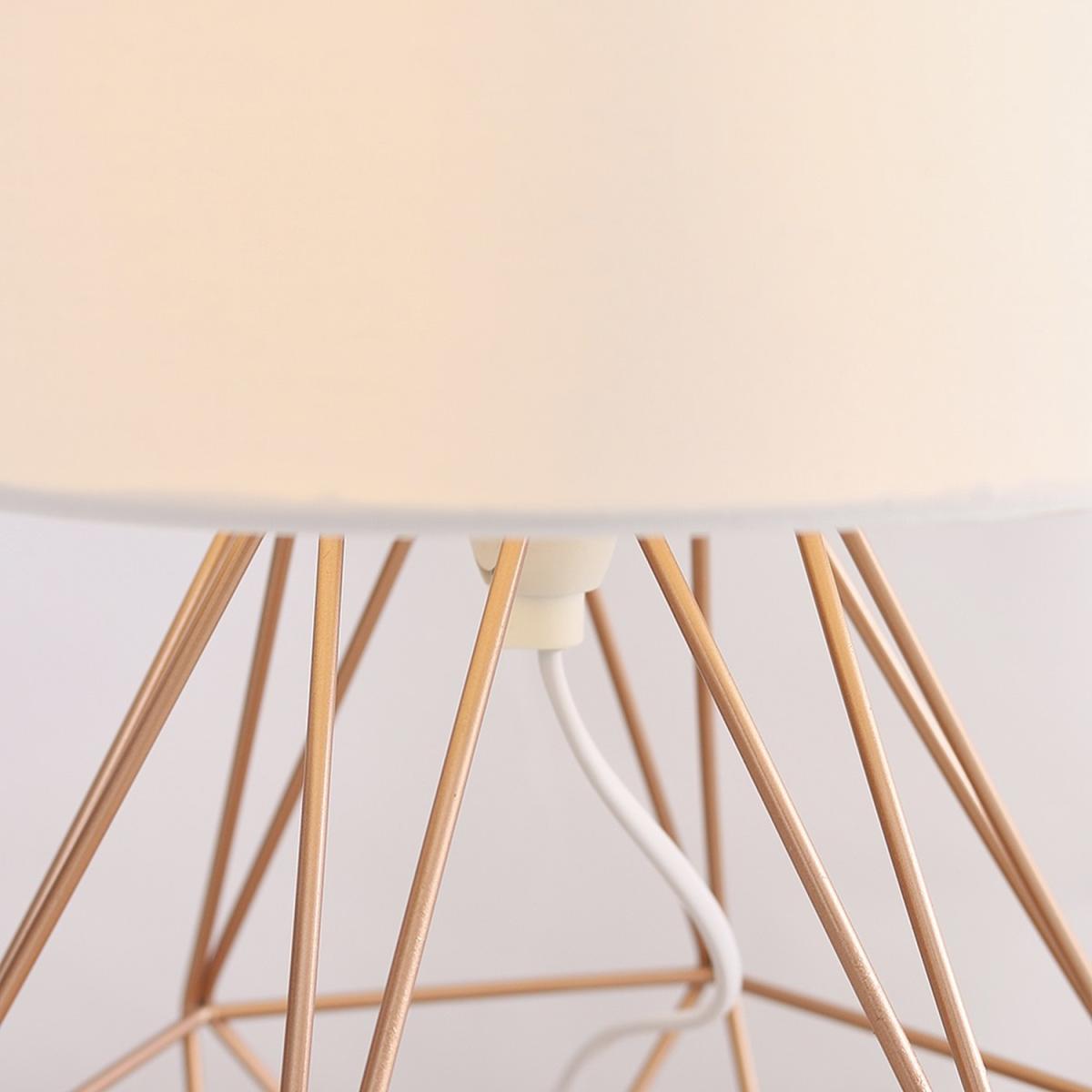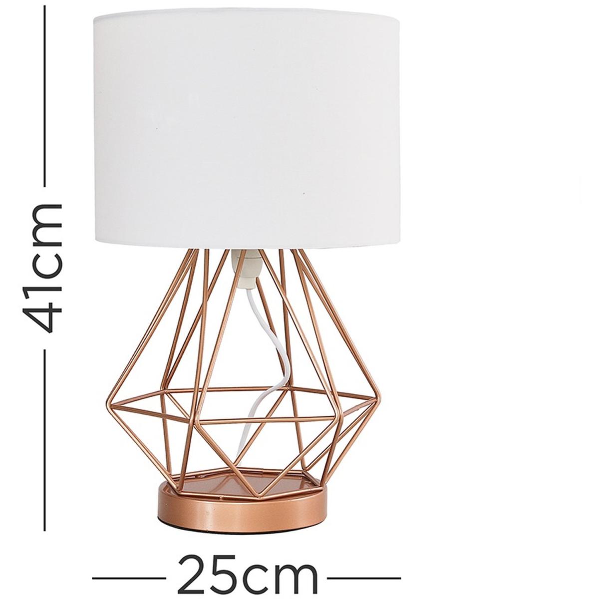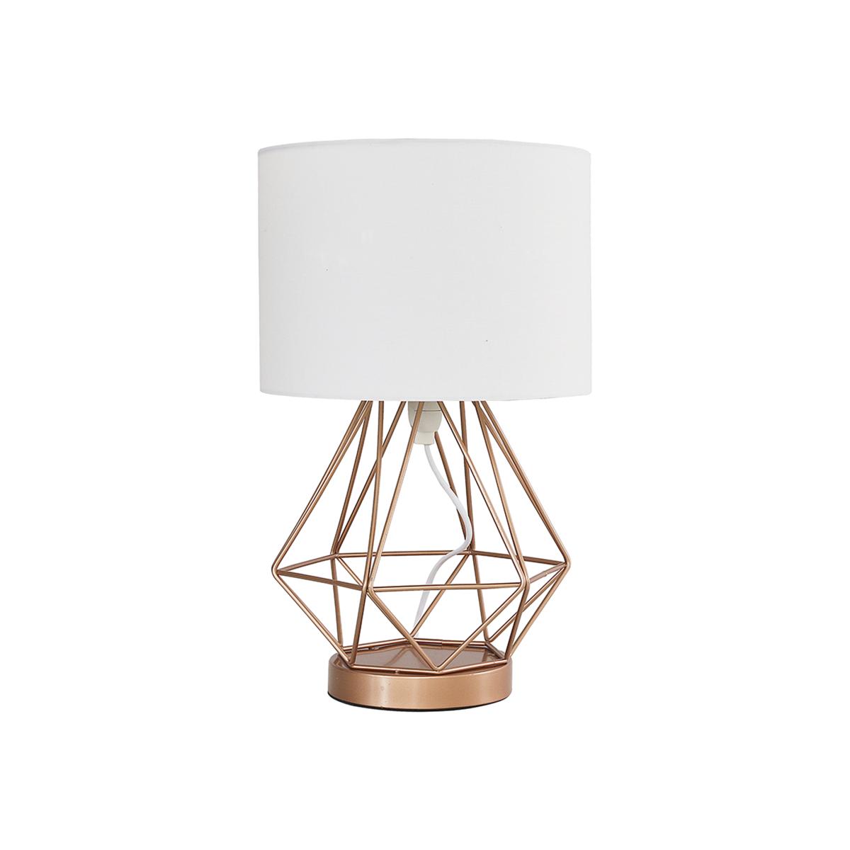 Modern geometric style touch table lamp in a copper effect finish, complete with a white fabric cylinder shade. Simply touch the metal base to turn it on. The light can be set to 4 stages, off, a low level light for mood lighting, a medium level light for general lighting and a high level light which is the brightest setting to create an intense pool of light. This contemporary table lamp is a great way to brighten up any room in your home. Its simply yet stylish design will add a minimalist touch to your living space. Ideal for use in lounges, hallways, bedrooms and other living areas.