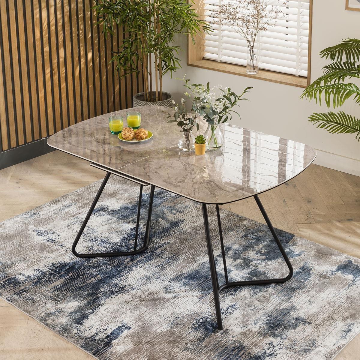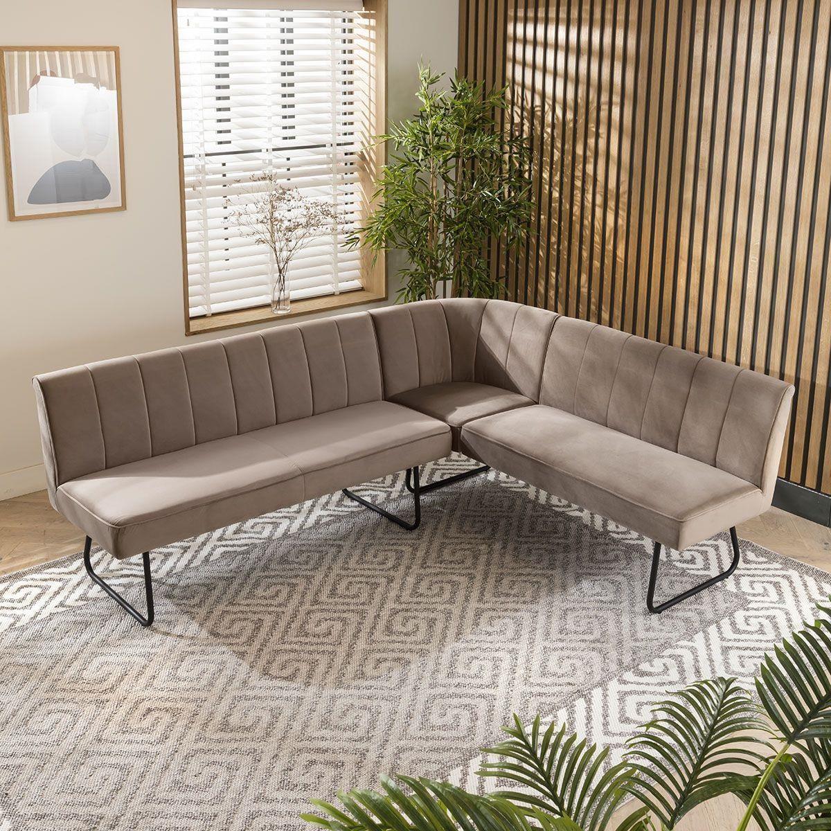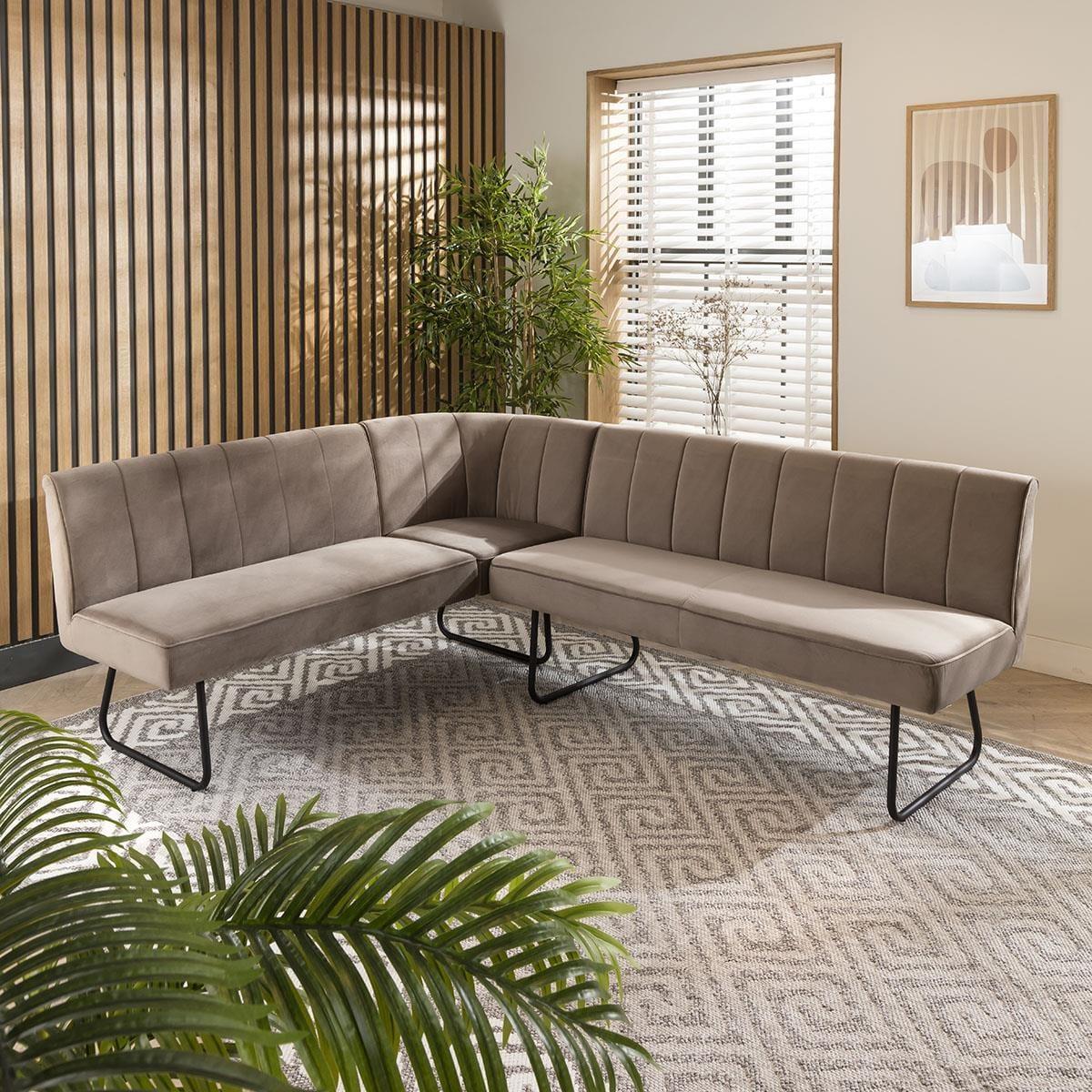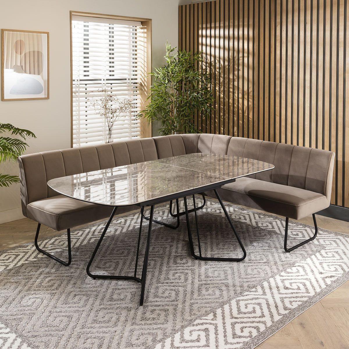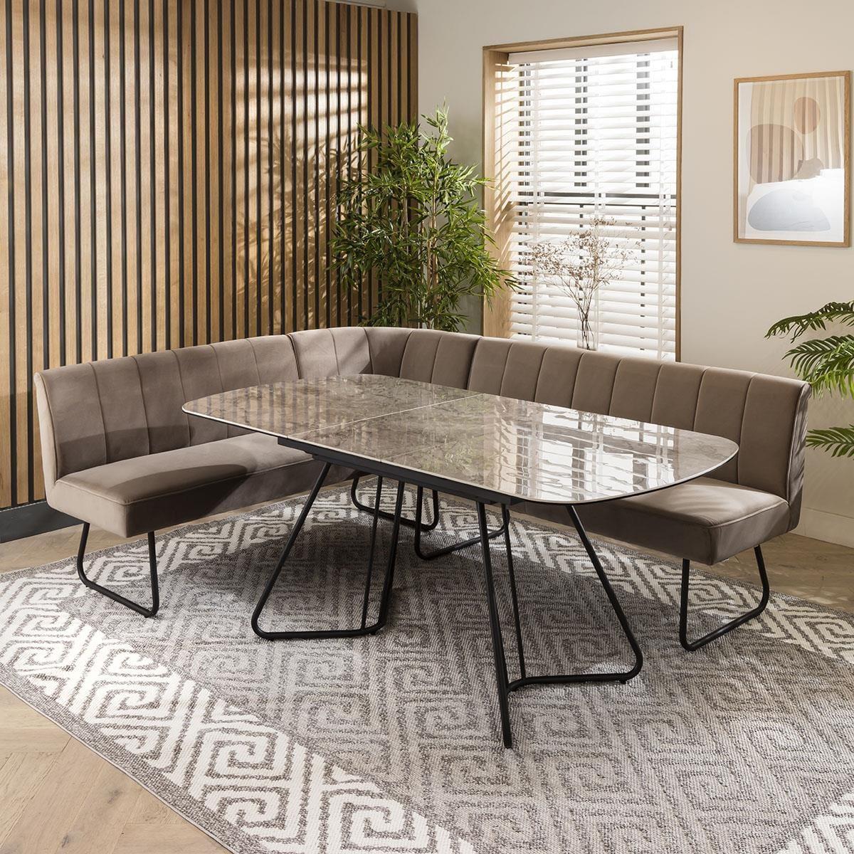 The Deco Corner Dining Bench Set is a versatile and stylish seating solution for any dining space. This corner bench set can comfortably seat up to 5 people. Bench dining sets offer a perfect gathering spot for friends and family. Premium mink velvet upholstery adds a touch of luxury, for an extra inviting atmosphere. Crafted with attention to detail, our Corner Dining Bench Set features a sleek black powder-coated tubular frame. You can easily configure it to fit your space by choosing between left or right-hand placement. This adaptability allows you to optimise your dining area, no matter the size or layout of your room. The soft cushioning enhances the overall comfort, allowing you to enjoy a relaxed and enjoyable dining experience every time. The Deco dining table is a perfect blend of functionality and style. With its auto-lift feature, extending the table has never been easier. Simply pull one side, and watch as the extension effortlessly pops up into place, giving you extra space in a matter of seconds. Crafted with utmost precision, this table boasts a premium grey ceramic top with a captivating glossy marble-effect finish. Not only does it exude elegance, but it also offers remarkable durability. The scratch, heat, and stain-resistant ceramic ensures that your table remains in pristine condition for years to come, even with everyday use. This corner dining bench set includes the dining bench & table. Matching chairs are also available with the same luxurious cushioning and matching premium upholstery, the matching set will add touch of opulence to any space. W174cm D212cm H82cm Seat Height 49cm Seat Depth 46cm Corner Dining Bench with Ceramic Marble Extending Dining Table
