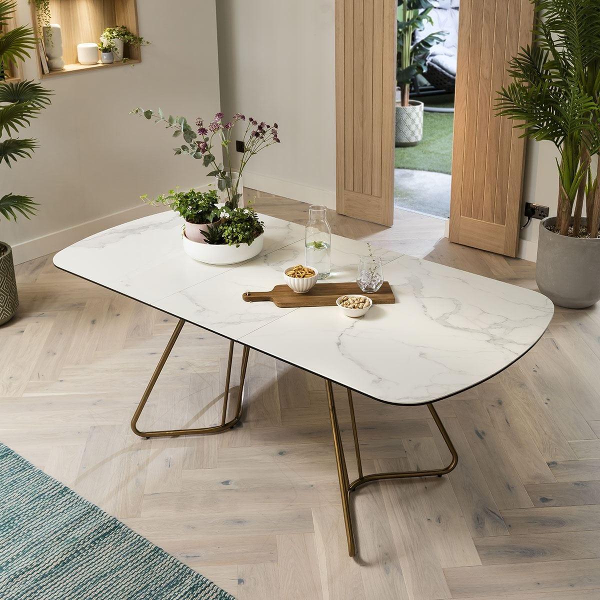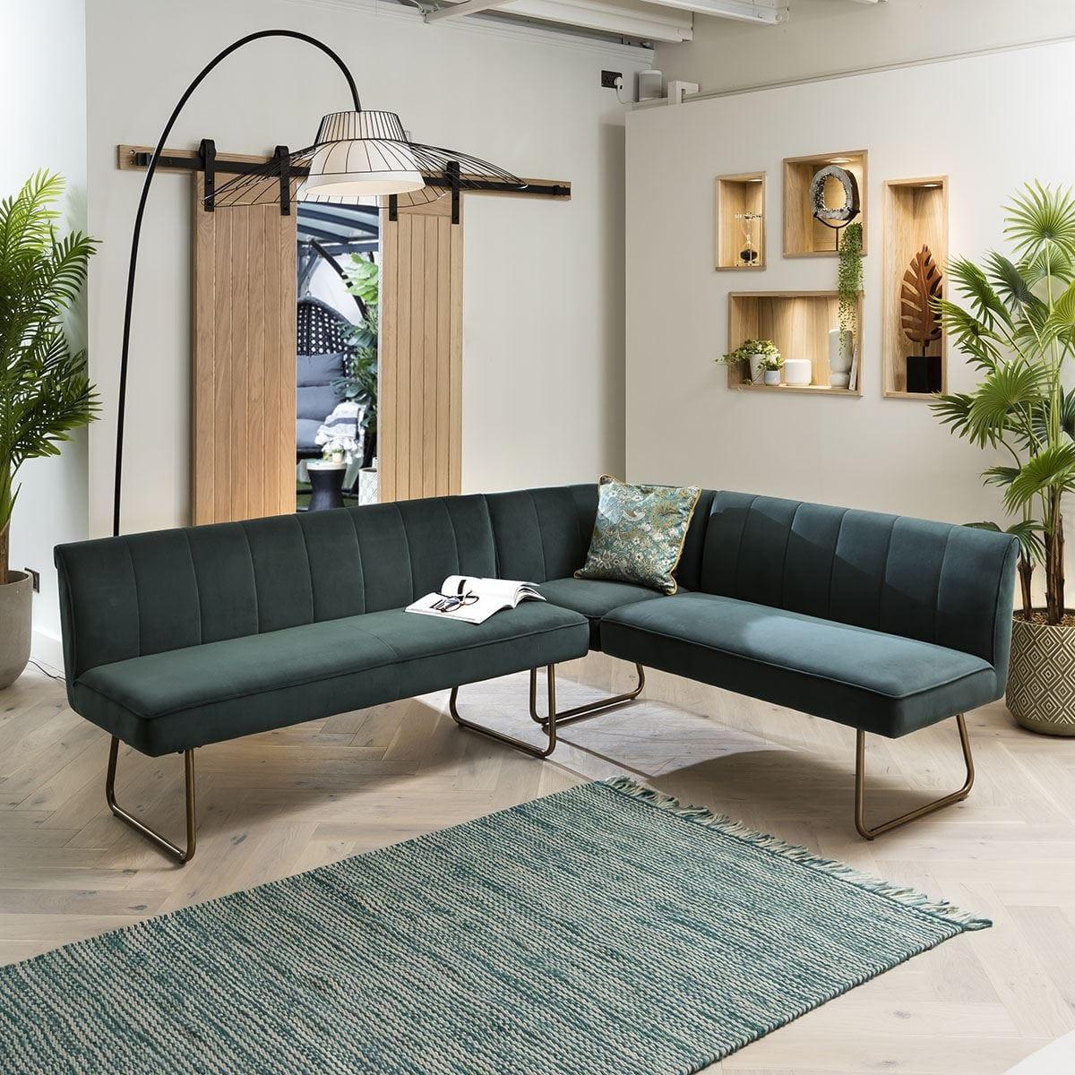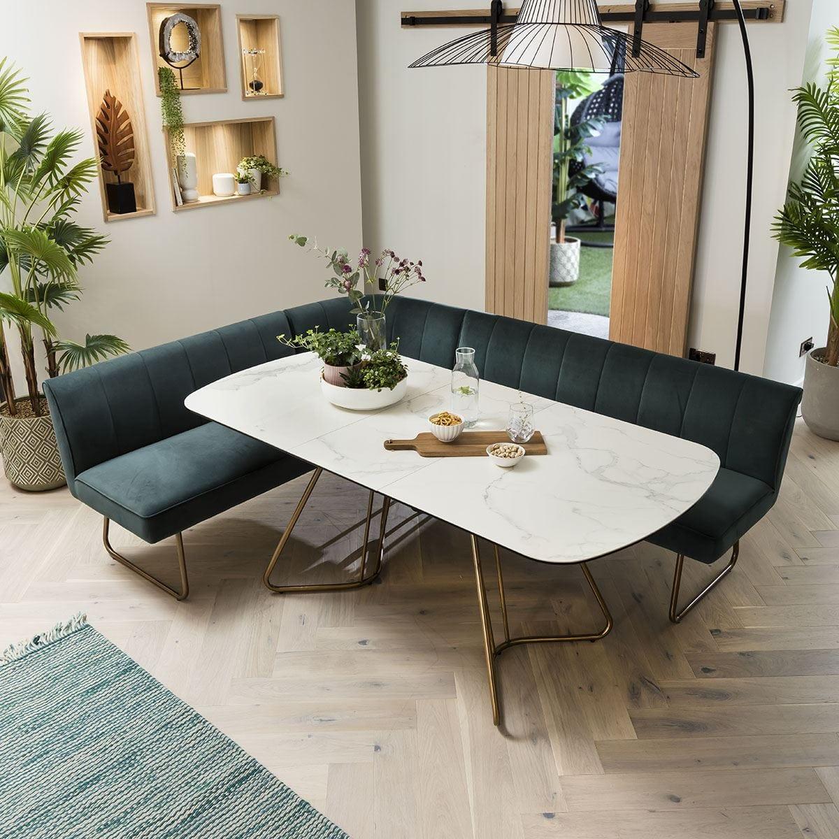 The Deco Corner Dining Bench Set is a versatile and stylish seating solution for any dining space. This corner bench set can comfortably seat up to 5 people. Bench dining sets offer a perfect gathering spot for friends and family. Premium teal velvet upholstery adds a touch of luxury, for an extra inviting atmosphere. Crafted with attention to detail, our Corner Dining Bench Set features a sleek brass coloured metal tubular frame. You can easily configure it to fit your space by choosing between left or right-hand placement. This adaptability allows you to optimise your dining area, no matter the size or layout of your room. The soft cushioning enhances the overall comfort, allowing you to enjoy a relaxed and enjoyable dining experience every time. The Deco dining table is a perfect blend of functionality and style. With its auto-lift feature, extending the table has never been easier. Simply pull one side, and watch as the extension effortlessly pops up into place, giving you extra space in a matter of seconds. Crafted with utmost precision, this table boasts a premium white ceramic top with a captivating textured matte marble-effect finish. Not only does it exude elegance, but it also offers remarkable durability. The scratch, heat, and stain-resistant ceramic ensures that your table remains in pristine condition for years to come, even with everyday use. This corner dining bench set includes the dining bench & table. Matching chairs are also available with the same luxurious cushioning and matching premium upholstery, the matching set will add touch of opulence to any space. W230cm D180cm H76cm Seat Height 49cm Seat Depth 46cm Corner Dining Bench with Ceramic Marble Extending Dining Table