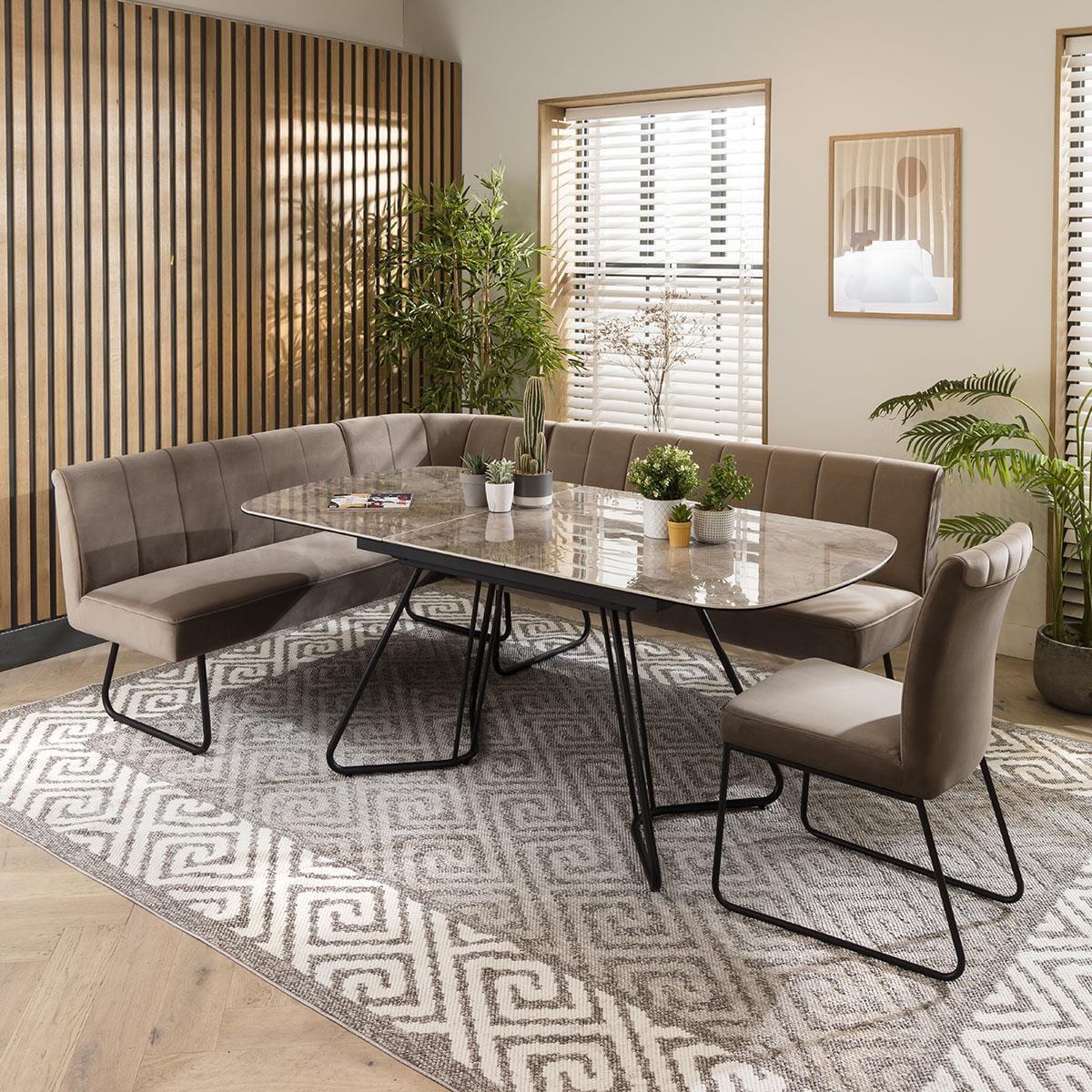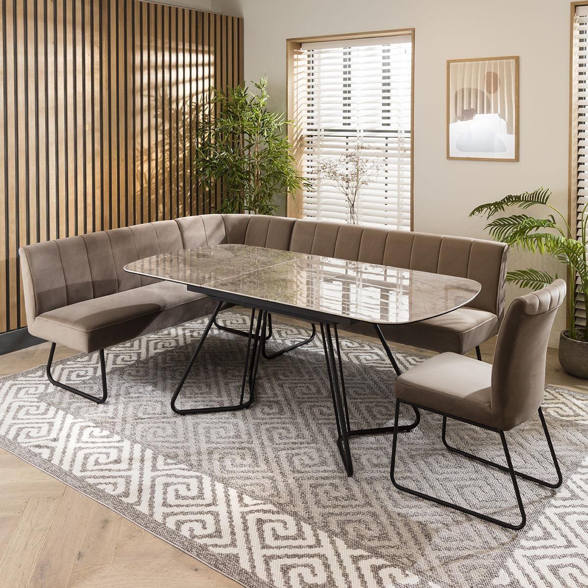 The Deco Corner Dining Bench Set is a versatile and stylish seating solution for any dining space. This corner bench set can comfortably seat up to 6 people. Bench dining sets offer a perfect gathering spot for friends and family. Premium mink velvet upholstery adds a touch of luxury, for an extra inviting atmosphere. Crafted with attention to detail, our Corner Dining Bench Set features a sleek black powder-coated tubular frame. You can easily configure it to fit your space by choosing between left or right-hand placement. This adaptability allows you to optimise your dining area, no matter the size or layout of your room. The soft cushioning enhances the overall comfort, allowing you to enjoy a relaxed and enjoyable dining experience every time. The Deco dining table is a perfect blend of functionality and style. With its auto-lift feature, extending the table has never been easier. Simply pull one side, and watch as the extension effortlessly pops up into place, giving you extra space in a matter of seconds. Crafted with utmost precision, this table boasts a premium grey ceramic top with a captivating glossy marble-effect finish. Not only does it exude elegance, but it also offers remarkable durability. The scratch, heat, and stain-resistant ceramic ensures that your table remains in pristine condition for years to come, even with everyday use. This corner dining set includes 1 dining chair, a perfect addition to elevate your dining experience. With elegant line tufting detail on the backrest, this chair exude sophistication and style. Inspired by the timeless beauty of the deco era, the range effortlessly blend vintage charm with modern aesthetics. W174cm D212cm H82cm Seat Height 49cm Seat Depth 46cm Corner Bench Dining Set with Ceramic Marble Table including 1 chair