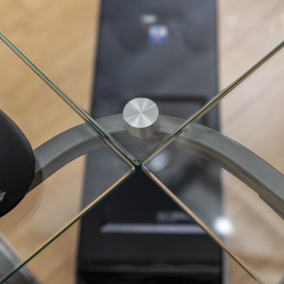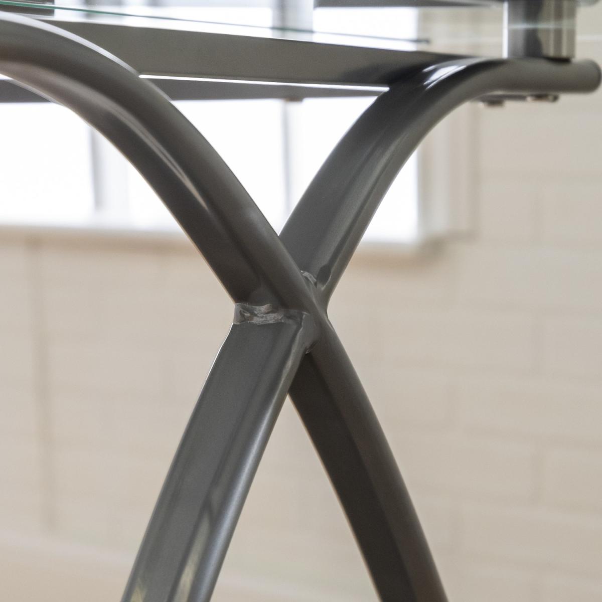 Dimensions H74 x W130 x D51 cm Features. With a polished and bevelled tempered safety glass tabletop. A durable steel metal frame has a powder-coated finish in a curved design. Includes a universal autonomous CPU stand and keyboard tray. Each section of the computer desk can support up to 100 pounds. With a modern and contemporary style to complement any décor style Easy assembly..