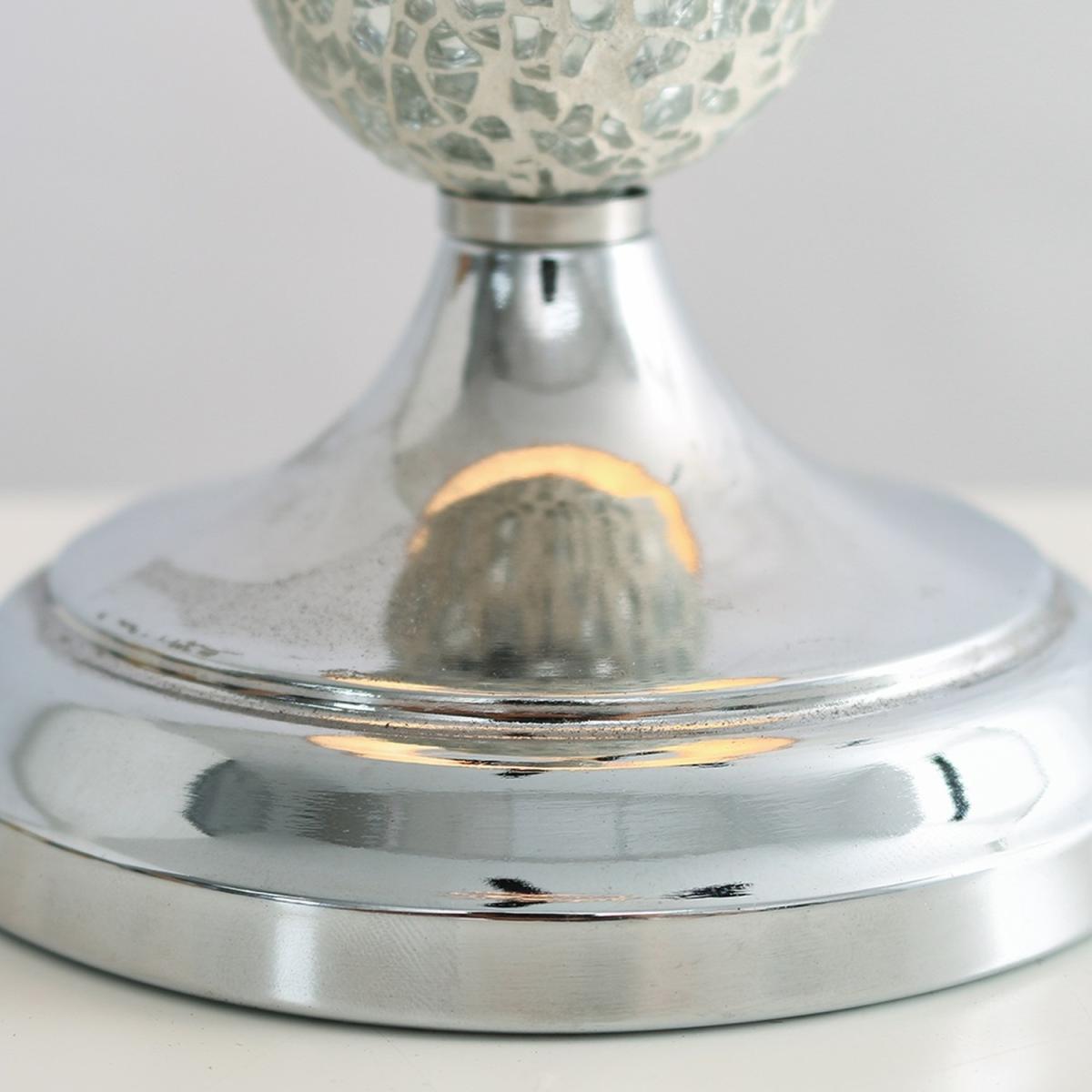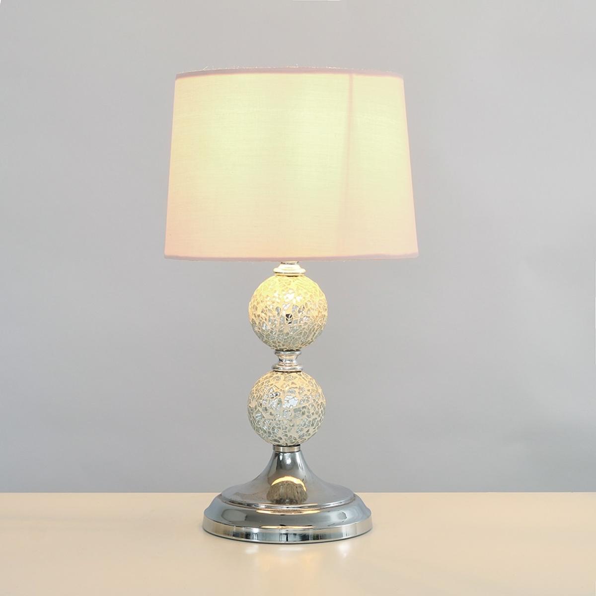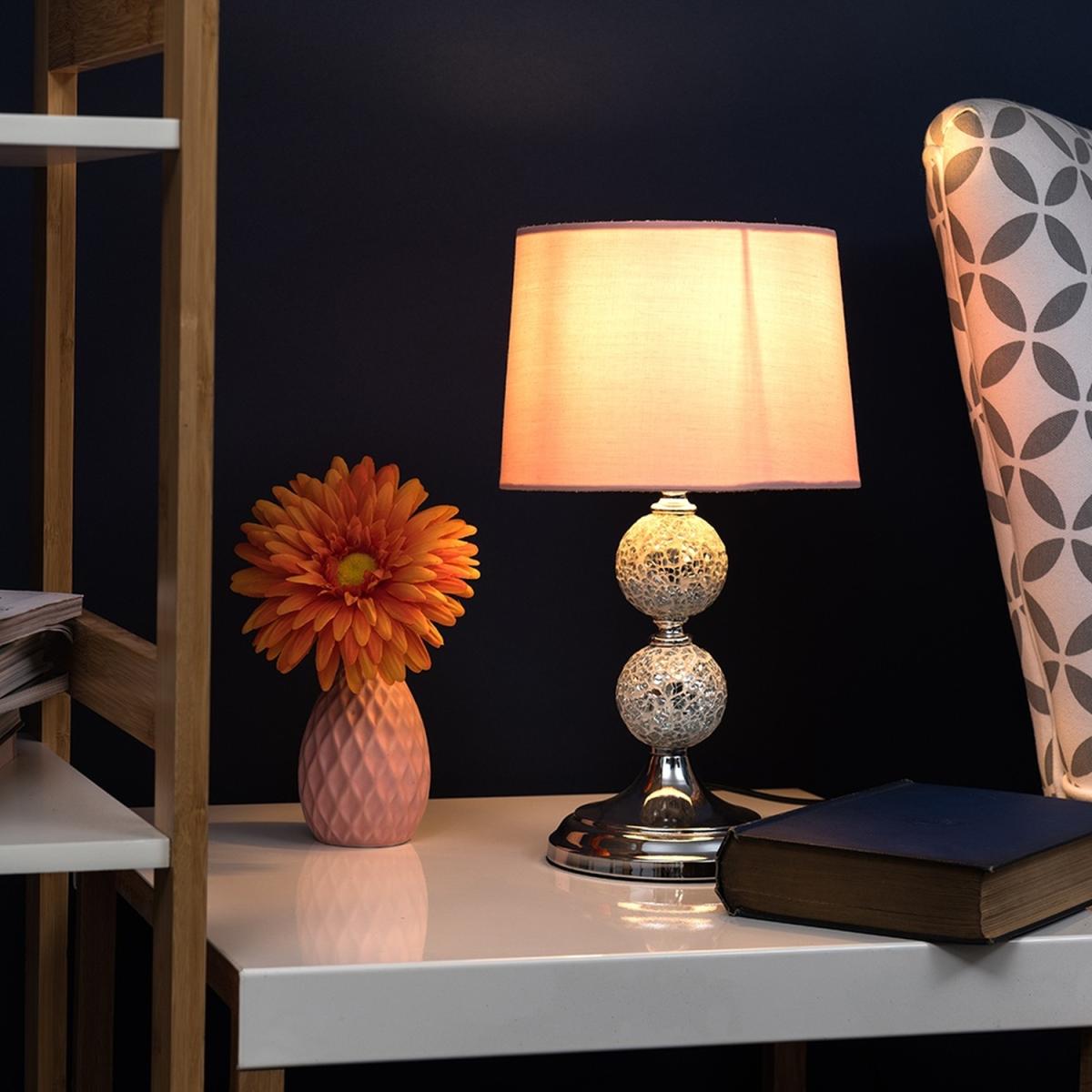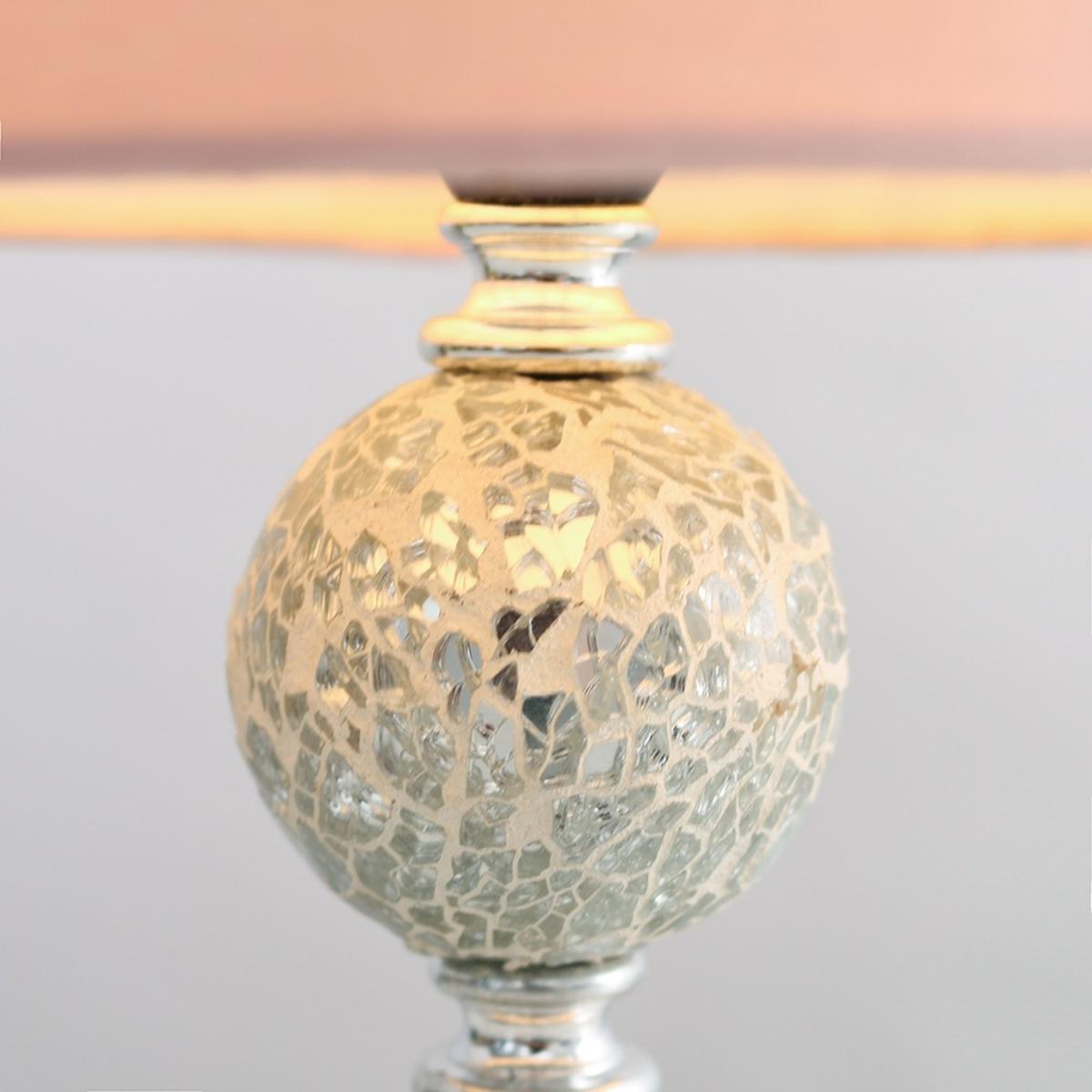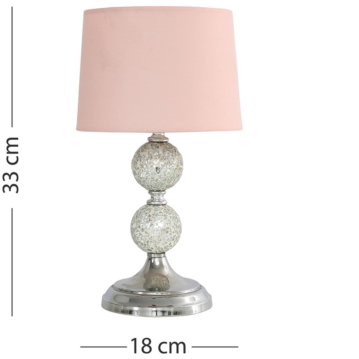 Modern decorative polished chrome crackle glass mosaic ball design table lamp, complete with a pink tapered light shade. Features an in-line onoff switch for easy use. Table lamps are a great way to bring additional lighting to a room or you can use them to reduce your main light output, and create a more relaxing moodatmosphere. Ideal for bedside tables, lounges and other living areas.