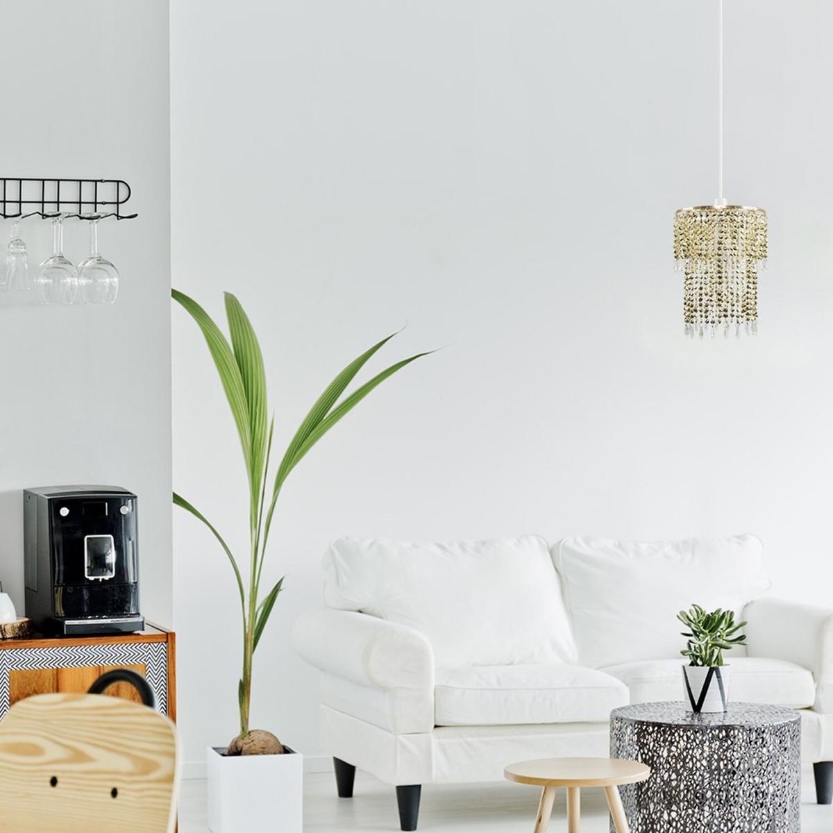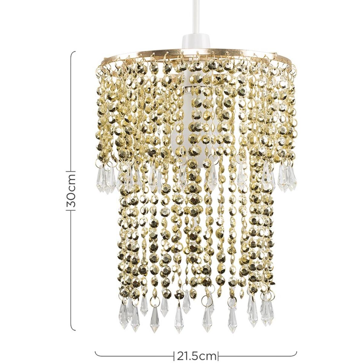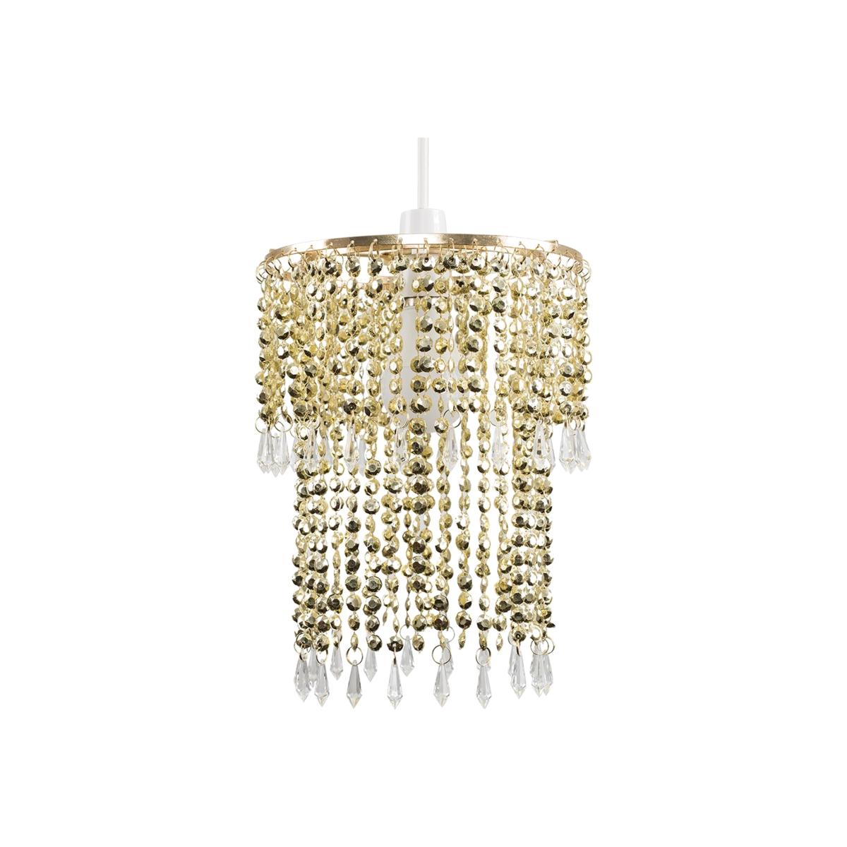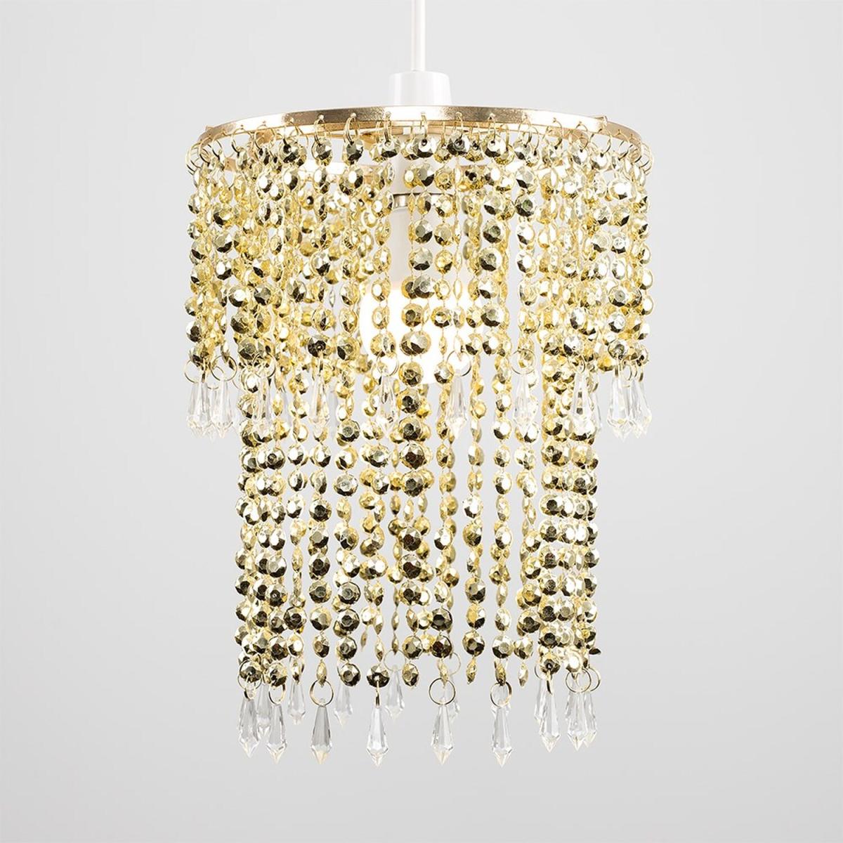 Decorative ceiling pendant light shade in a gold effect metal finish. Features suspended gold coloured acrylic jewel droplets which reflect the light to cast beautiful patterns throughout the room. Ideal for living rooms, bedrooms, hallways and other areas in the home. Easily fits to your standard ceiling light socket so no electrical installtion is required.