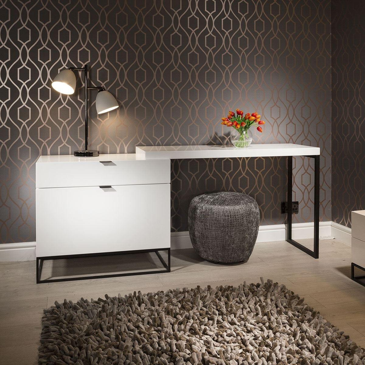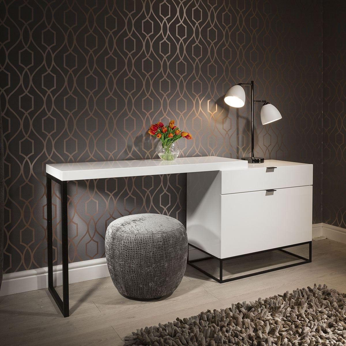 Quatropi Design Studios Beautiful White Gloss Desk / Dressing Table. Extremely high quality stunning design. 2 Drawer chest with 1200mm wide desk top + 800mm wide drawer section ( can be made short by sliding the top further onto the drawers ) Spread the cost our with interest-free finance options. Minimum spend applies. W200cm D42cm H75cm Modern Design Premium Quality Furniture