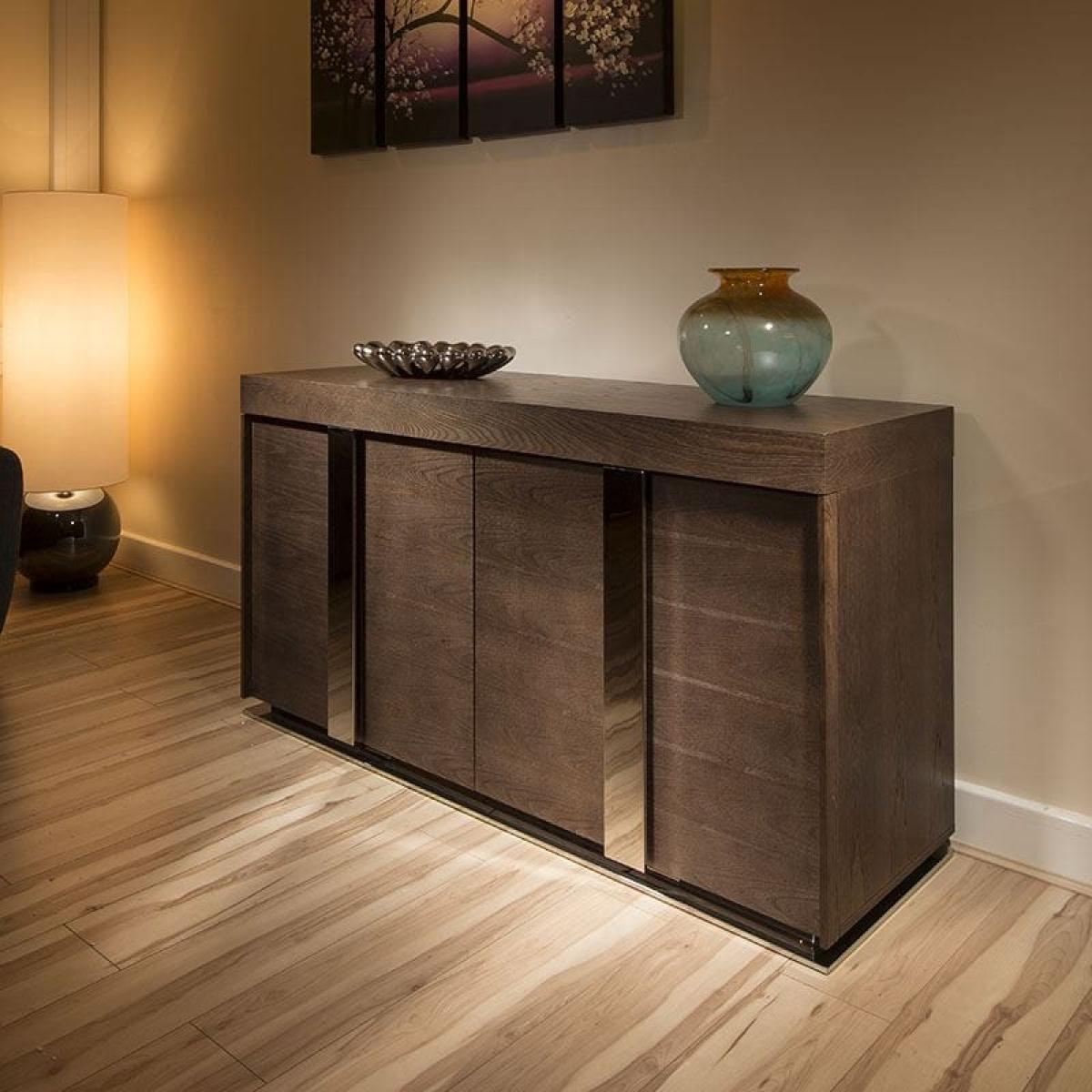 Modern Rich Elm Sideboard / Cabinet / Buffet 1.6mtr 912 M. A Great Addition to any Living Room, Office Or Dinning room. Features include extra deep chunky top (95mm) and stainless steel base and trim. There are 4 doors with a single shelf behind each. Wonderful German build quality.