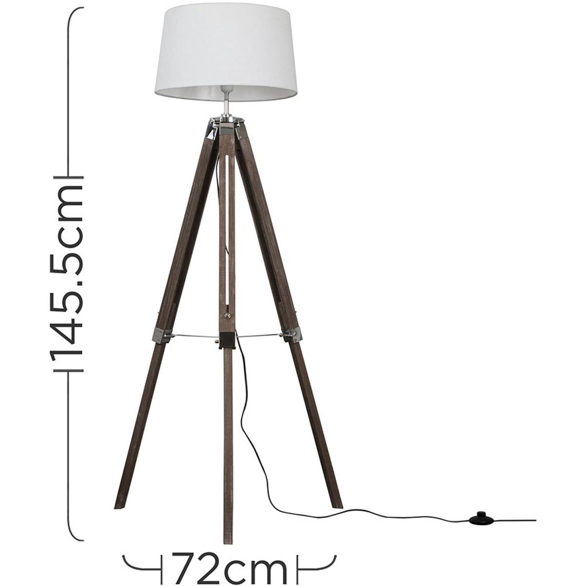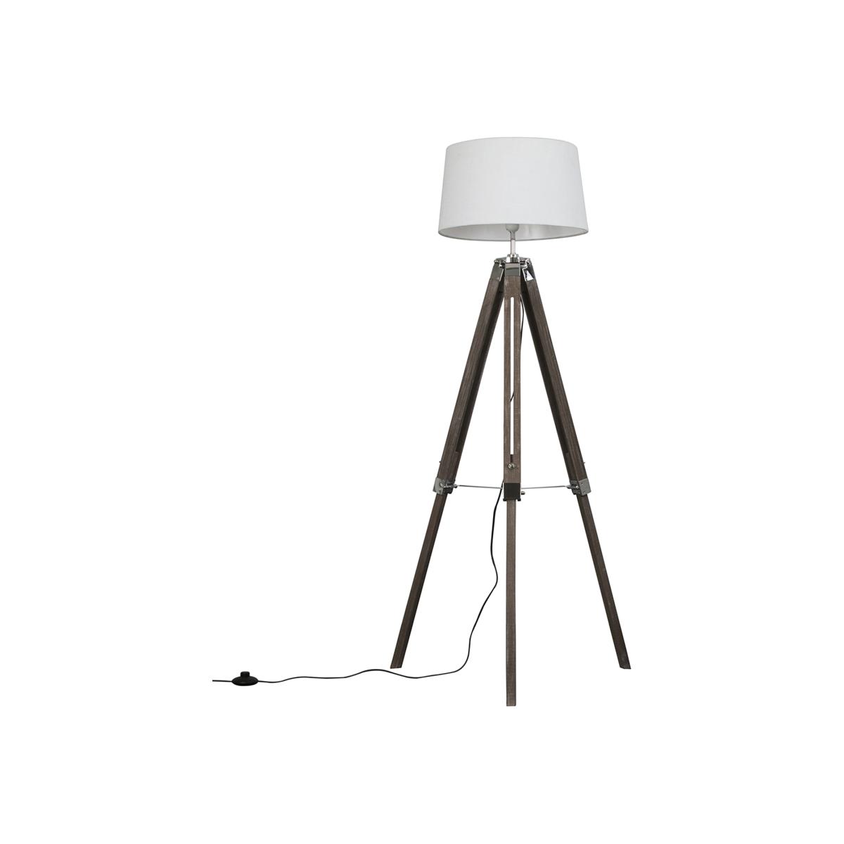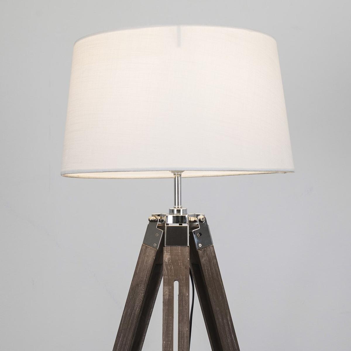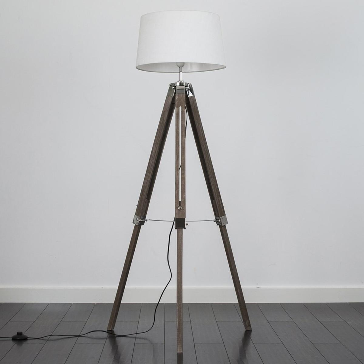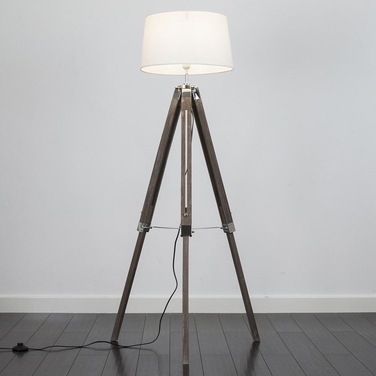 Modern tripod style floor lamp in a distressed wood effect and silver chrome finish, which features an in-line onoff switch for easy use. Comes complete with a tapered shade in a white faux linen fabric finish. Floor lamps are a great way to bring additional lighting to a room or you can use them reduce your main light output, and create a more relaxing moodatmosphere. An instant update, you can change your room style in seconds.