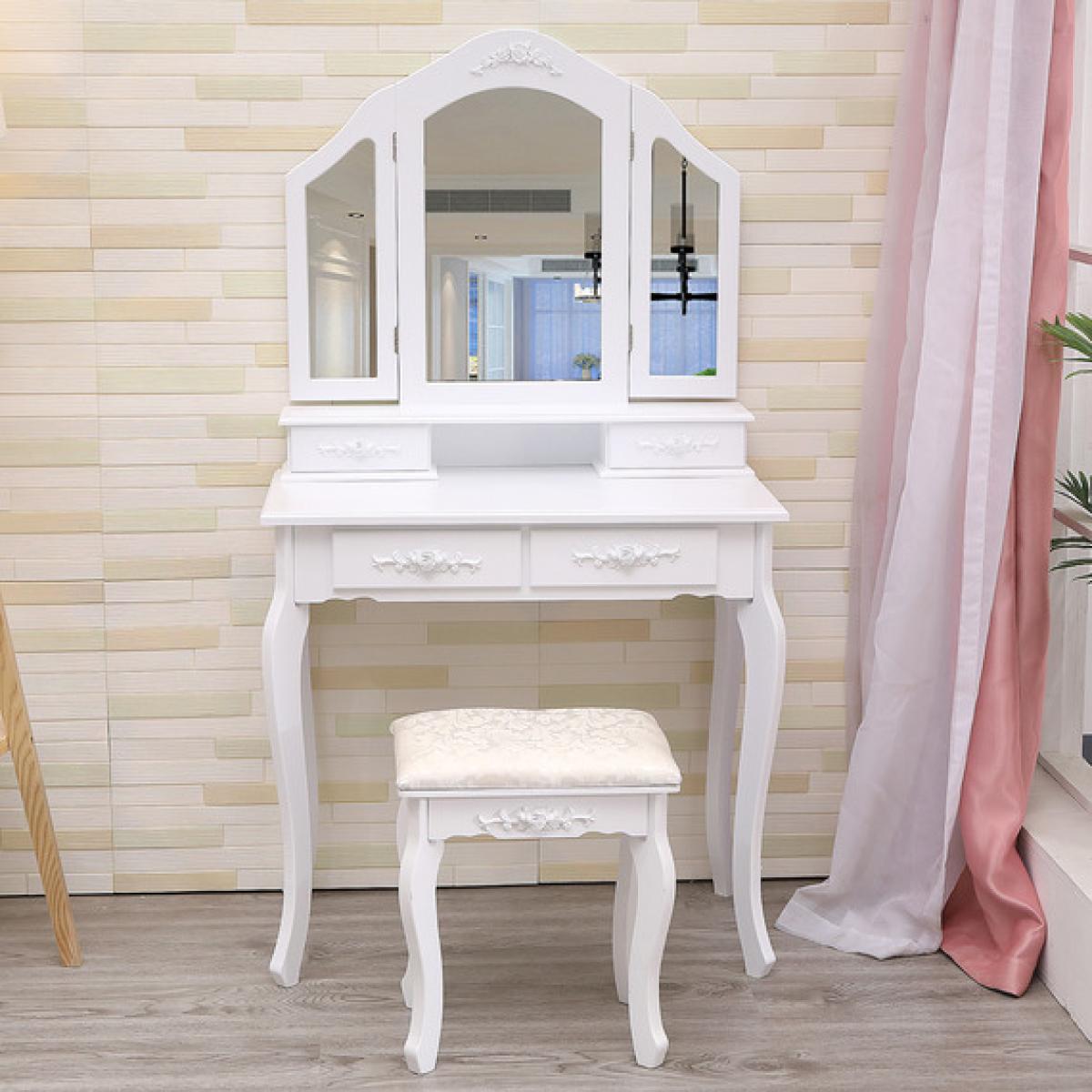 Modern Dressing Table Vanity Stool Set With 3 Foldable Makeup Mirror 4 Drawers - White