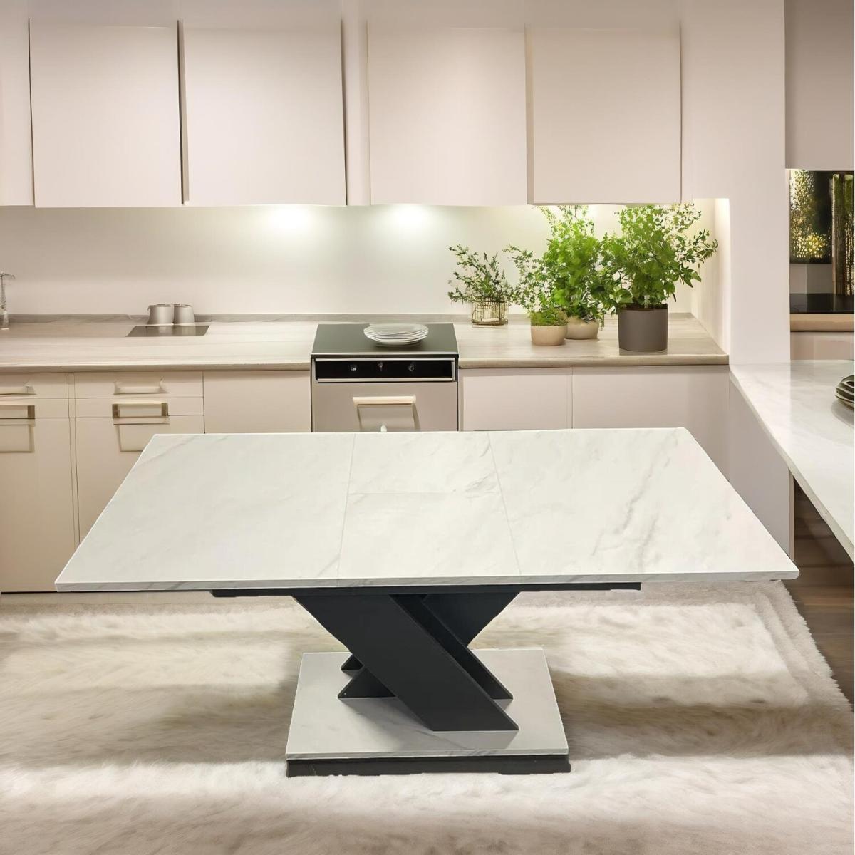 Crafted from MDF with a sleek marble effect finish, this dining table features a stylish grey V-shape leg design, ensuring both durability and contemporary charm. Easily accommodate your guests with the extendable design, allowing the table to expand from 120cm to 160cm. When not used, the tabletop leaves can be conveniently tucked away below, making it suitable for up to 8 persons when fully extended. With dimensions of 120-160cm in length, 80cm in width, and 75cm in height, this table provides ample space for dining while maintaining a sleek and compact profile. The marble effect finish lends a distinctly modern look to this dining table, adding a touch of sophistication to any dining space. Assembly is a breeze with the included picture instructions, allowing you to enjoy your new table in no time.