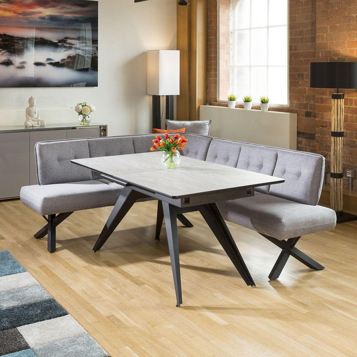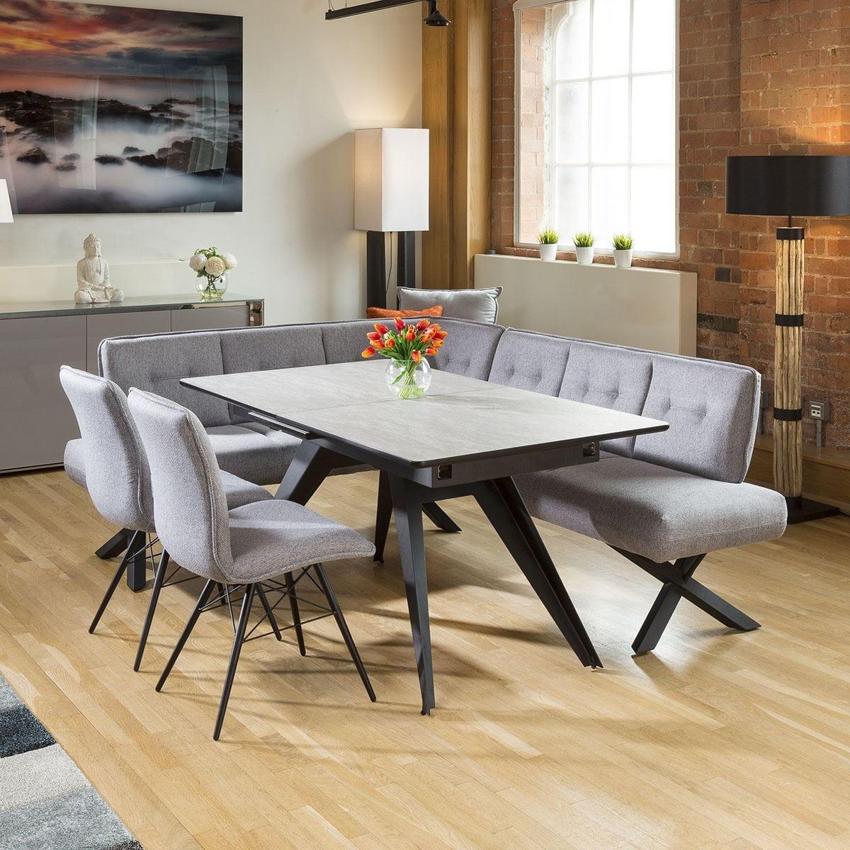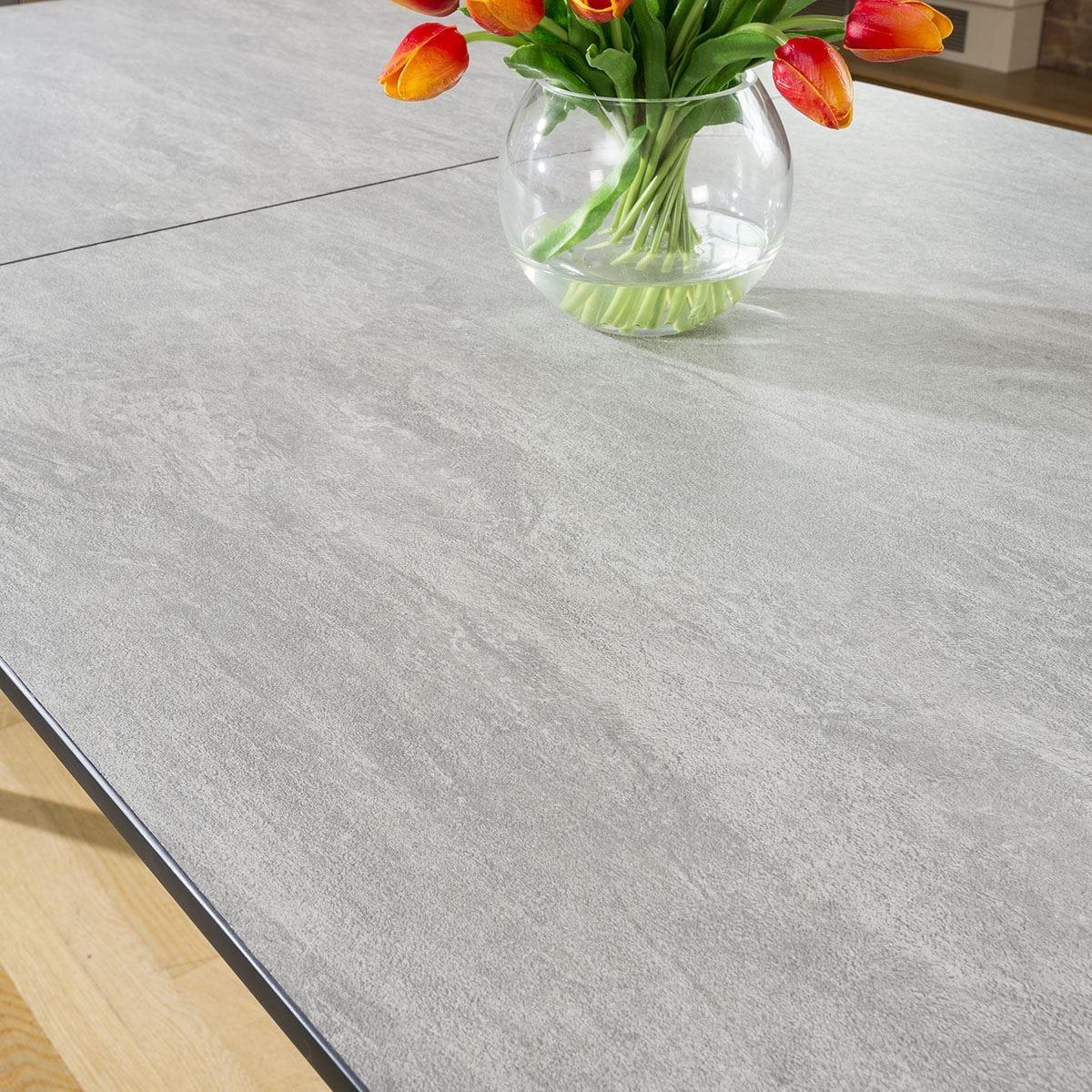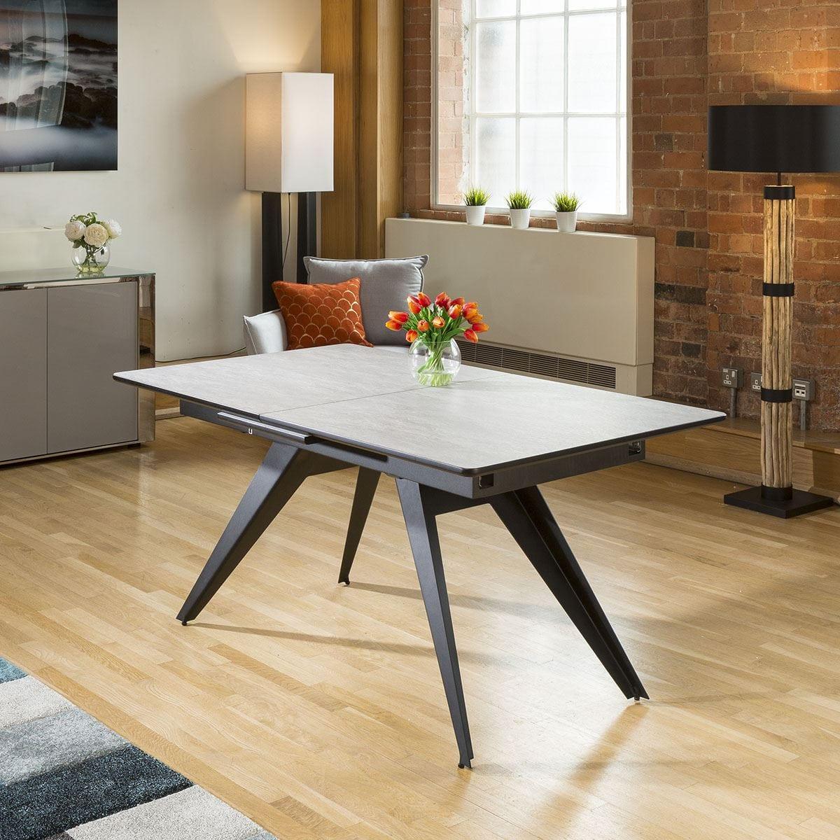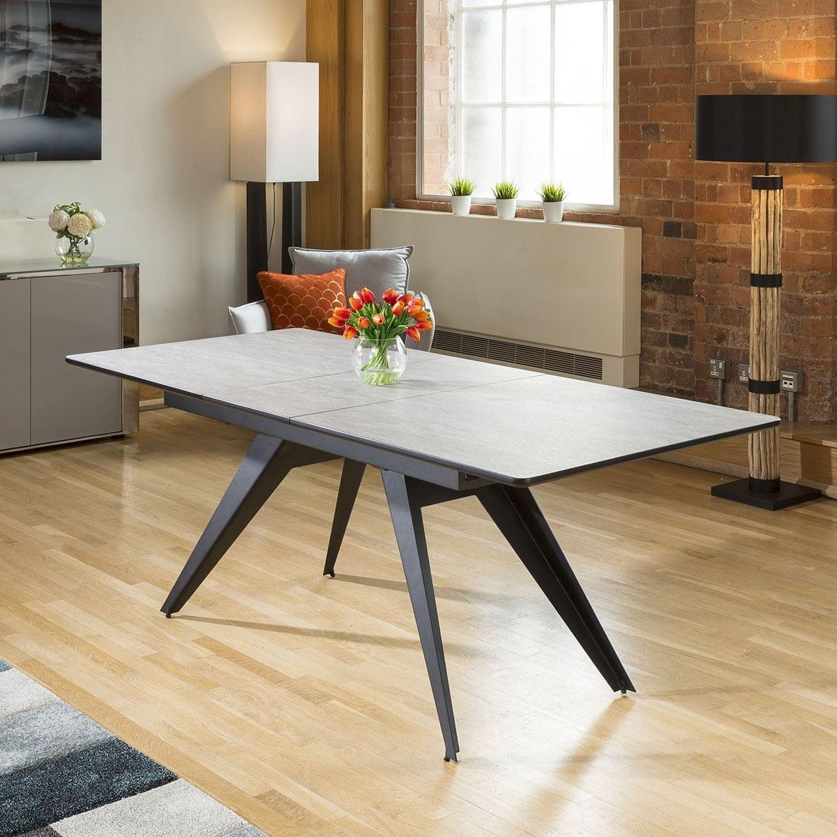 High Quality Large Rectangular Modern Extending Dining Table 1600mm - 2000mm Concrete Effect Wooden Top and Black Steel legs. Superb quality with high specification ultra-durable finish. Very smooth self stowing extending leaf. Spread the cost our with interest-free finance options. Minimum spend applies. W220cm D90cm H76cm Modern Design Premium Quality Furniture