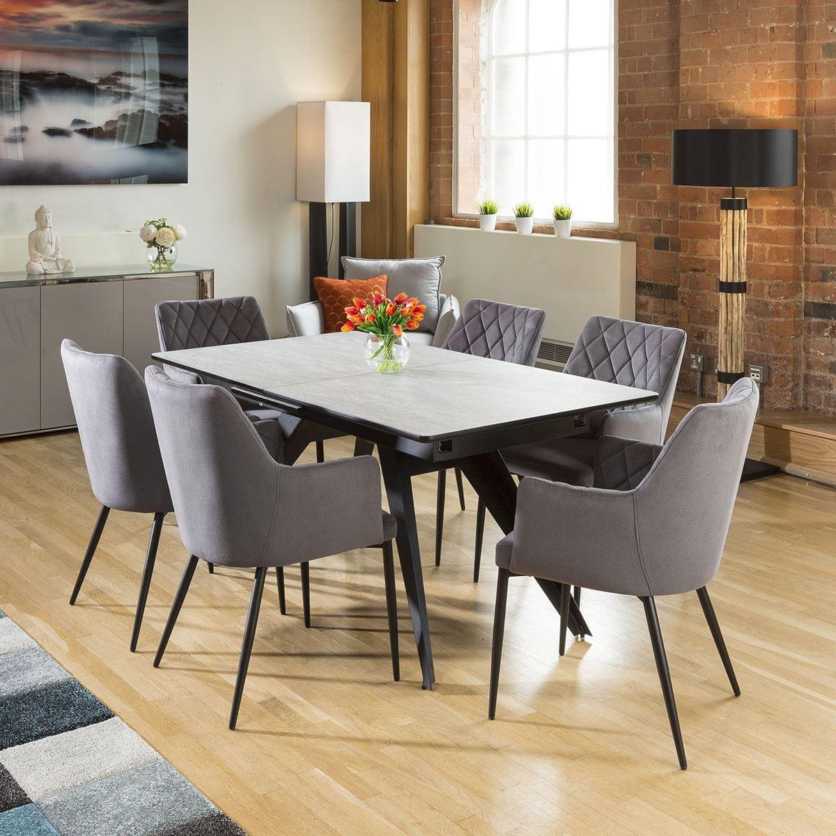 Palma Beige Stone Effect Round Dining Table and 6 Belgravia Black Leg Chairs - Grey