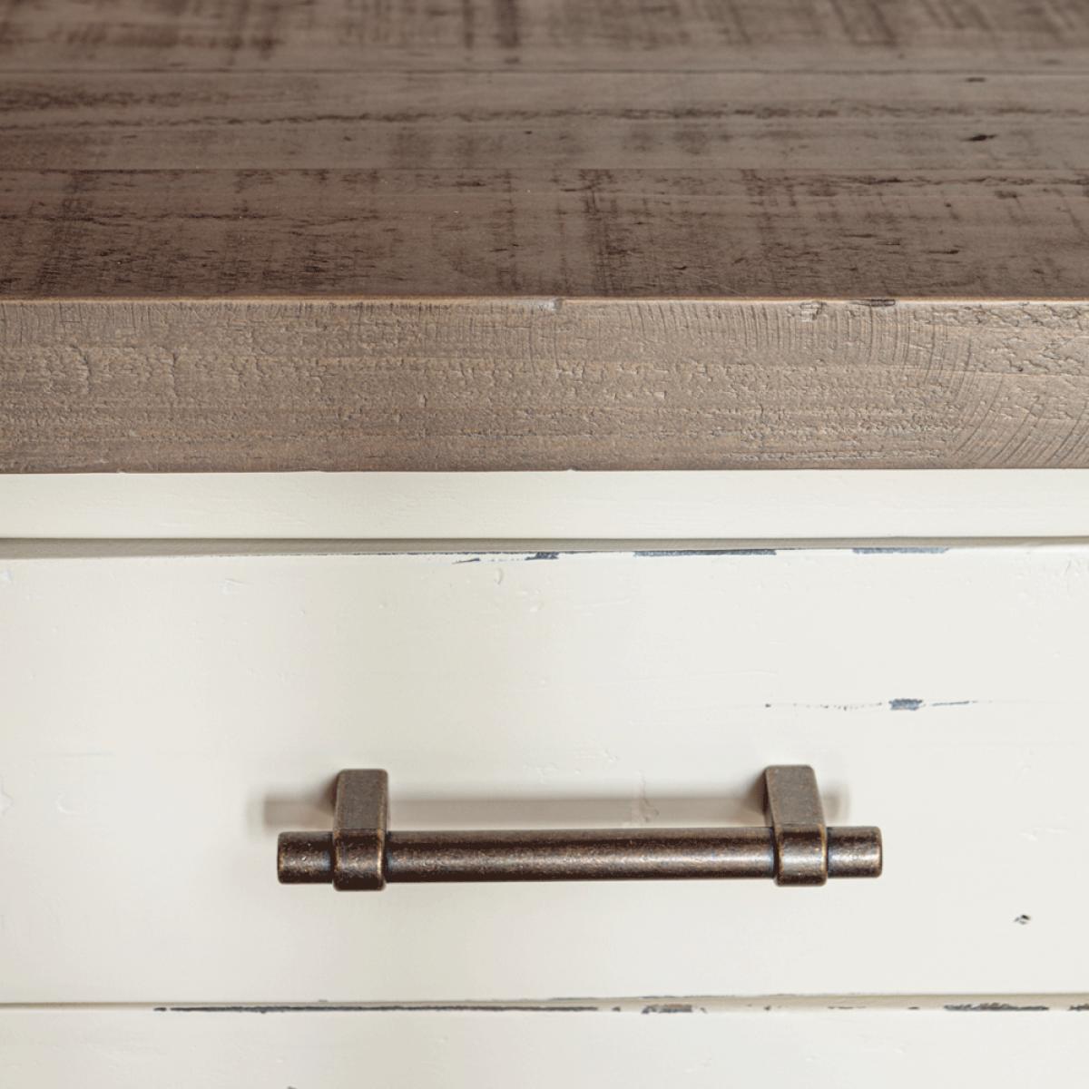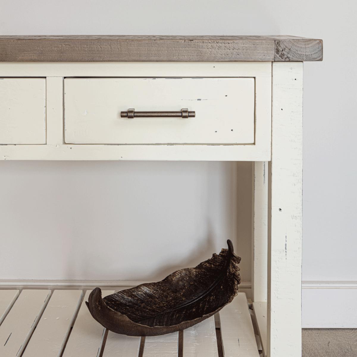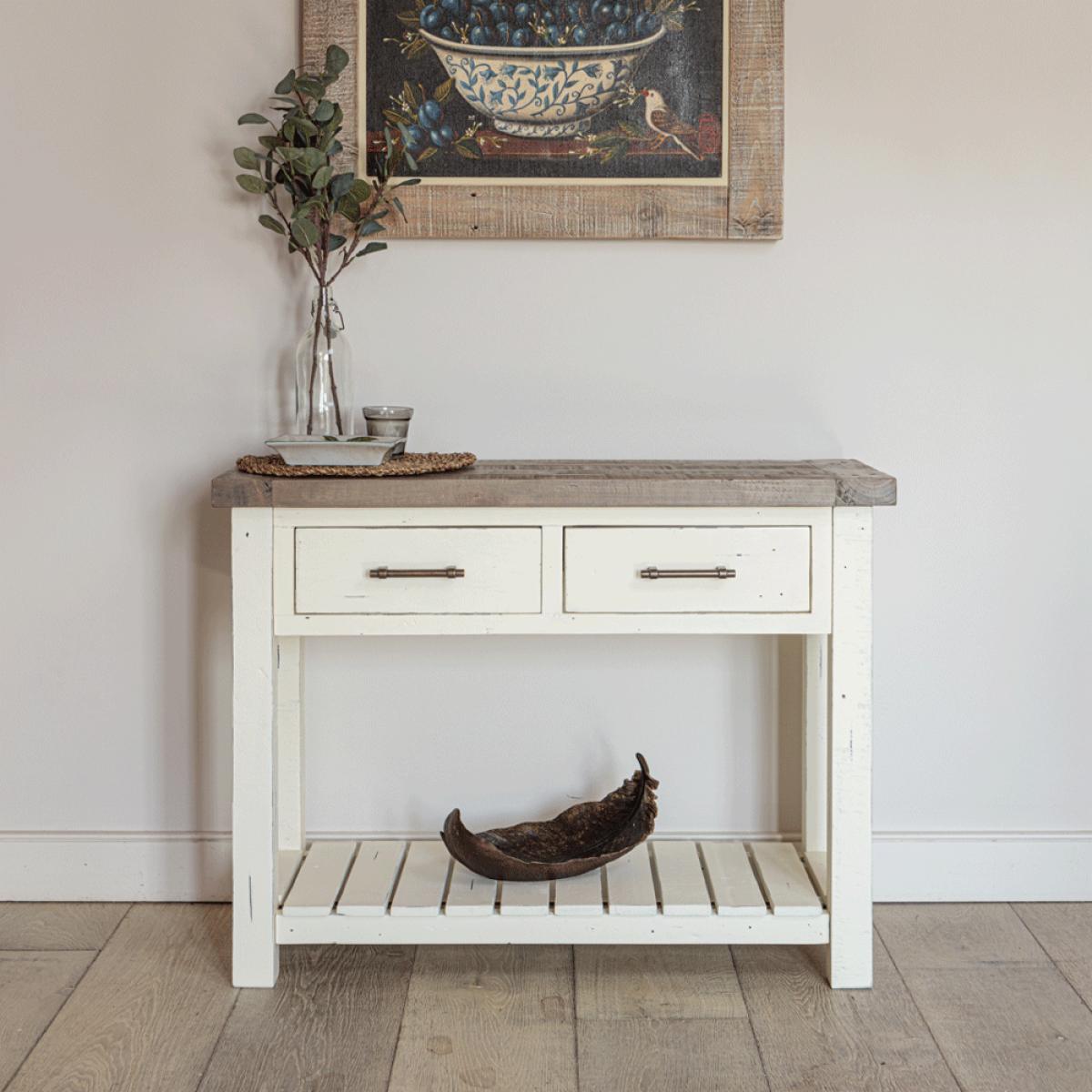 The Modern Farmhouse Console Table is a fantastic addition to any home. We think it is a charming and stylish console table that’s made entirely of reclaimed pine. The off-white of this chunky frame is pre-distressed in places giving it plenty of rustic charm, as seen with all of this range. A brown pine timber work top is similarly chunky and has been put through a washing process to display an appealing and varied unique surface. Two drawers mean small items and clutter can be stored out of sight whilst the shelf helpfully provides further storage. This fashionable console table would be fine to display singularly, but it also works splendidly with the rest of the Modern Farmhouse. Range.