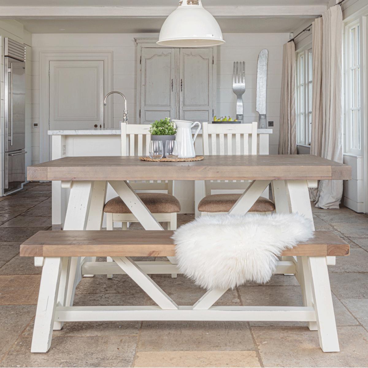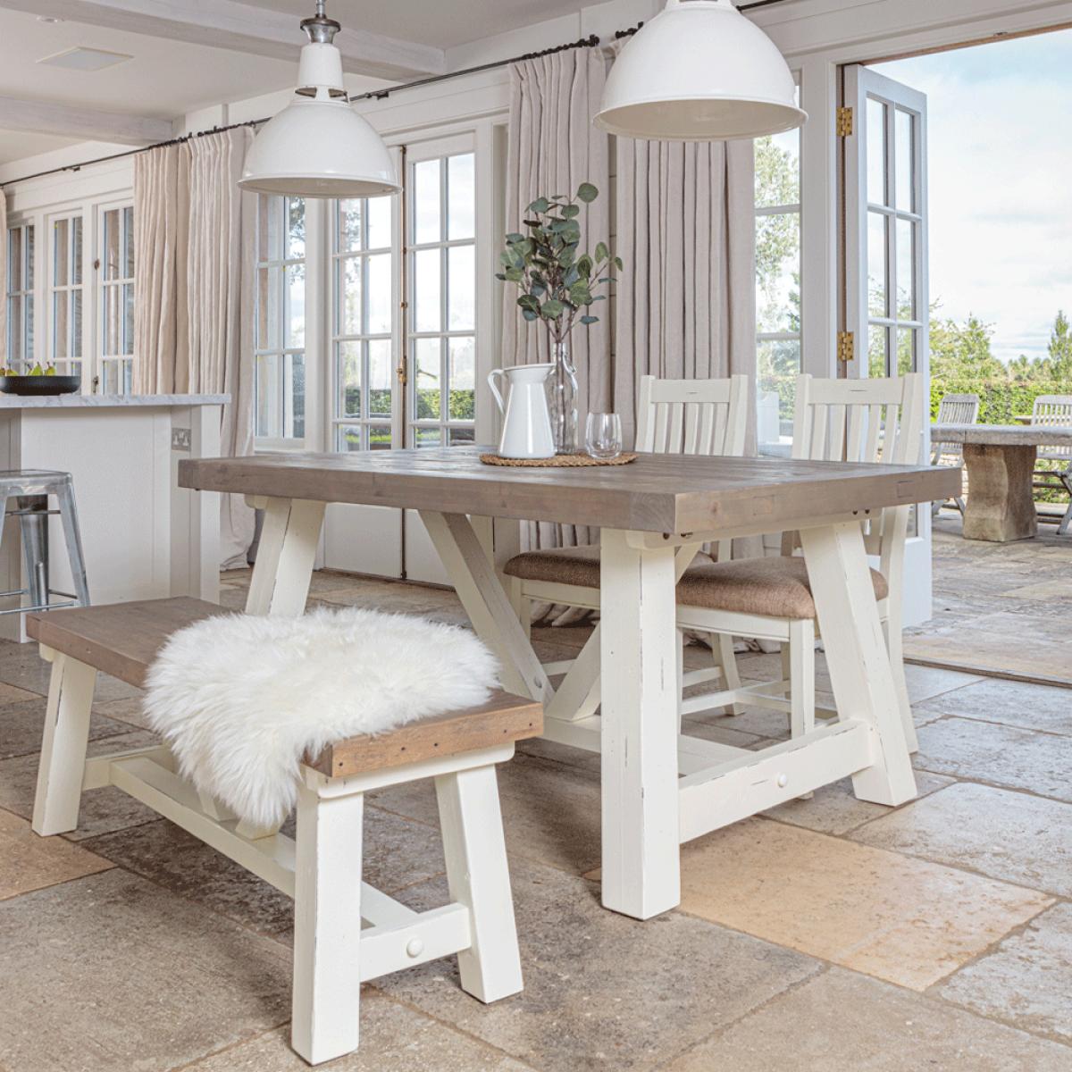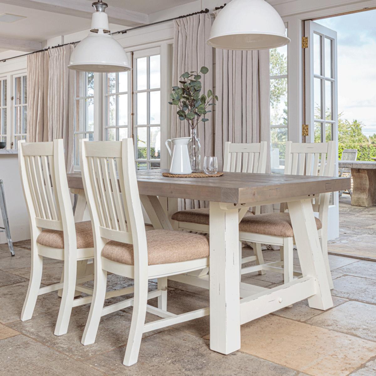 Free delivery on a day of your choice, within 3 – 5 working days!. Unlike many other extending dining tables, the extension for this table adds onto the end, rather than the middle, therefore not affecting the aesthetic of the table when non-extended. Central leaf extending dining tables, by their very nature, have a join running down the middle of the table’s top, which you don’t have on this set. To extend this table you simply slot in one or two extension leaves (. Sold separately. ) into the channels at either end and fasten underneath to secure. Benefit from a 10% saving by purchasing this table as part of a dining set. Like this style? Then check out the rest of the Modern Farmhouse Range. Here.