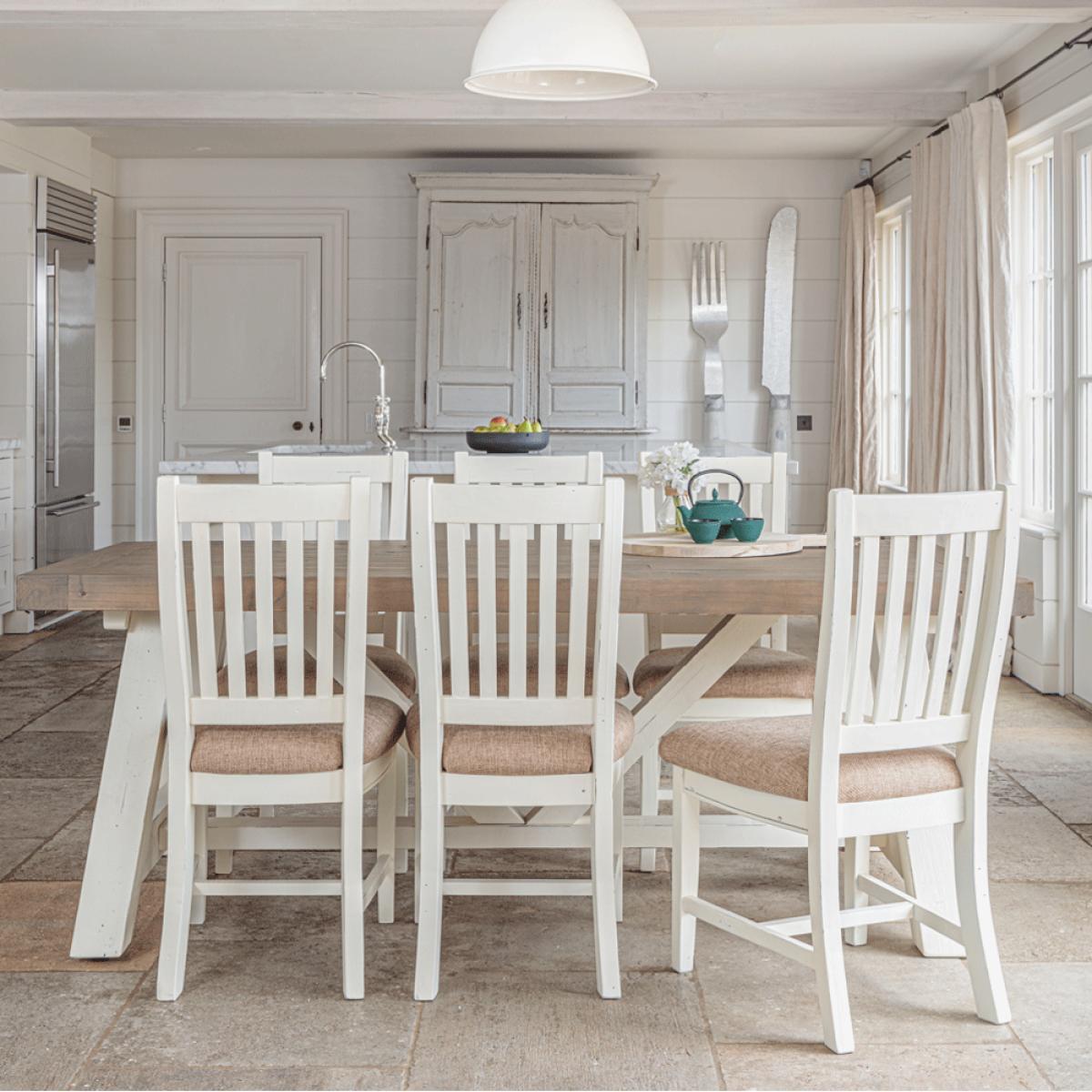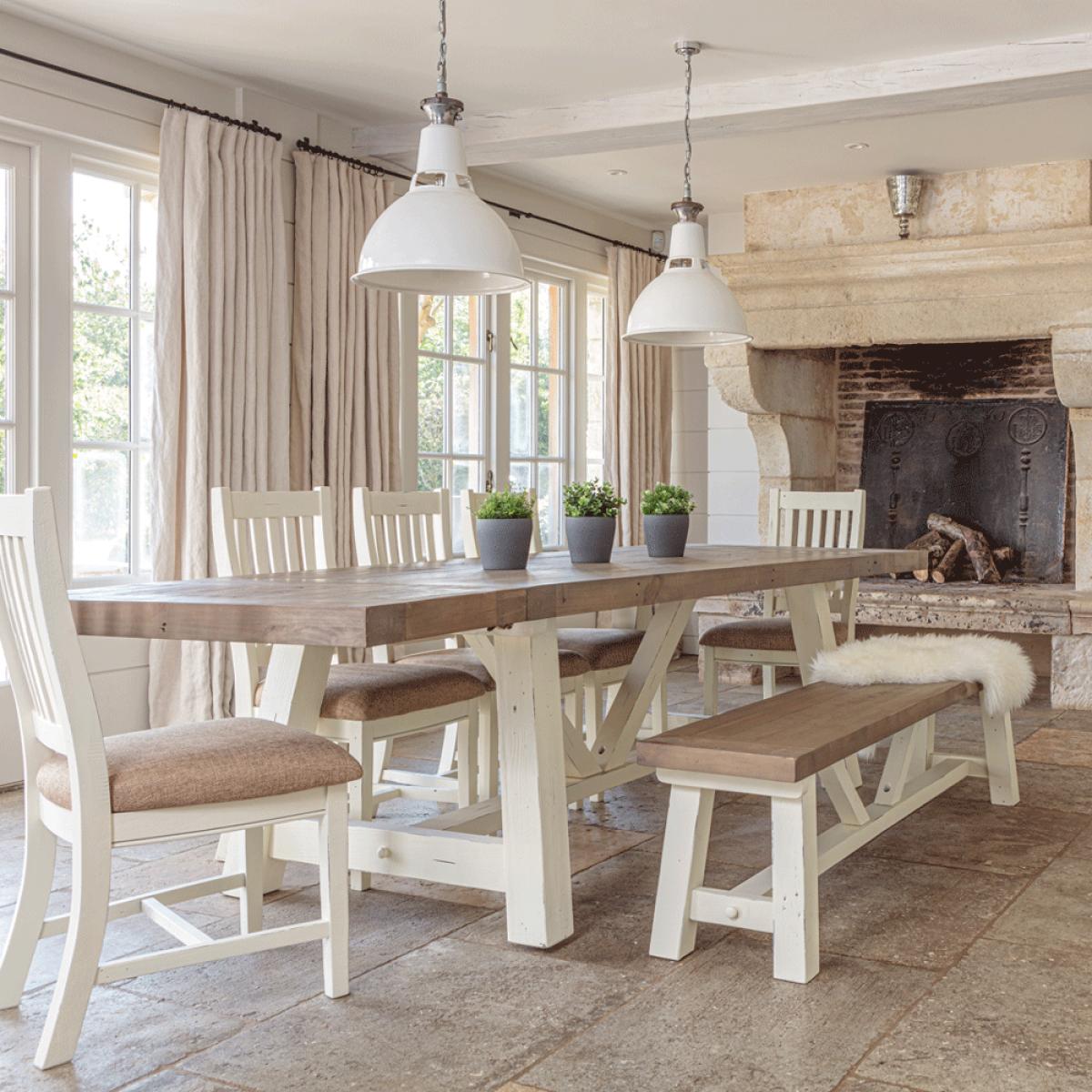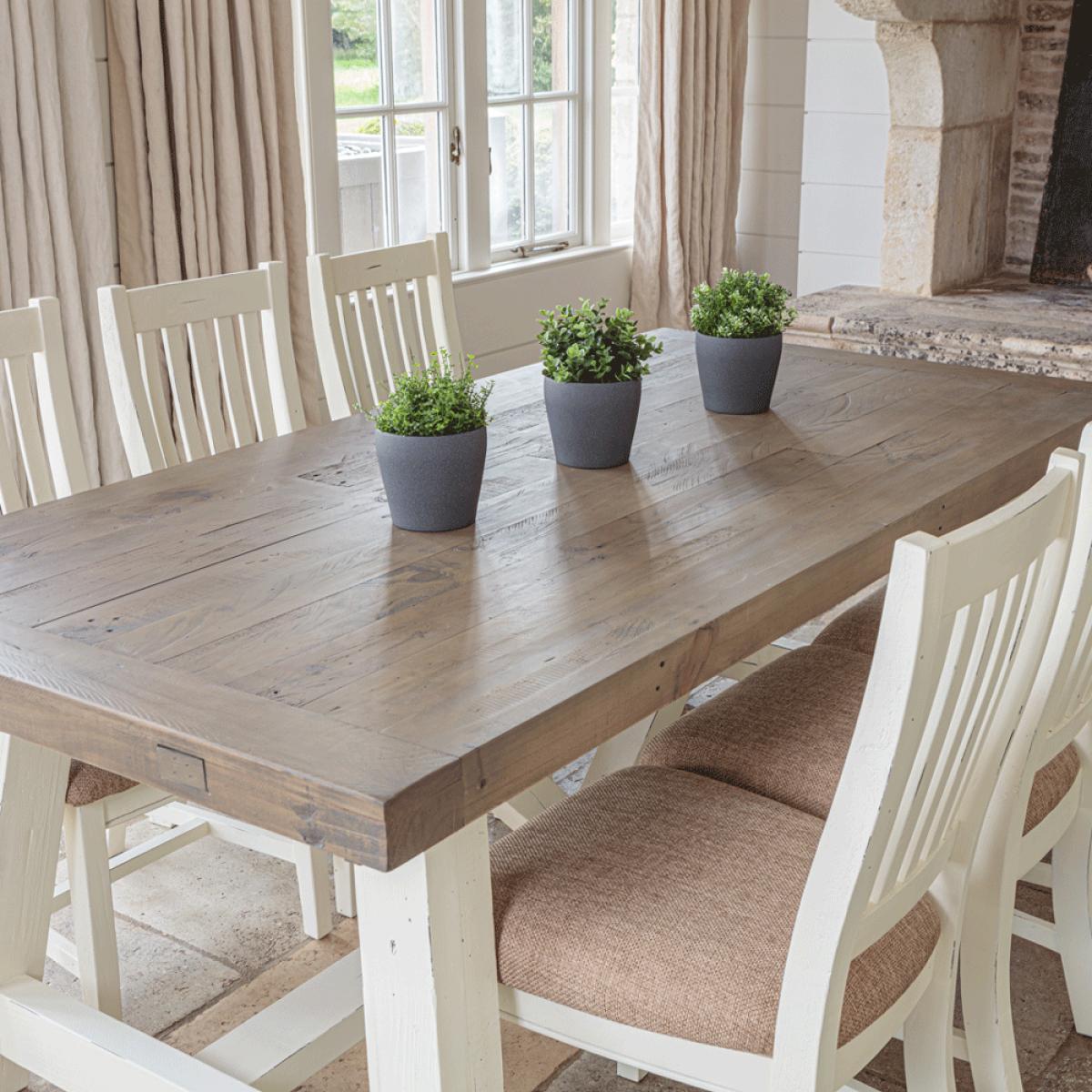 You have the option to extend this table from a 2m long table to 245cm (one extension leaf used) or 290cm (two extensions leafs used). This added flexibility is welcomed by many as it takes it from an 8 seater, to 10 and 12 seater, perfect for entertaining! Another benefit is that unlike many other extending dining tables, the extensions (. Sold separately. ) for this table adds onto the end rather than the middle, therefore not affecting the aesthetic of the table when non-extended. Central leaf extending dining tables, by their very nature, have a join running down the middle of the table’s top, which you don’t have on this set. To extend this table you simply slot in one or both of the extending leaves into the channels at either end and fasten underneath to secure. Discount available if purchased as part of a dining set. Why not check out some of the other products available in the. Modern Farmhouse Range.