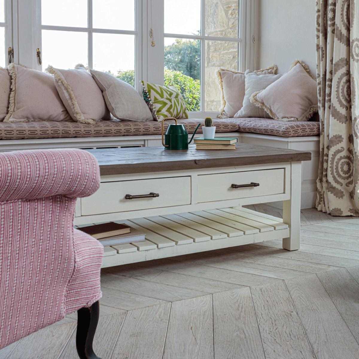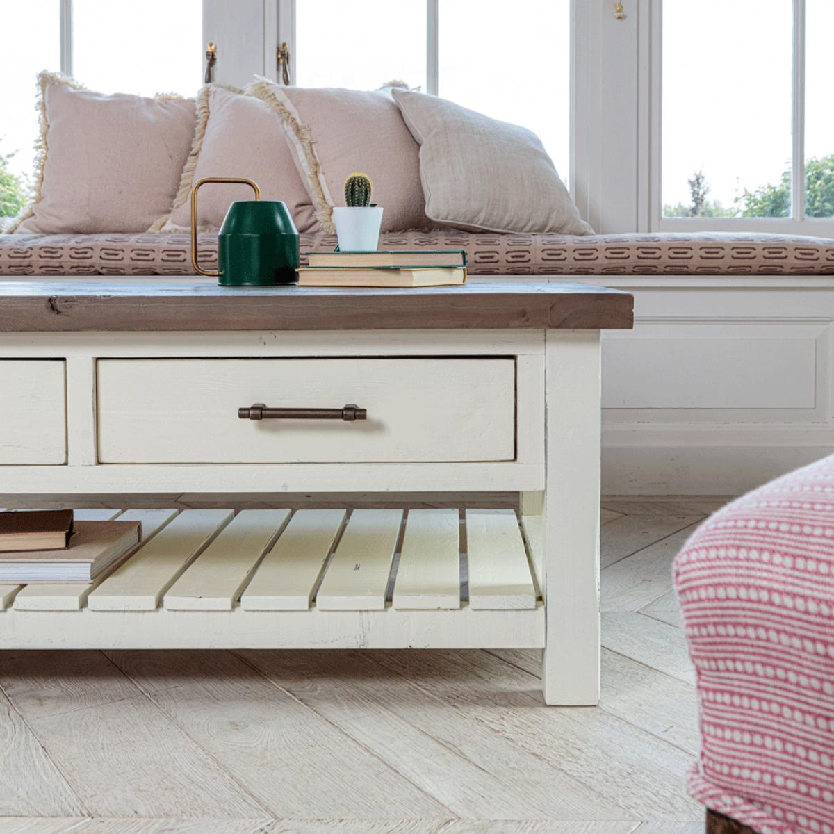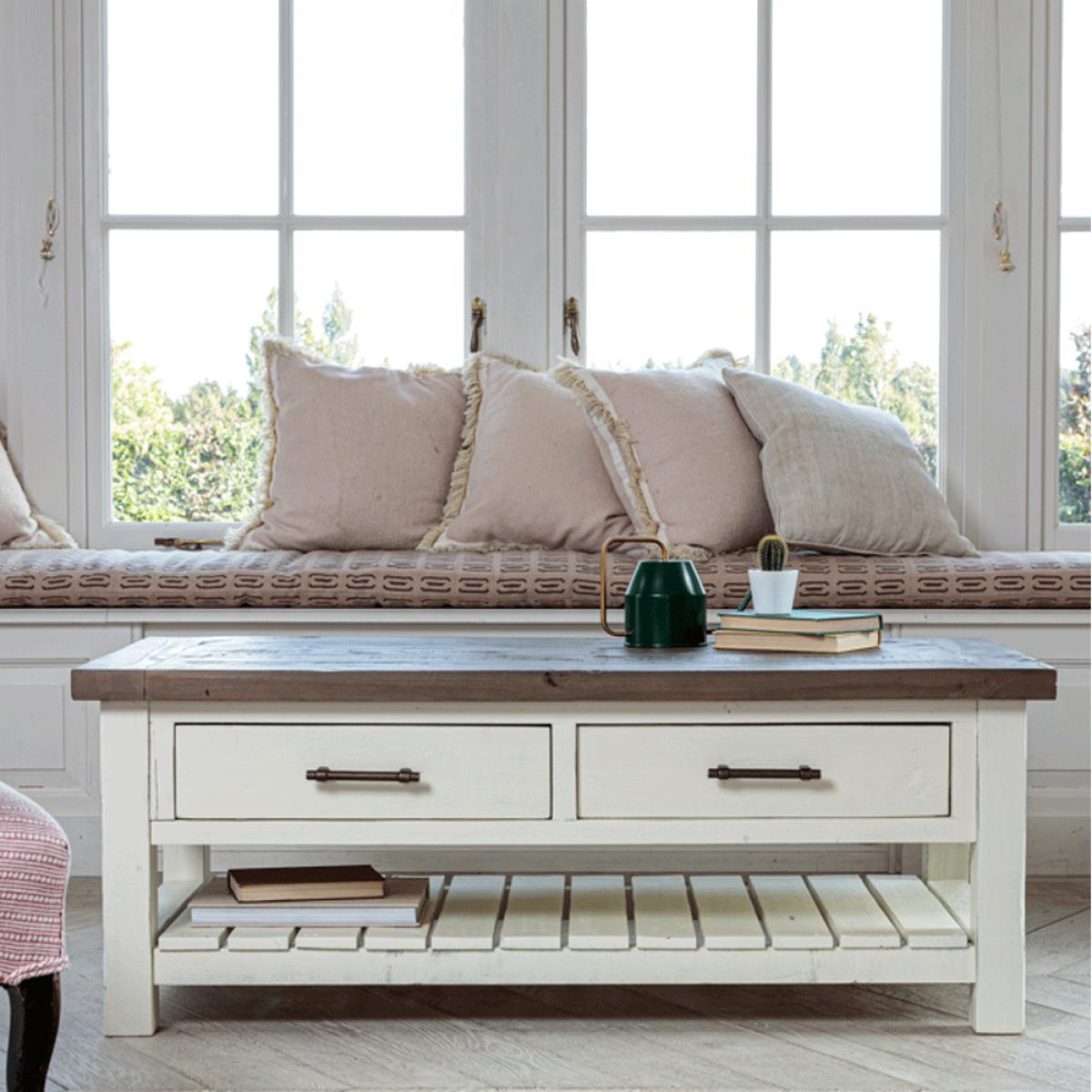 Introduce an air of country home appeal to your space with the Modern Farmhouse Coffee Table. Substantial and chunky reclaimed pine makes up this coffee table, a base that’s off-white has been purposely pre distressed. This living room table effortlessly exudes a rustic warmth but is also very practically suited, too. Two drawers offer ample storage for household clutter and a lower shelf provides space for magazines, books and home-tech within easy reach. We think it sits great on its own, but also nicely suits the entire Modern Farmhouse. Collection.