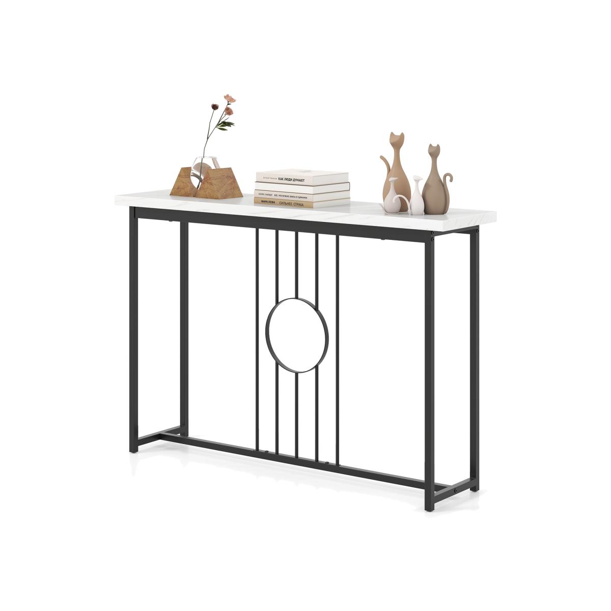 This elegant side table features a faux marble top and gold metal legs. Thanks to its extra-wide top, it offers plenty of space for your belongings, whether it's bags, keys, vases or picture frames. The table features a sturdy metal frame and a smooth, water-resistant MDF top to ensure durability and easy maintenance. The anti-toppling devices and adjustable foot pads add stability and security to the console.