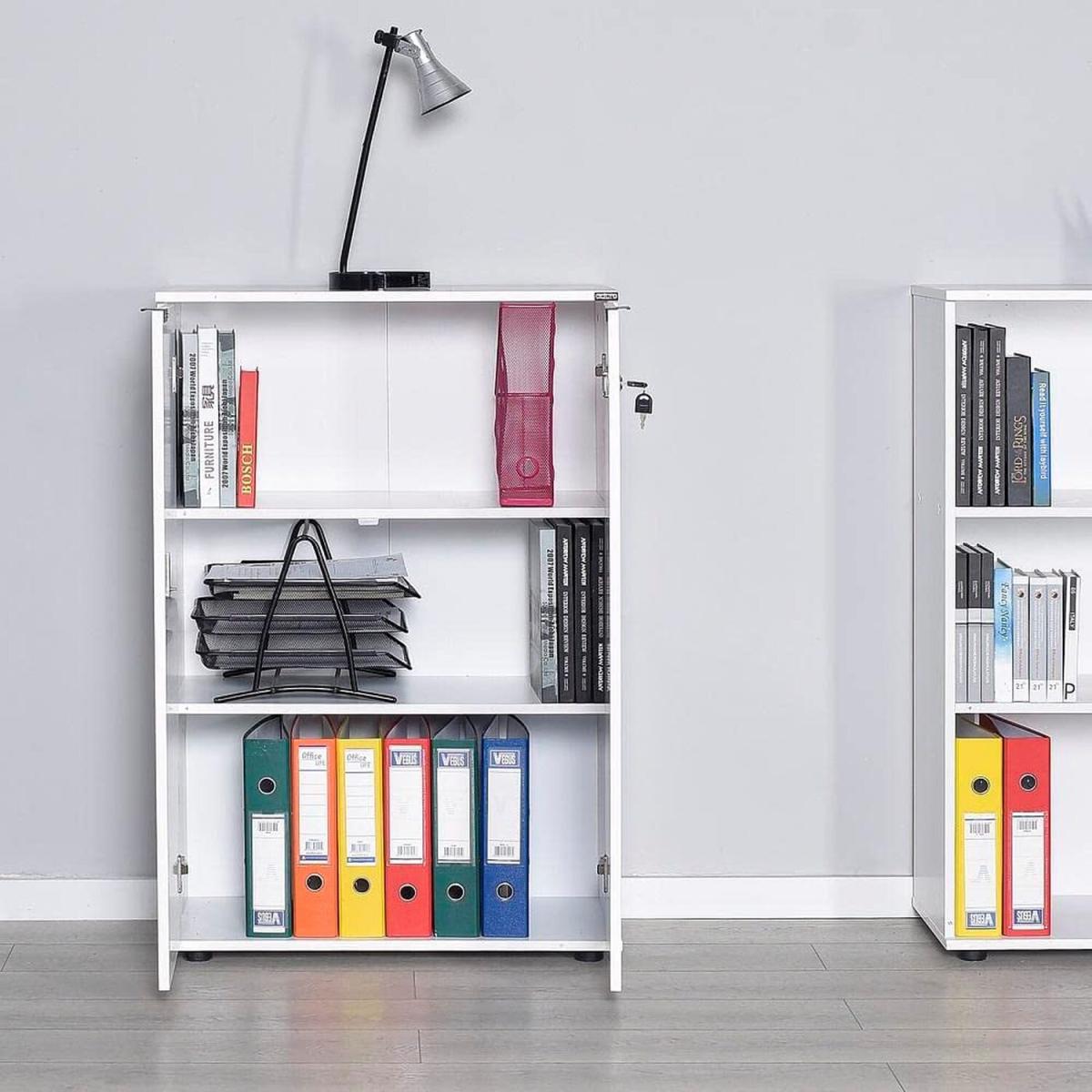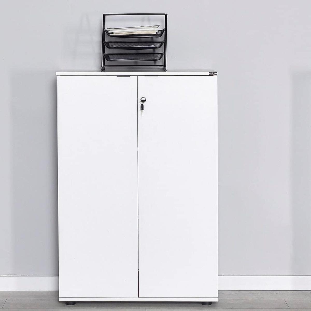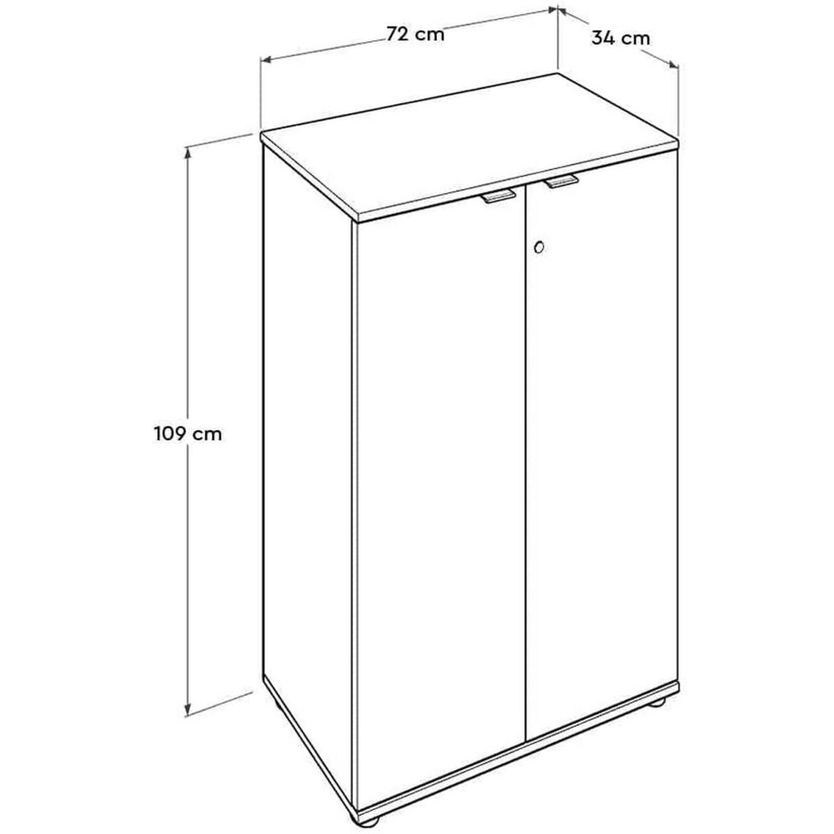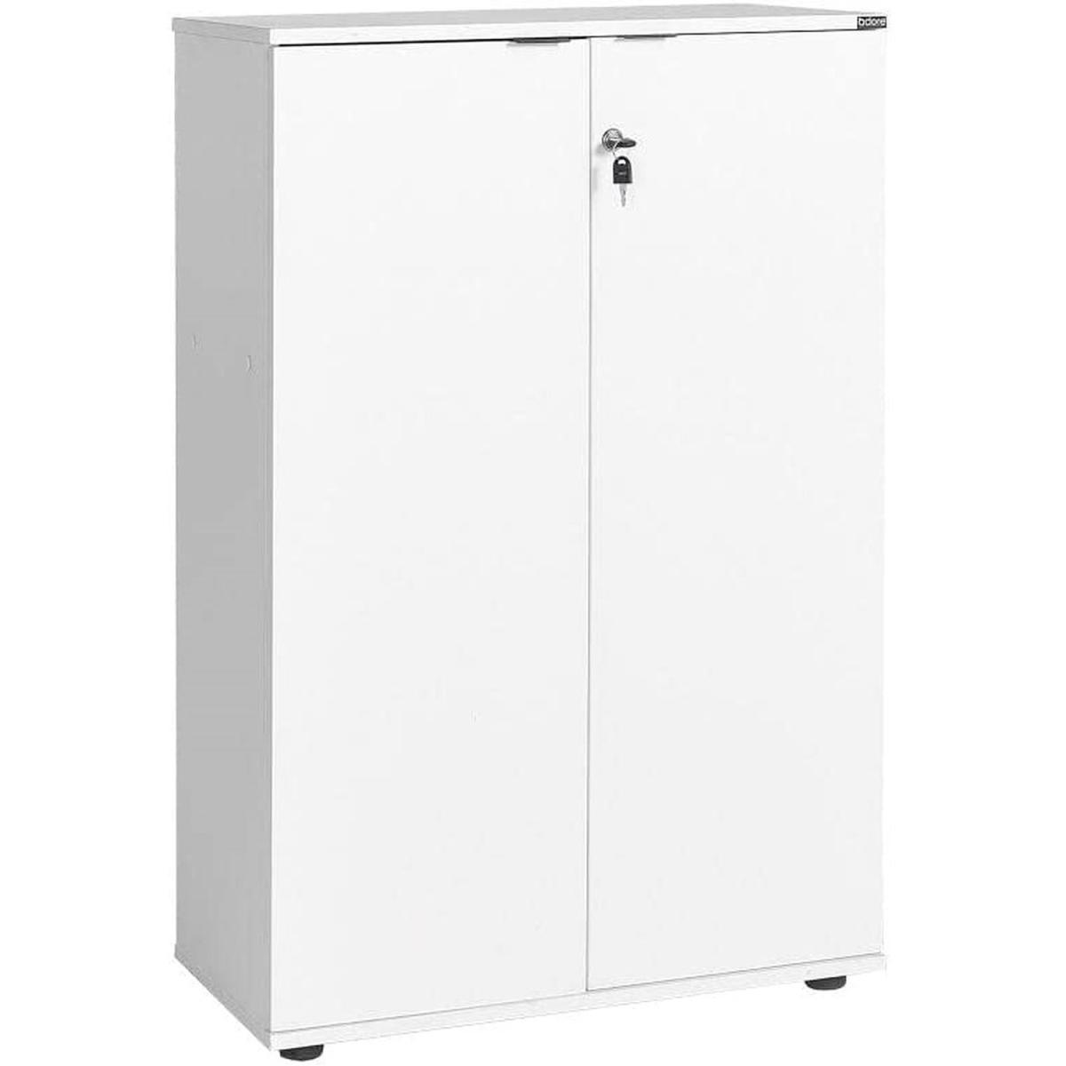 Finished in a durable matt white- this home office filing cabinet has 3 internal shelves and lockable doors (supplied with 2 keys). Great for keeping your home office space tidy with the added privacy of being able to lock away your files. The shelves will accommodate standard A4 folders. Part of our Rio Home Office Collection- this filing cabinet will compliment the mobile cart and corner desk from the same range. Delivered flat pack in 1 box for self-assembly. Once assembled- this matt white finish office storage cabinet will measure 72cm wide by 109cm tall and 34cm deep.