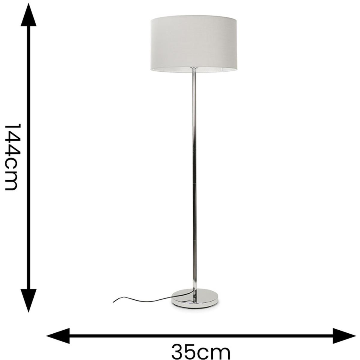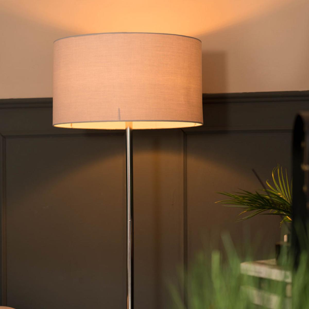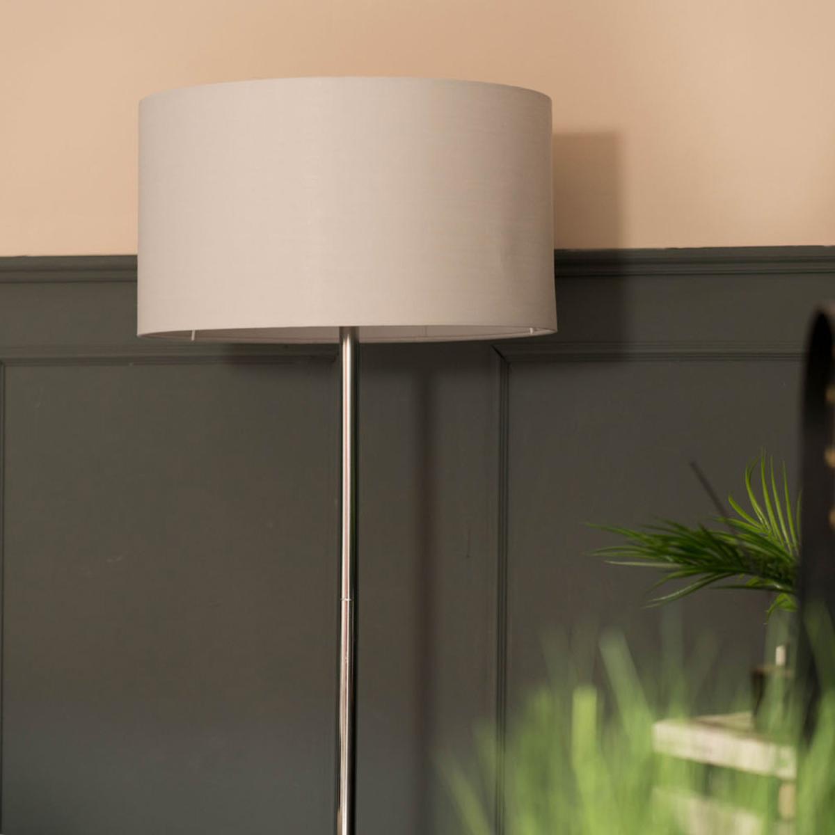 Modern standard tall stem floor lamp in a polished chrome finish, complete with a with a grey drum shade. This contemporary floor lamp is guaranteed to make a statement in any home. Floor lamps are a great way to bring additional lighting to a room - perfect for hallways, bedrooms, lounges, living rooms and offices.