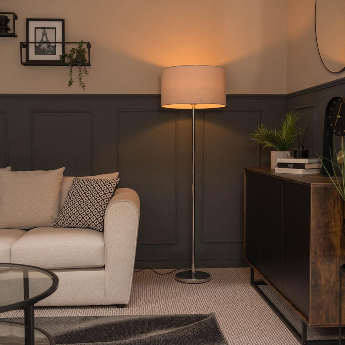 This modern floor lamp in polished chrome with a grey drum shade is a sleek, versatile choice that complements a wide range of interiors, from contemporary to minimalist spaces. I love its clean lines and reflective finish, which add a touch of sophistication without overwhelming a room. It works particularly well in living areas, reading nooks, or bedrooms where a soft, diffused light is preferred. For styling tips, position it beside a statement armchair or sofa to create a cosy corner, and pair it with other metallic accents or muted colour schemes to keep the look cohesive. The grey drum shade is a great neutral that balances well with both cool and warm tones, making it a timeless addition to your decor.