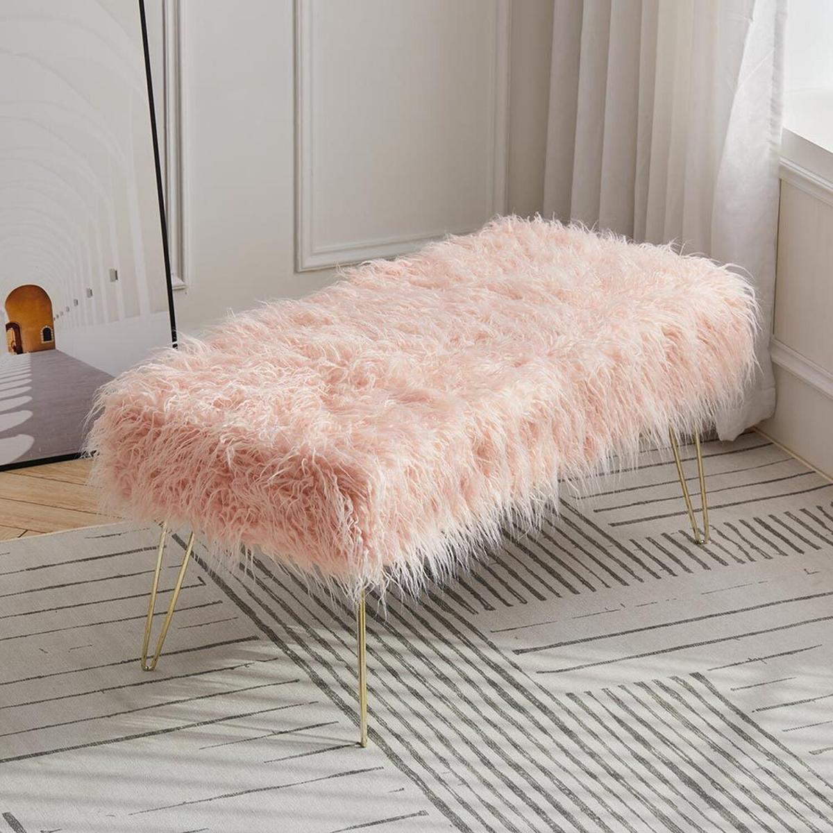Our modern fluffy bench pouffe stoolstands on golden chrome legs, which not only has excellent stability but also adds to the modern and elegant style of the chair. This bedroom bench decorated with soft and comfy faux fur,which will add cuteness to your room. You can feel physical and mental relaxation when sit on this fur bench watching TV or reading.