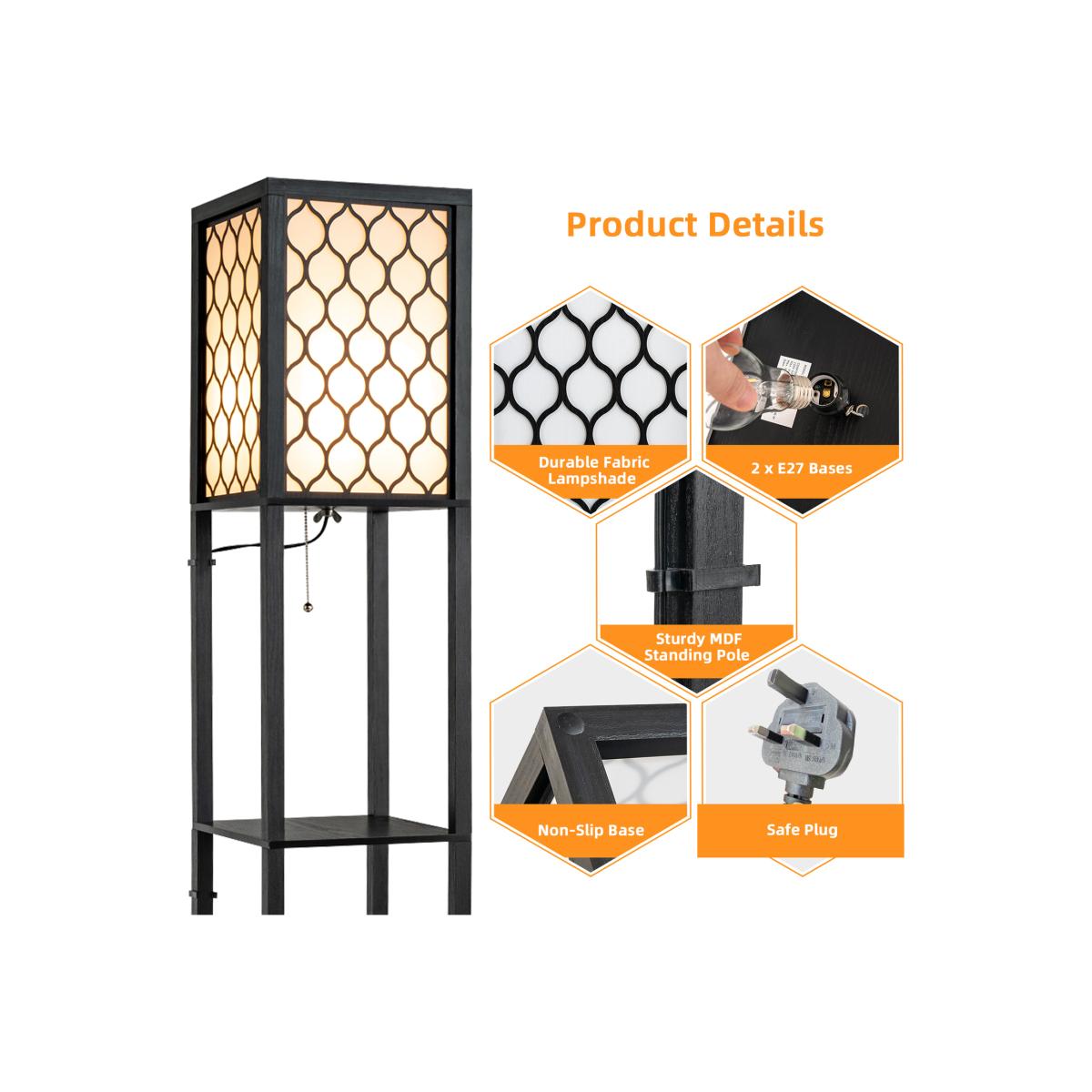 This shelf floor lamp will not only brighten up your living space, but also make your room well-organized. The unique double-lamp design with wide lighting range provides a more comfortable relaxing or working environment for you. And the high-grade lampshade softens the light to create a warm and cozy atmosphere. Also, the operation is quite simple with the foot switch and pull chain switch. You can choose to turn on both two lamps or just use the lower lamp at your preference. Moreover, made of premium wood material, the shelf floor lamp can withstand long-term use. And you can put several daily items on the shelves for easy reach. If you are looking for a multifunctional floor lamp, our shelf floor lamp will be a perfect choice.