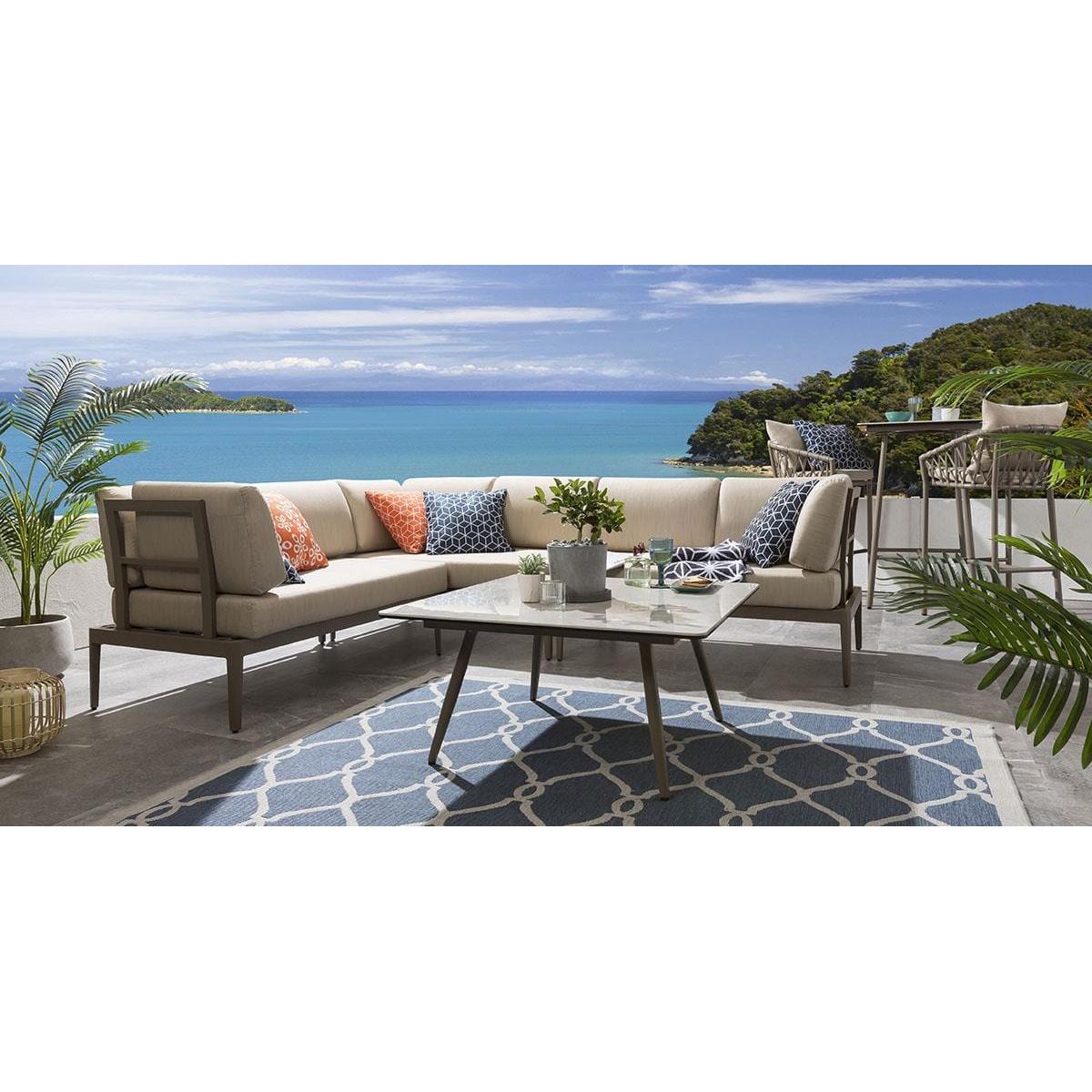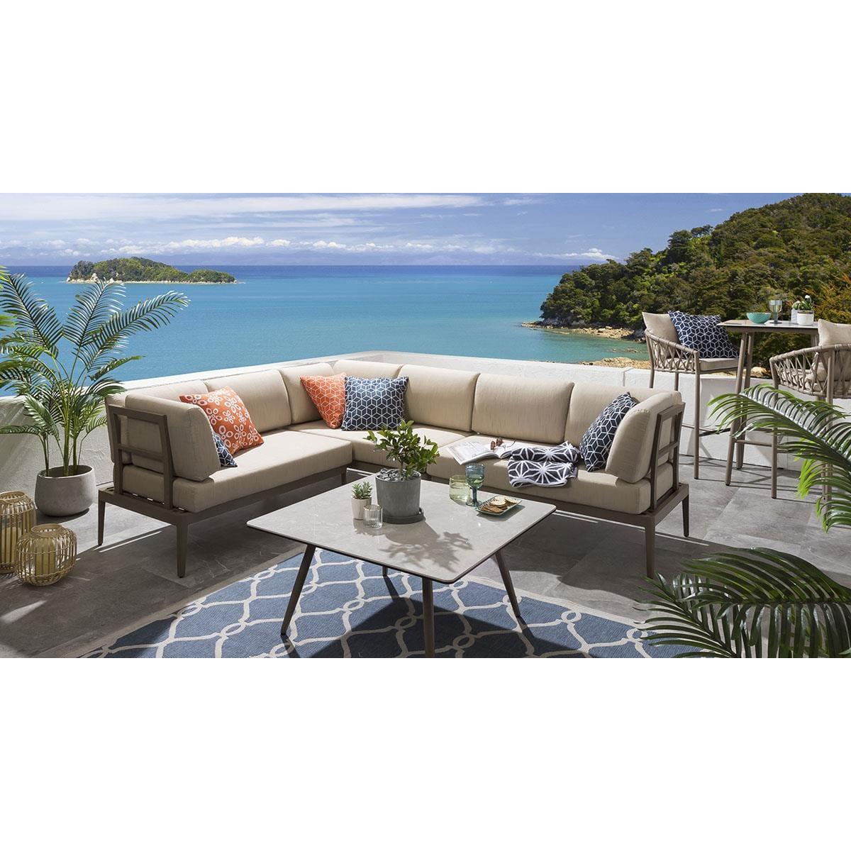 It's the perfect compact beige garden sofa for smaller gardens - including three simple sections that come together to form a luxury 6 seater garden sofa that can be configured in a straight, left or right-hand layout depending on your space. This set also comes with a ceramic coffee table. Our clever Ada Modular Corner Sofa will make a stunning addition to your outdoor seating area or patio. The small garden corner sofa comes complete with our signature luxuriously thick cushioning that offers unbeatable comfort, topped off with rich Beige high-end marine fabric which has amazing resilience to colour fading and damage caused by extreme weather conditions and also a free winter cover. Expertly crafted aluminium frames are highly durable, complemented by clean lines that lend contemporary style. It is robust and weather-resistant for outdoor use & the firm-cushioned seating offers comfortable support that's shower-resistant, but we advise that cushions are stored when not in use. If you need more information about this product, use the Live Chat service to speak to the team or send us a message. Spread the cost our with interest-free finance options. Minimum spend applies. W250cm D200cm H81cm 6-Seater Beige Garden Corner Sofa - Modular Design For Your Outdoor Space Set includes 3 reversible sofa sections and a coffee table