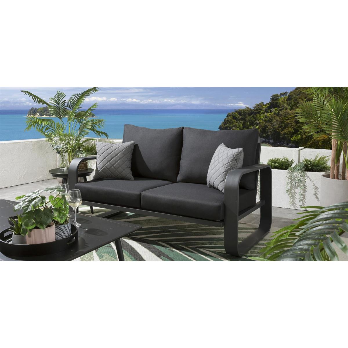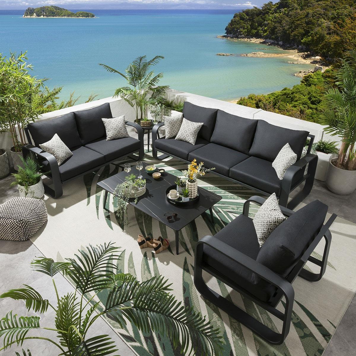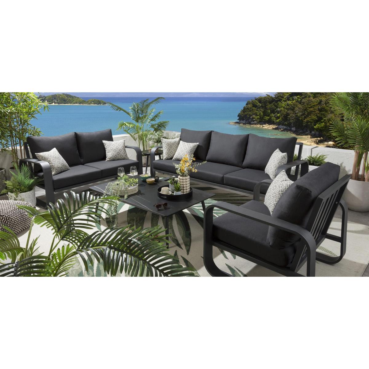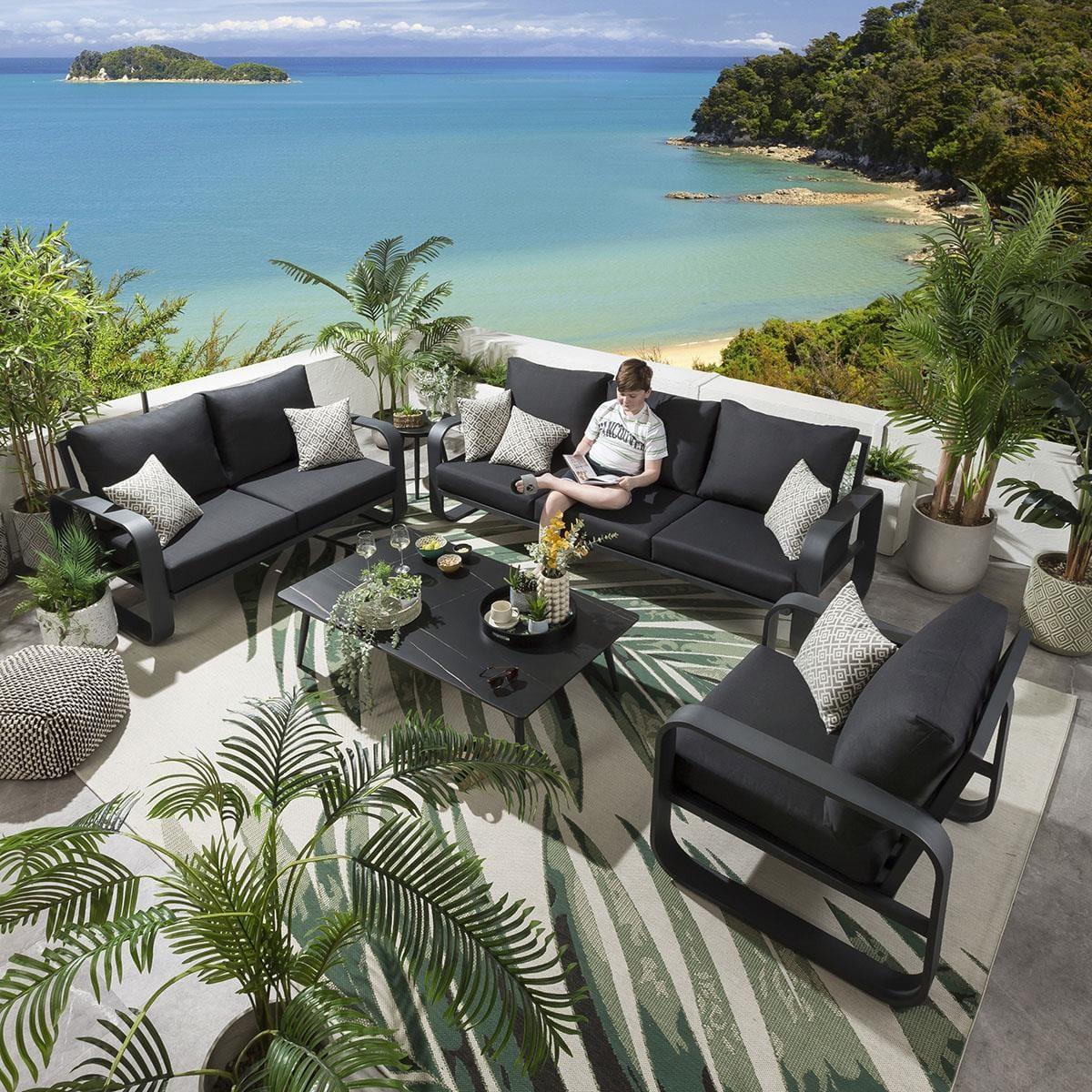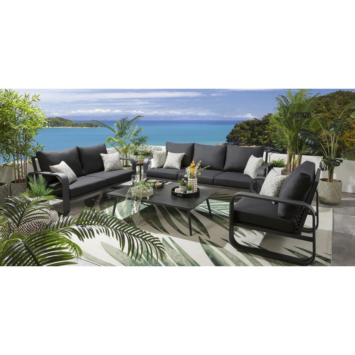 Not only does the Quatropi Freddy ultra modern Garden Sofa Range look great, but it is also designed to withstand the elements, making it ideal for outdoor use. The deep, soft cushions provide maximum comfort, while the oversized aluminum frame ensures durability and stability. The dark grey aluminium frames and cushions offer a dramatic and contemporary look to any outdoor space, If you need more information about this product, use the Live Chat service to speak to the team or send us a message. Spread the cost our with interest-free finance options. Minimum spend applies. W380cm D225cm H84cm 5 Year Warranty Set contains 1 x 3 seater, 1 x 2 seater, 1 x armchair, 1 x coffee table